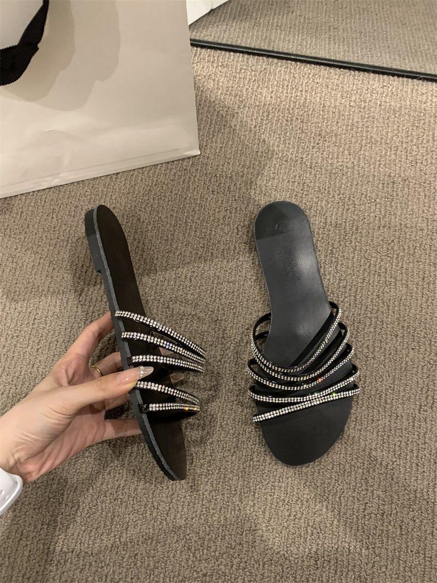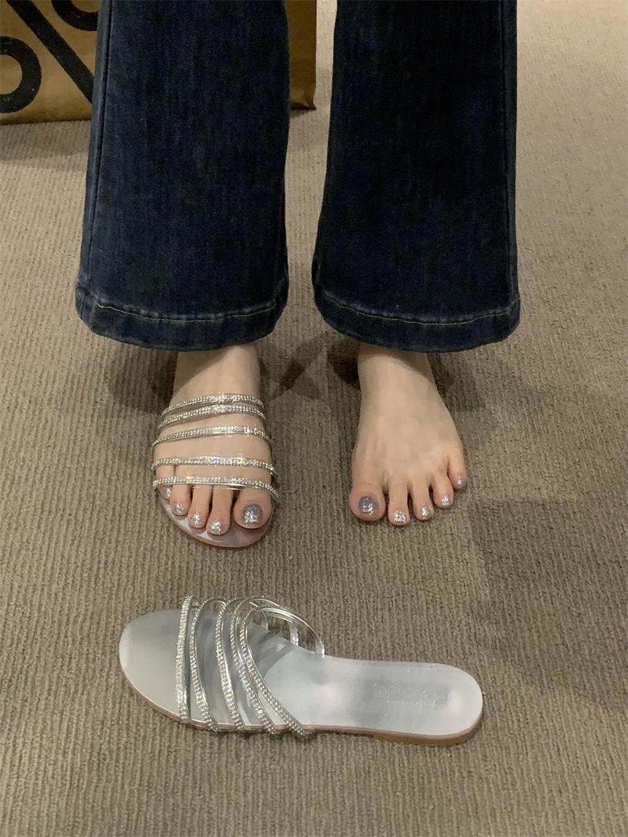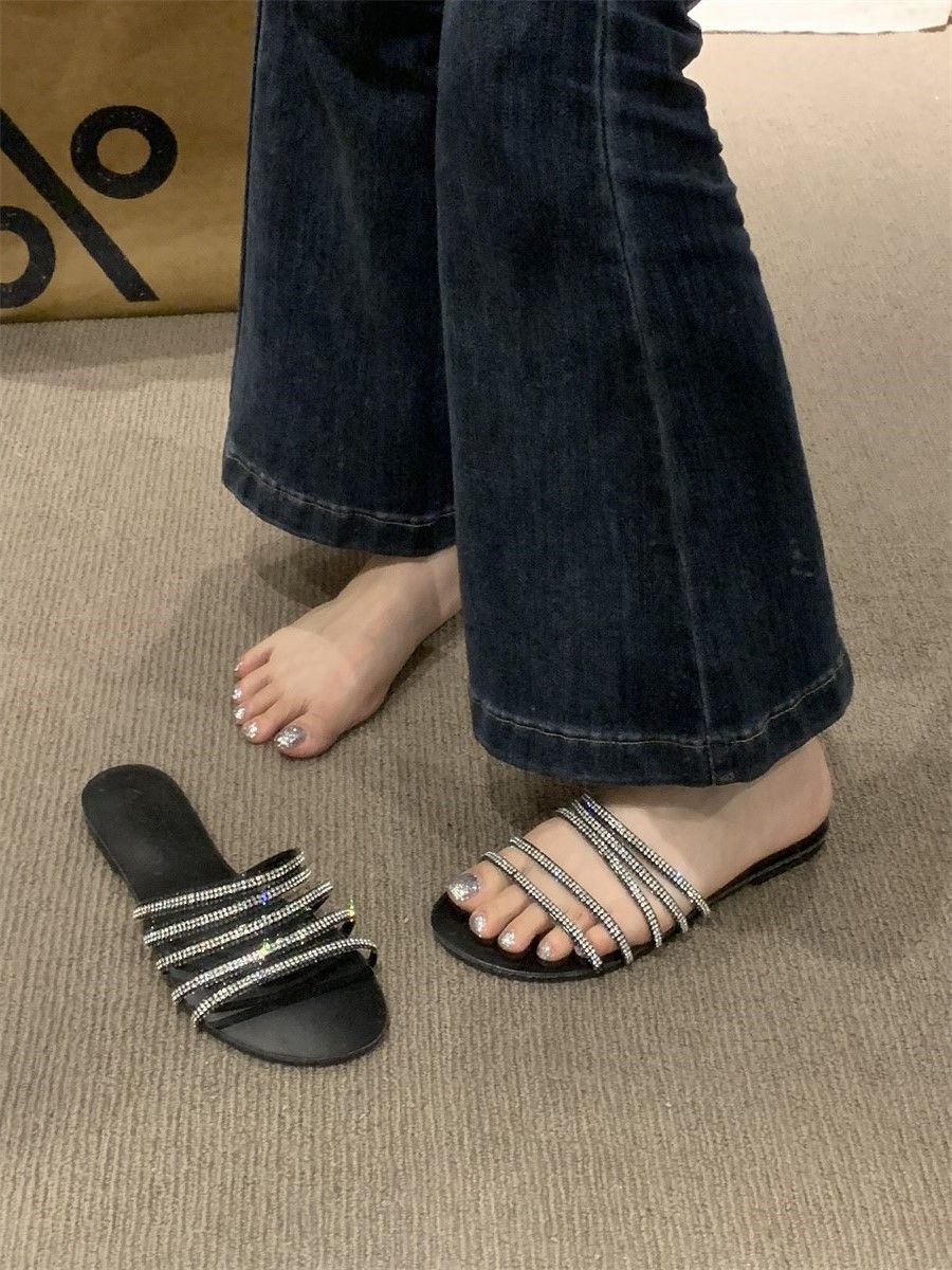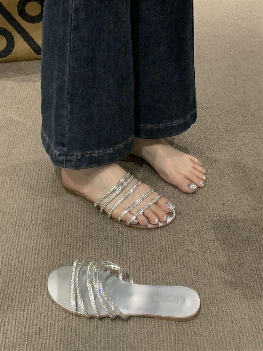 Sandalias de temperamento de moda estilo hada de suela blanda 2025 nuevas zapatillas planas de una tira zapatos de mujer verano para exteriores