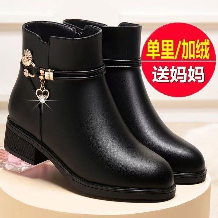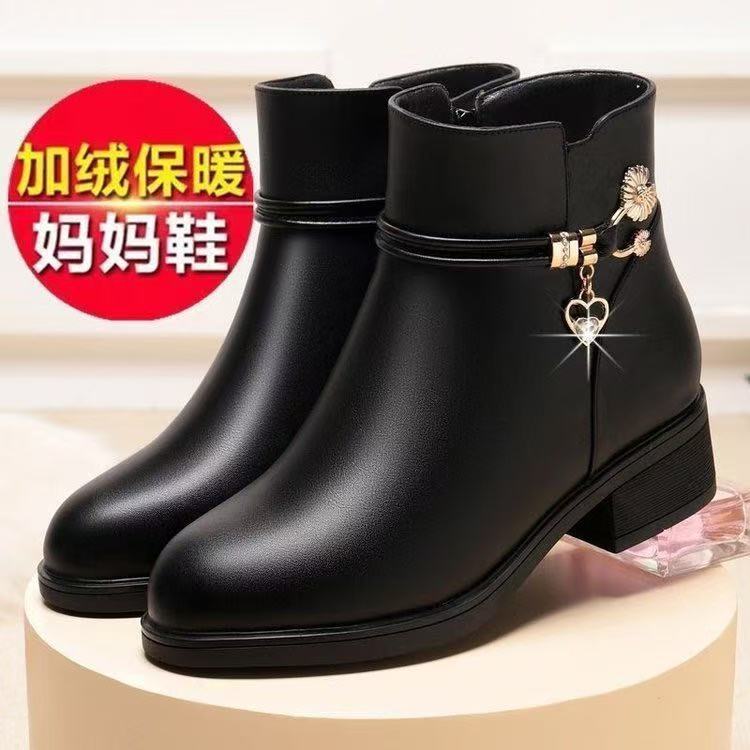 Zapatos de algodón para mamá para mujer invierno nuevo estilo más terciopelo cuero suave suela suave botines botas individuales cálidas antideslizantes mediana edad y ancianos cuero botas de algodón