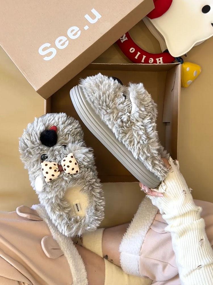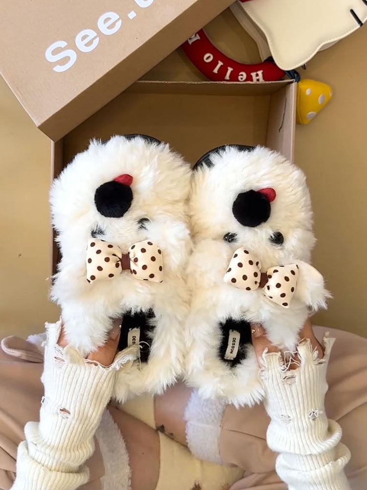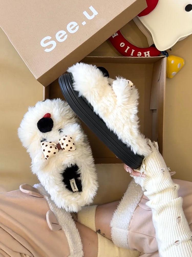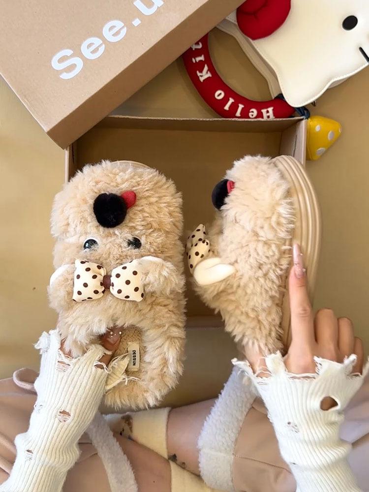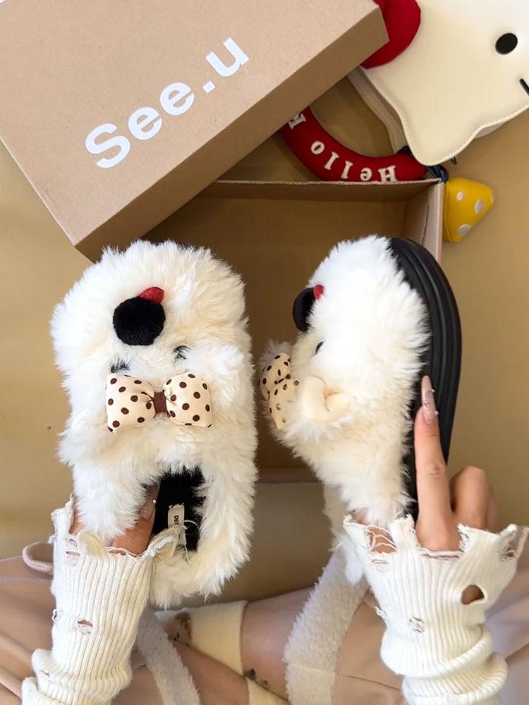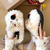 Pantuflas Casuales Versátiles de Suela Gruesa para Exterior de Mujer 2025 Otoño e Invierno Nuevas Pantuflas Lindas con Lazo y Cachorro de Piel