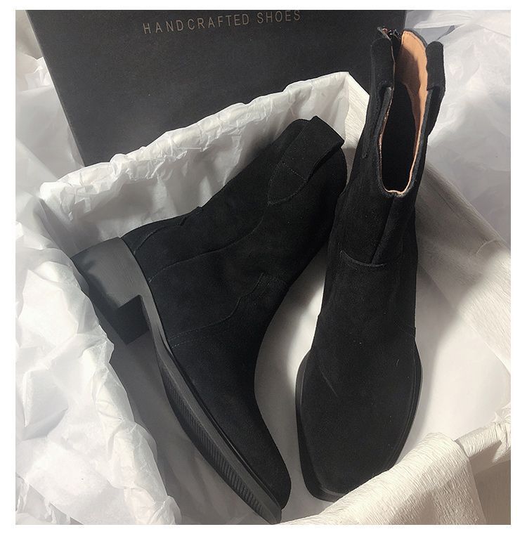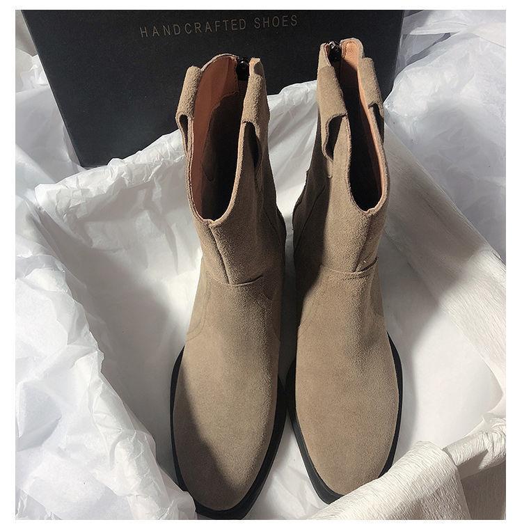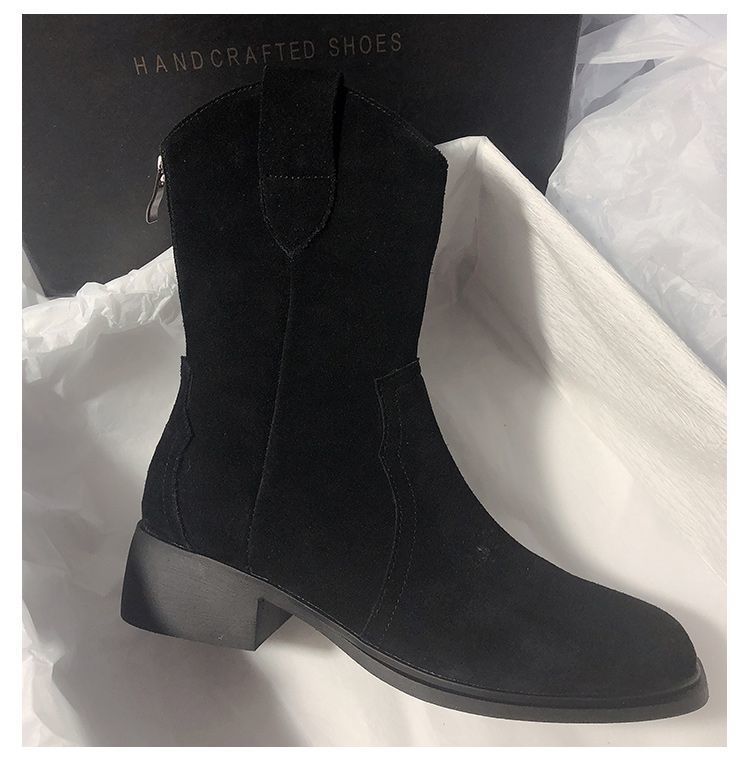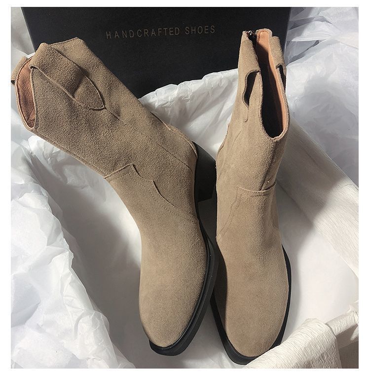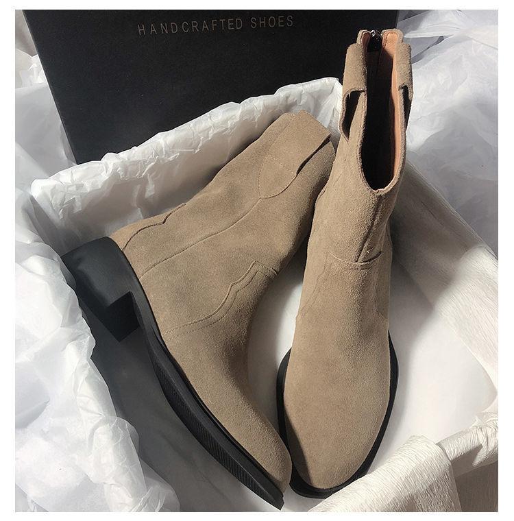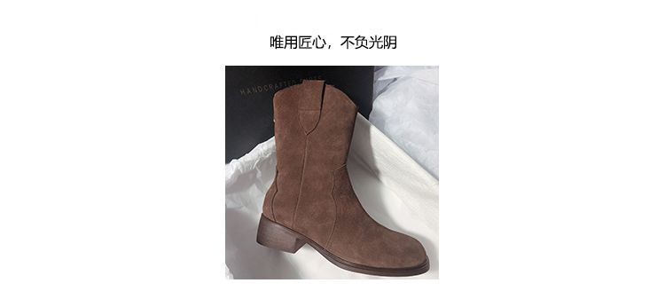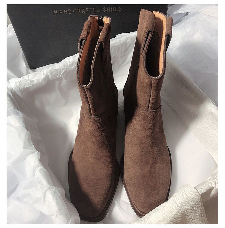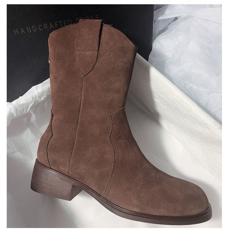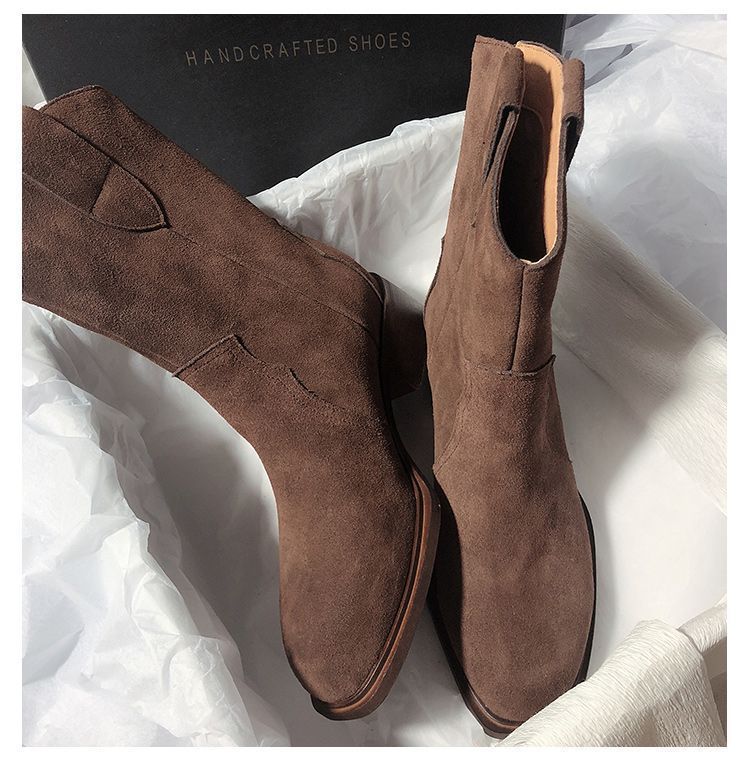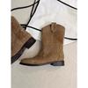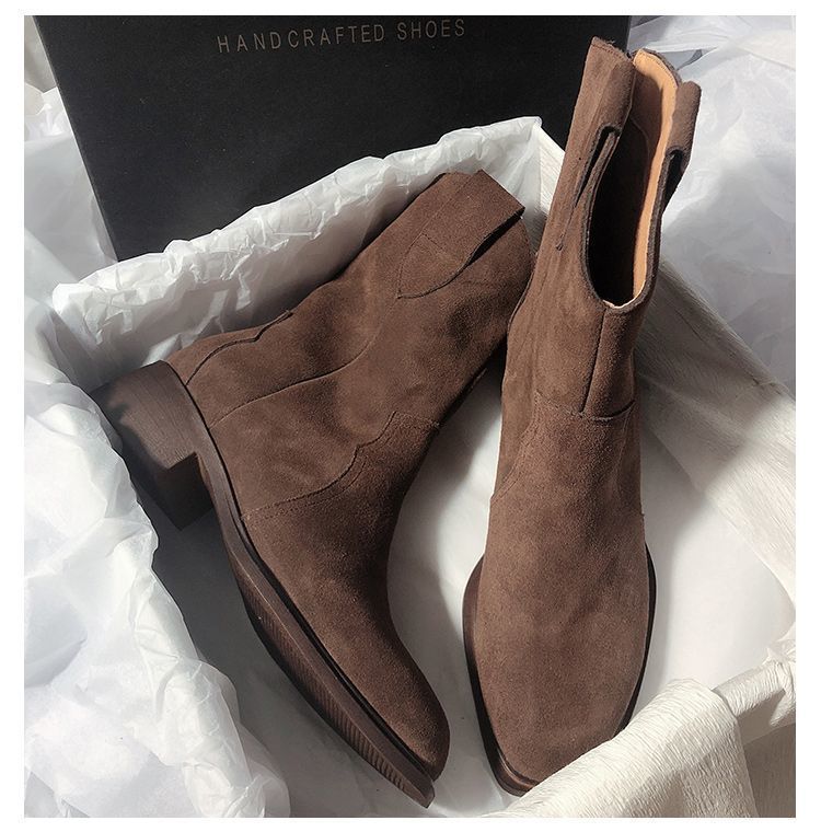 Botas Vaqueras Occidentales de Gamuza Botas de Media Caña 2025 Otoño/Invierno Nuevas French Myllard Marrón Vintage Tacón Bajo Botines Mujer