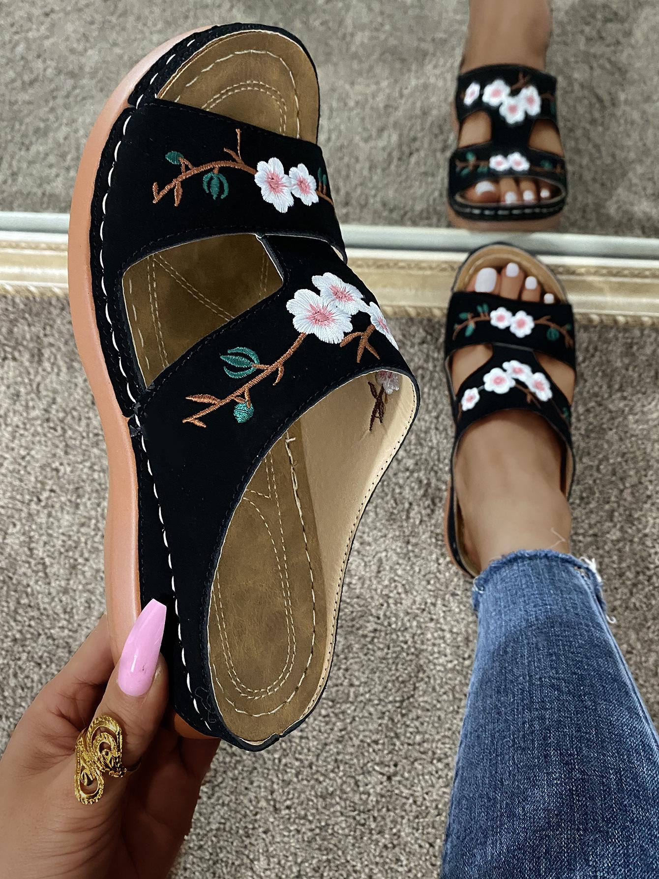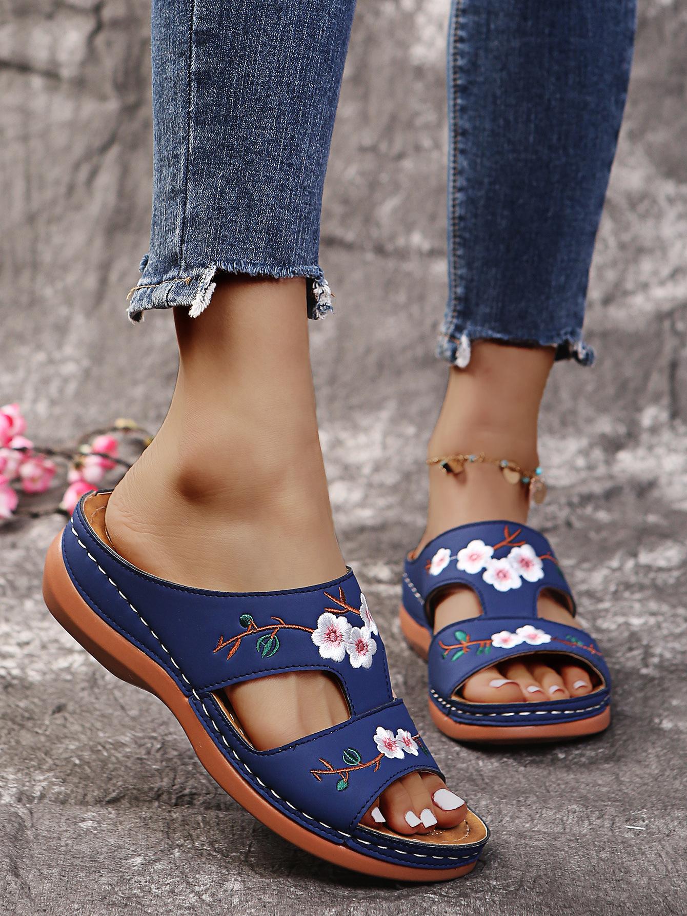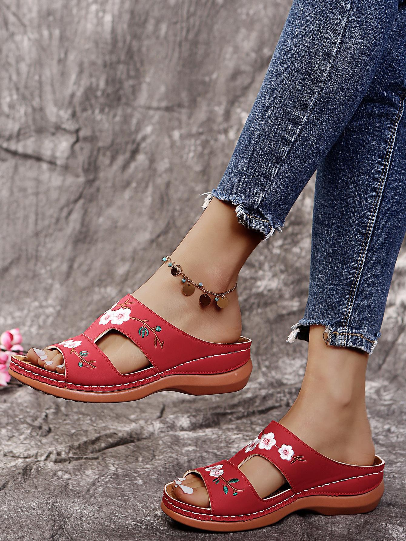 Compra 2025 Export Talla Grande Pantuflas de Una Línea para Mujer Verano Zapatos Romanos Tacón de Cuña Sandalias de Suela Gruesa Sandalias de Mujer con Flores Bordadas al por mayor en Joom.pro
