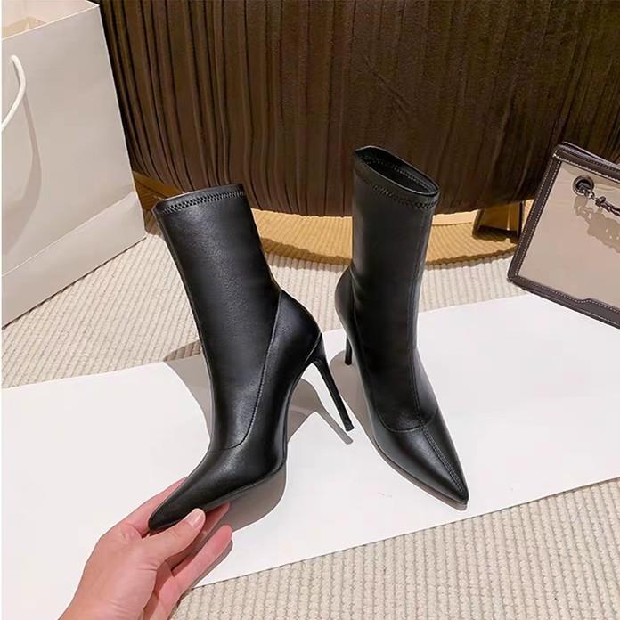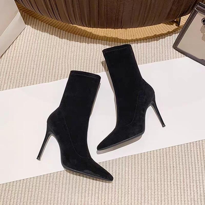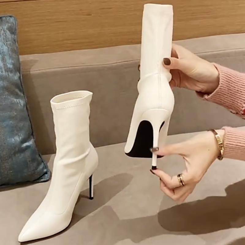 Botines de Mujer Otoño/Invierno 2025 Tacón Alto Elástico Francés Negro Punta Afilada Tacón de Aguja Botas Adelgazantes Botas Blancas de Ante Temperamento