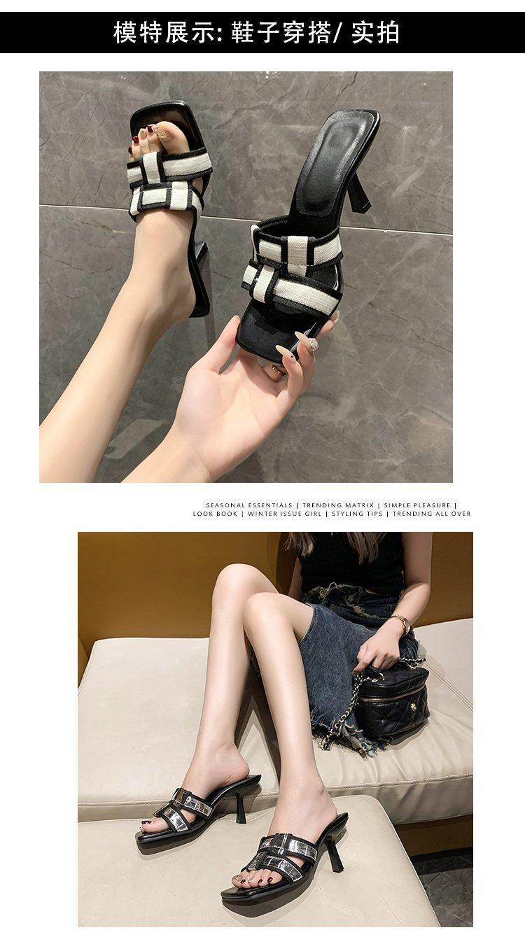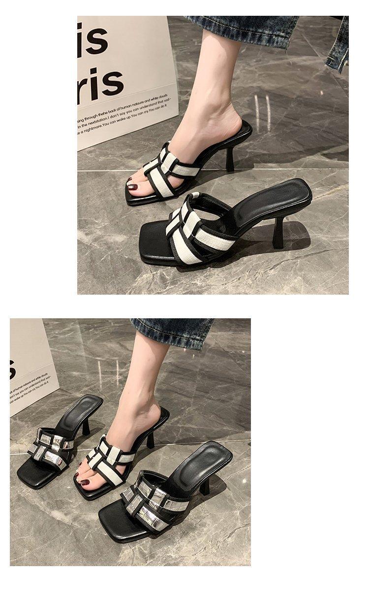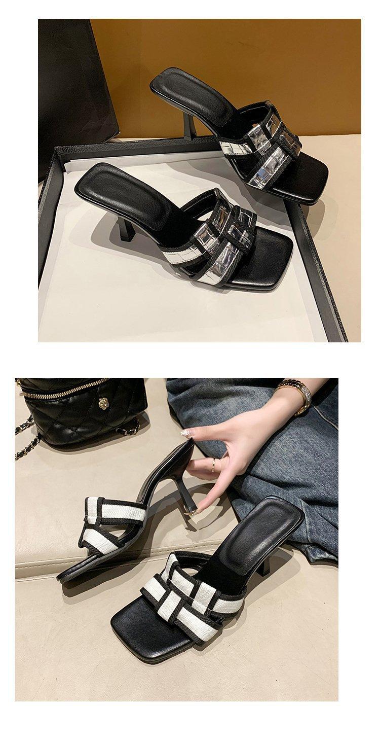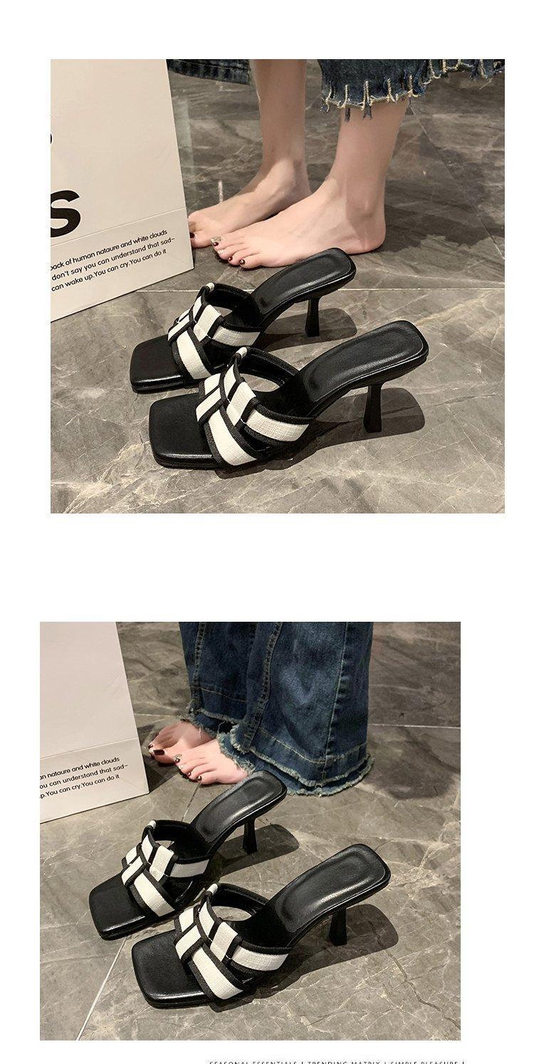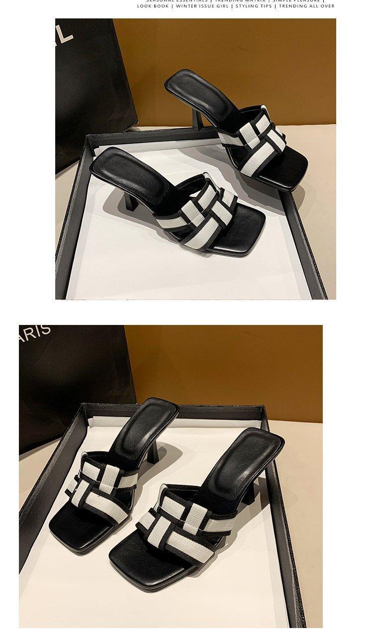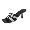 Zapatillas de Moda de Una Línea con Tacón Fino y Combinación de Colores para Comercio Exterior Europeo y Americano para Mujer, Tacón Mediano, Blanco y Negro, Punta Cuadrada, Sandalias de Tacón Alto, Suministro de Wish