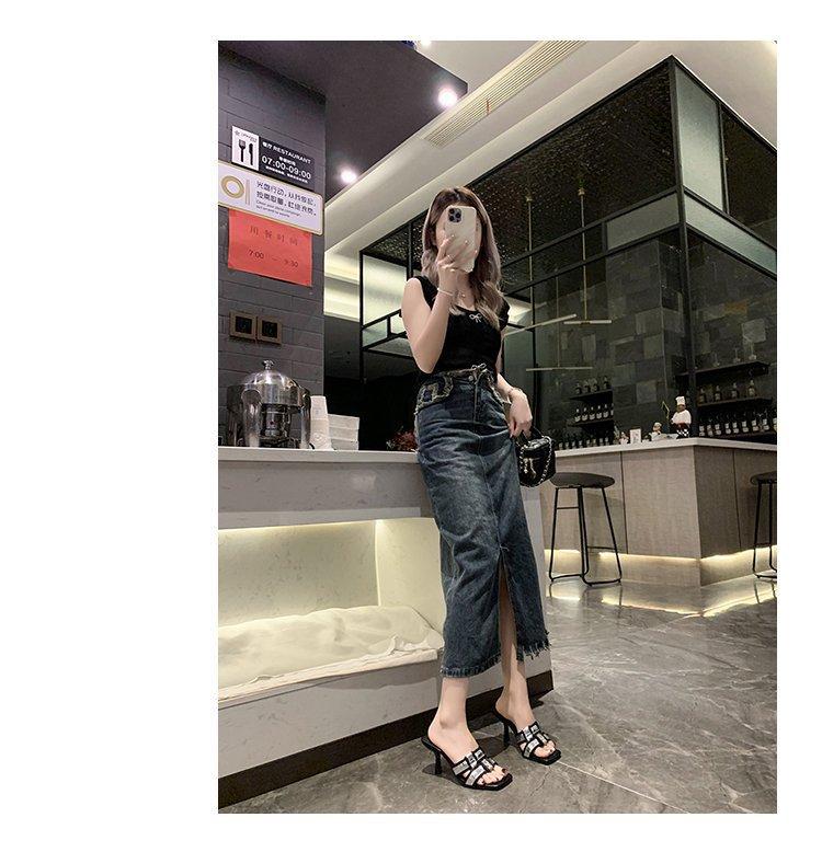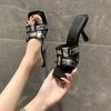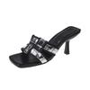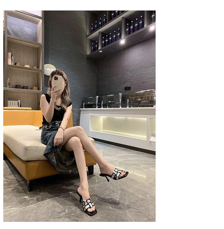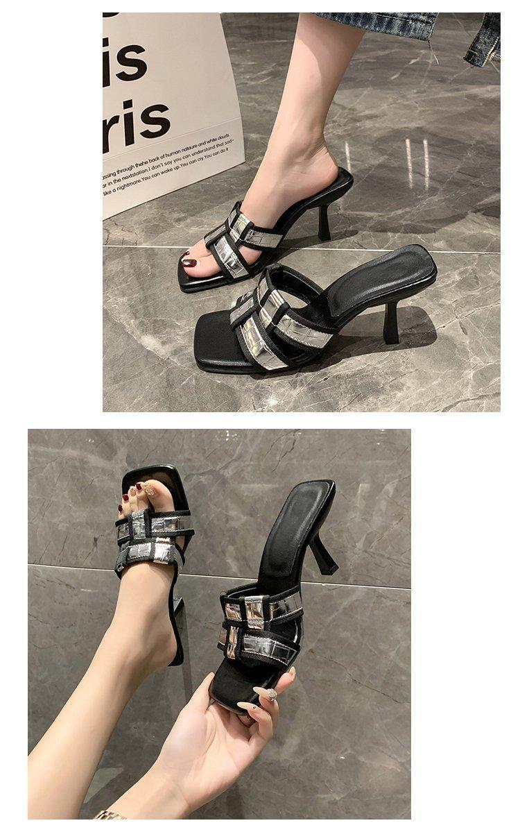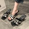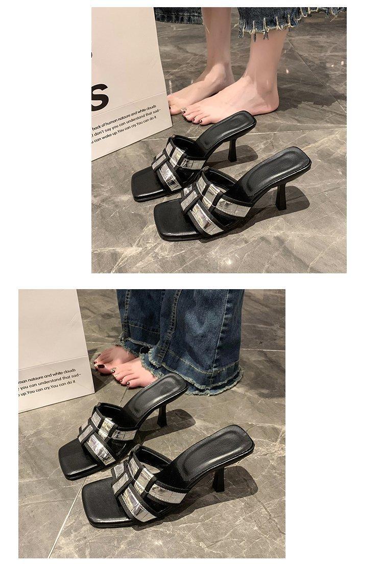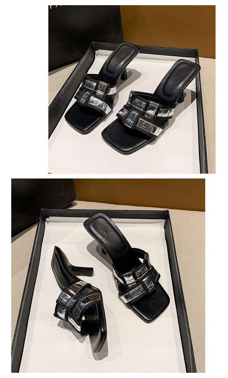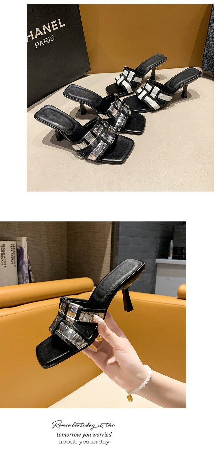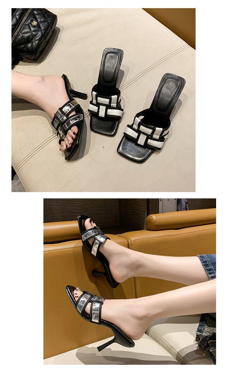 Zapatillas de Moda de Una Línea con Tacón Fino y Combinación de Colores para Comercio Exterior Europeo y Americano para Mujer, Tacón Mediano, Blanco y Negro, Punta Cuadrada, Sandalias de Tacón Alto, Suministro de Wish
