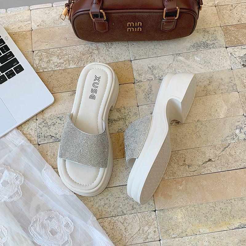 Sandalias de Interior Antideslizantes de Moda para Mujer para Usar en el Exterior 2025 Verano Nuevo Celebridad de Internet Pantuflas de Playa Pantuflas de Plataforma Gruesa con Pedrería