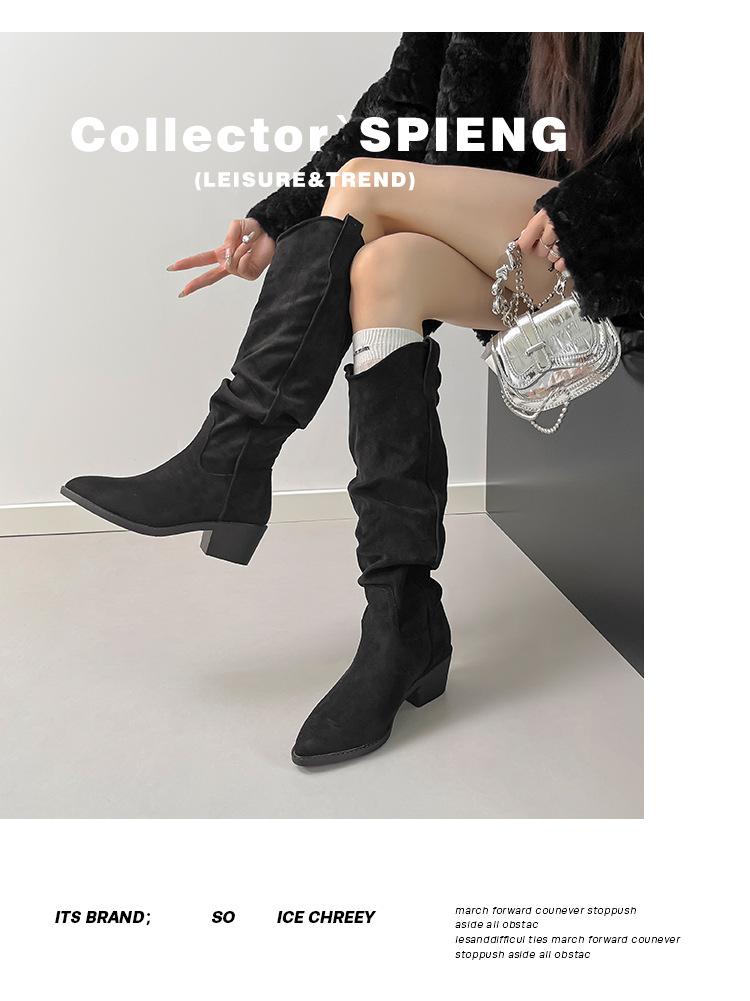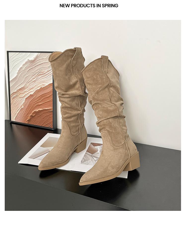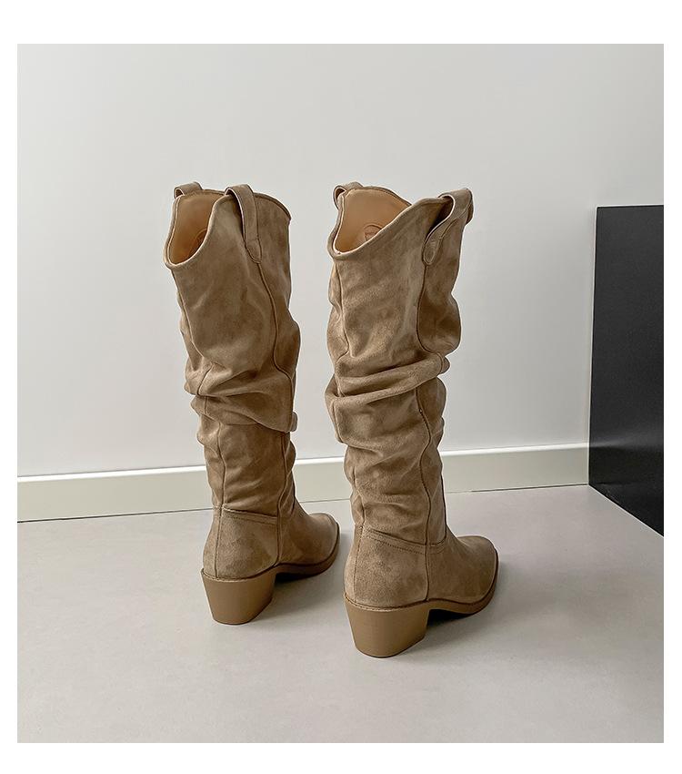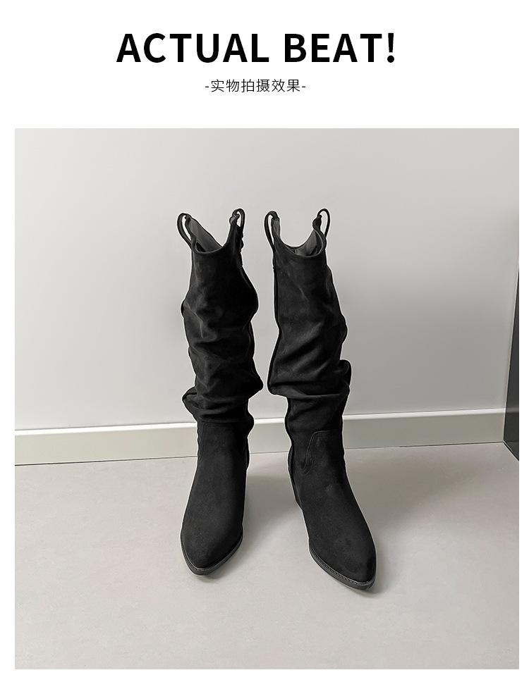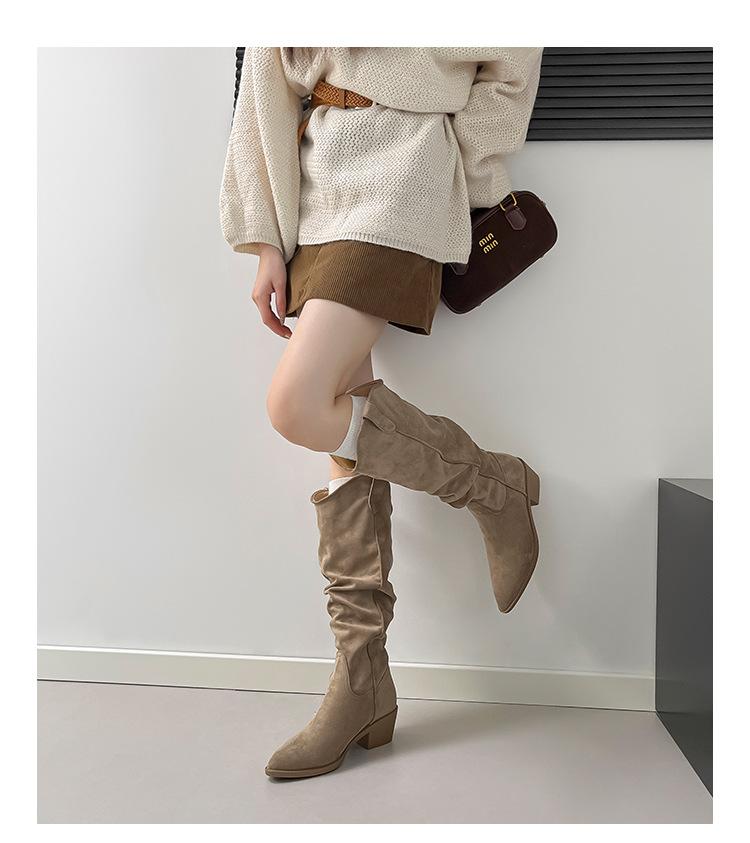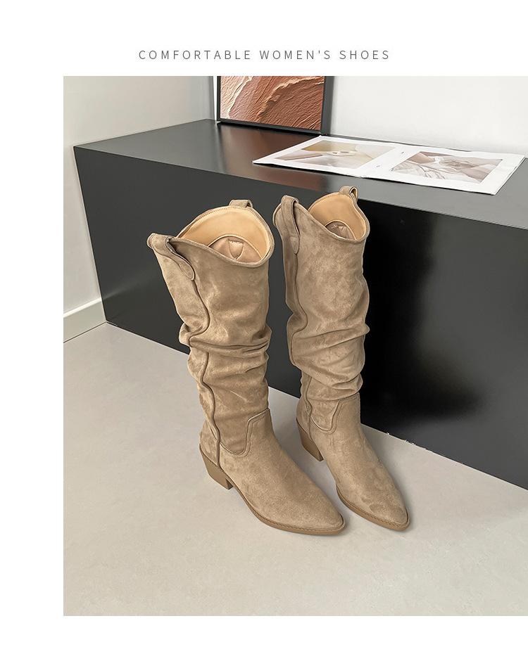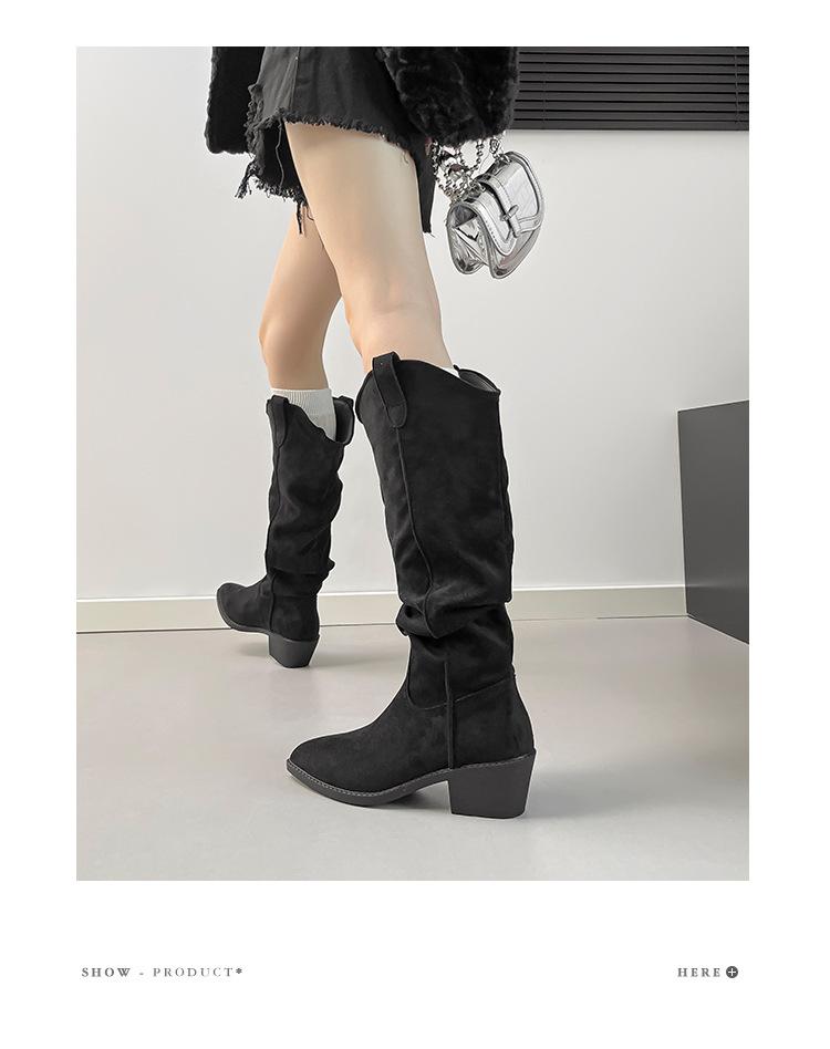 Botas Largas de Gamuza para Mujer Botas Apiladas Otoño Invierno Nuevo Tacón Chunky Punta Afilada Corte en V Adelgazantes Tubo Alto Botas Vaqueras Occidentales Botas de Jinete