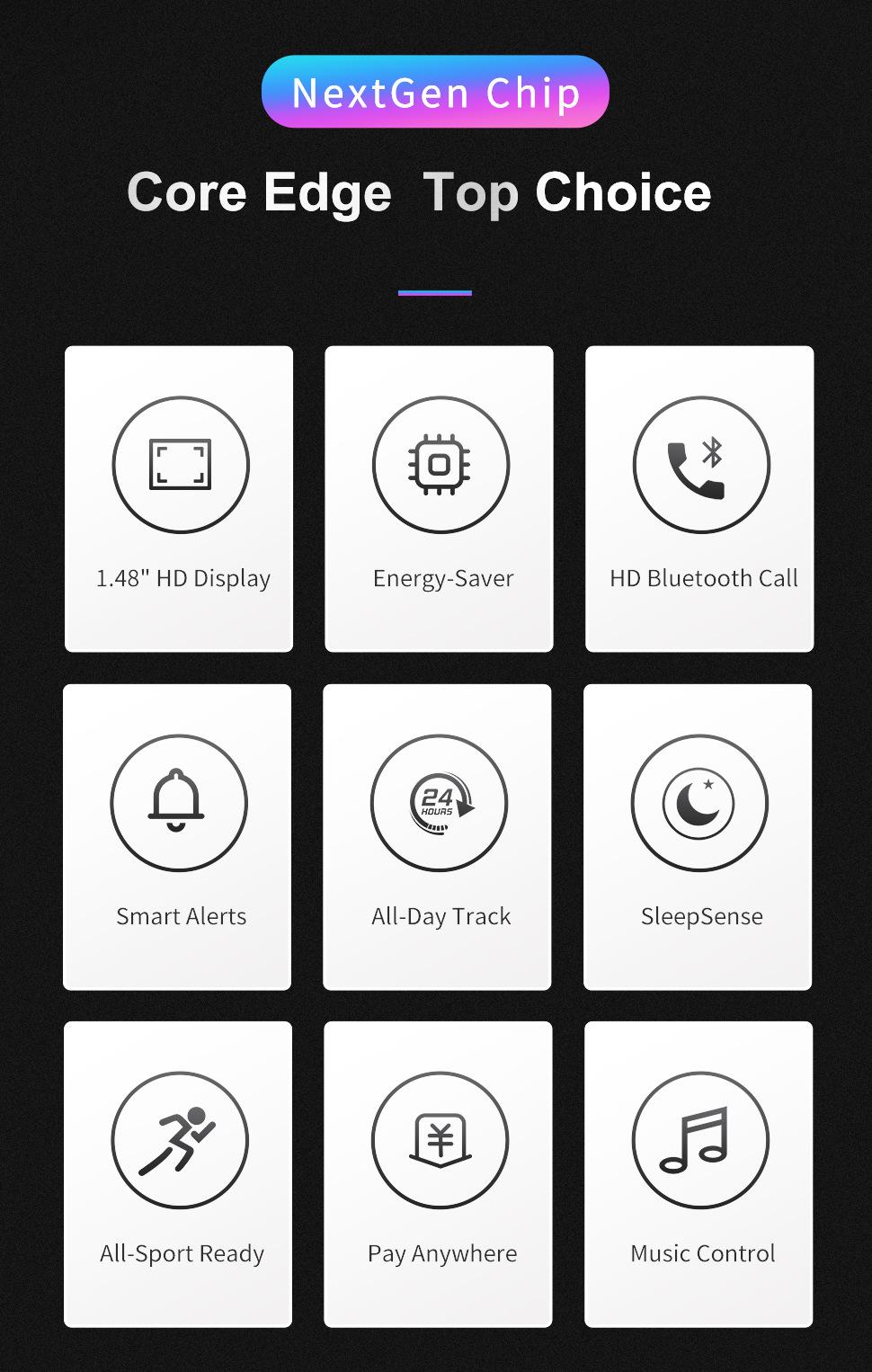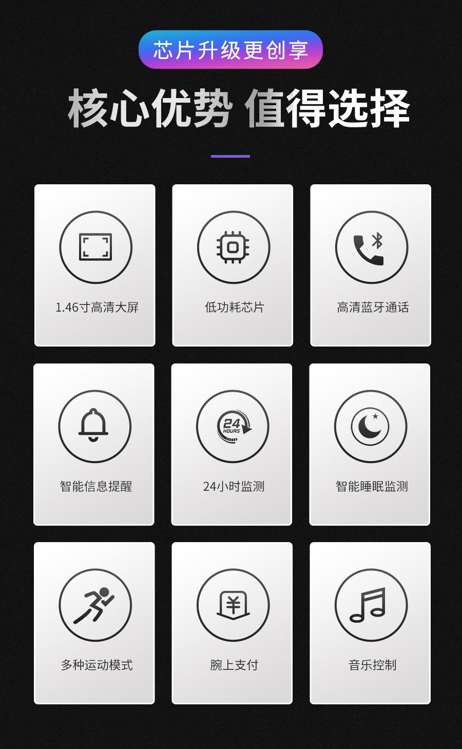 Take photos, Step counting, Heart rate monitoring, Social entertainment, Bluetooth call, Nfc function, Smart r...