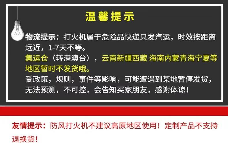 Declaración de servicio: Solicite la cantidad correspondiente de encendedores según sea necesario, ¡los pedidos incorrectos no se enviarán! ¡Los pedidos aleatorios no se enviarán! El precio del artículo es el precio sin impuestos, no se proporciona factura por defecto (se puede proporcionar un recibo manuscrito). Si necesita una factura, contacte con el servicio de atención al cliente para pagar la diferencia de precio.