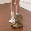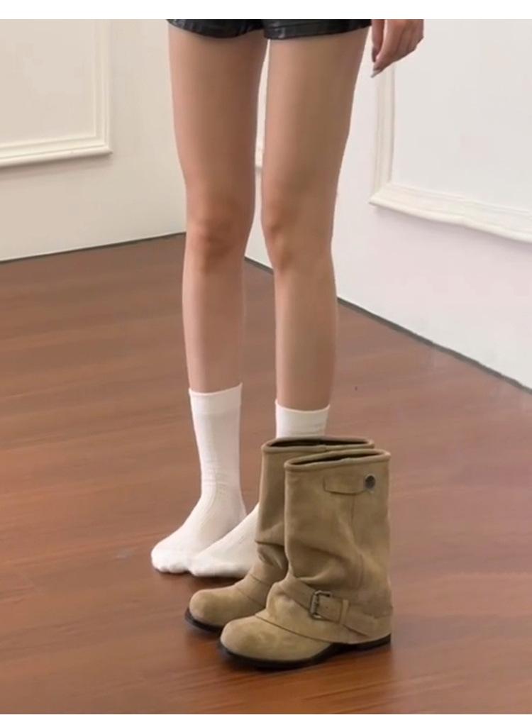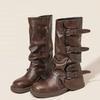 Botas Vaqueras de Punta Redonda para Mujer Estilo Wasteland Versátiles Botas de Caballero Hebilla Tacón Grueso Adelgazantes Caña Ancha