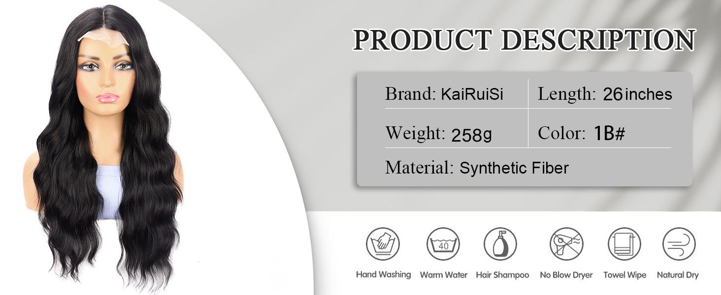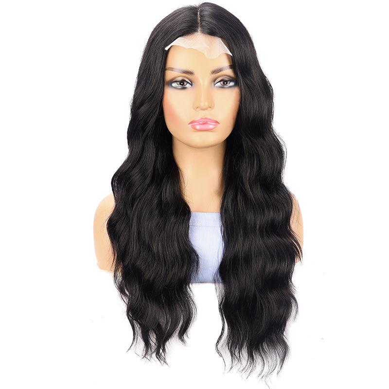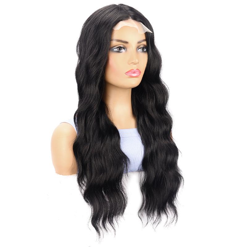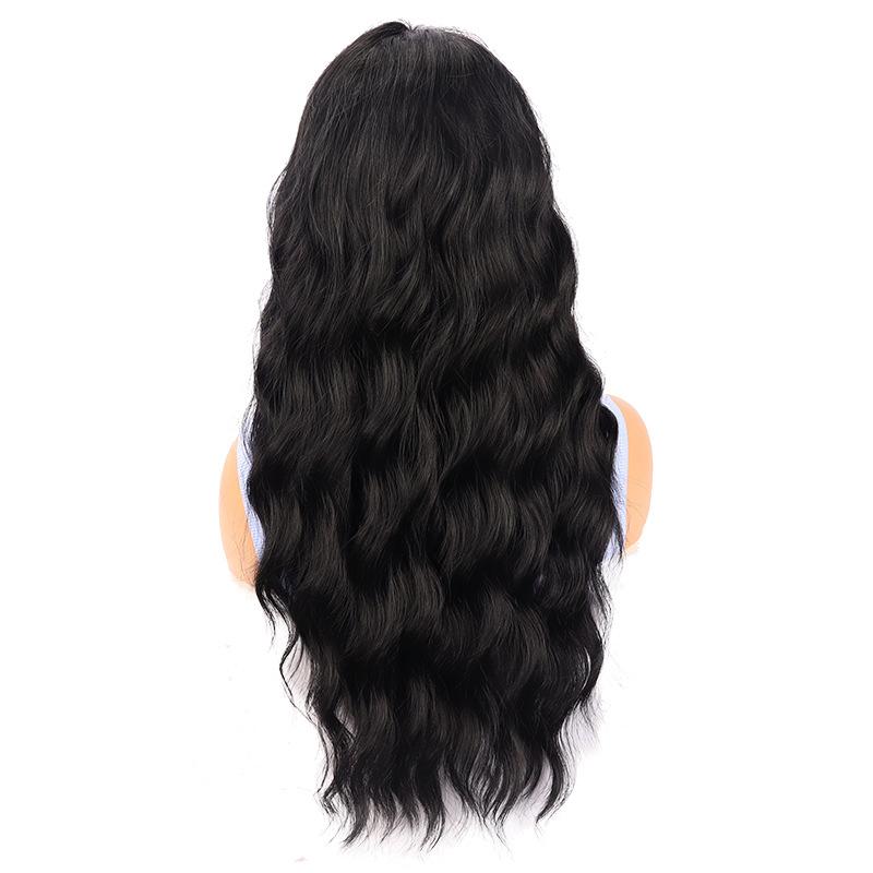 Peluca Pequeña en Forma de T con Encaje Frontal Más Vendida de Amazon Fibra Química Negra Ondas de Agua Raya Media Cabello Largo Rizado Seda de Alta Temperatura Tocado