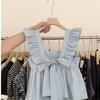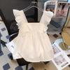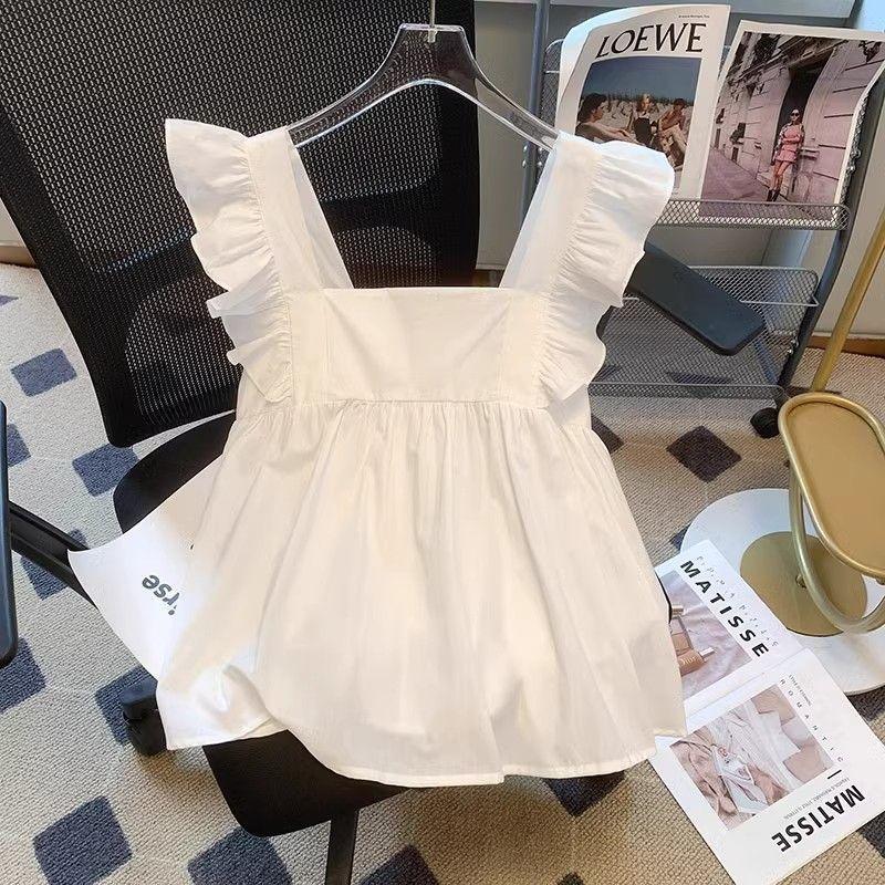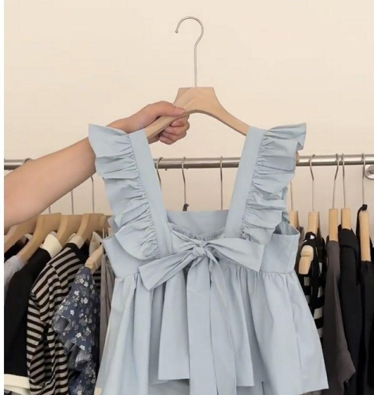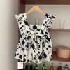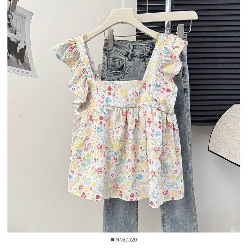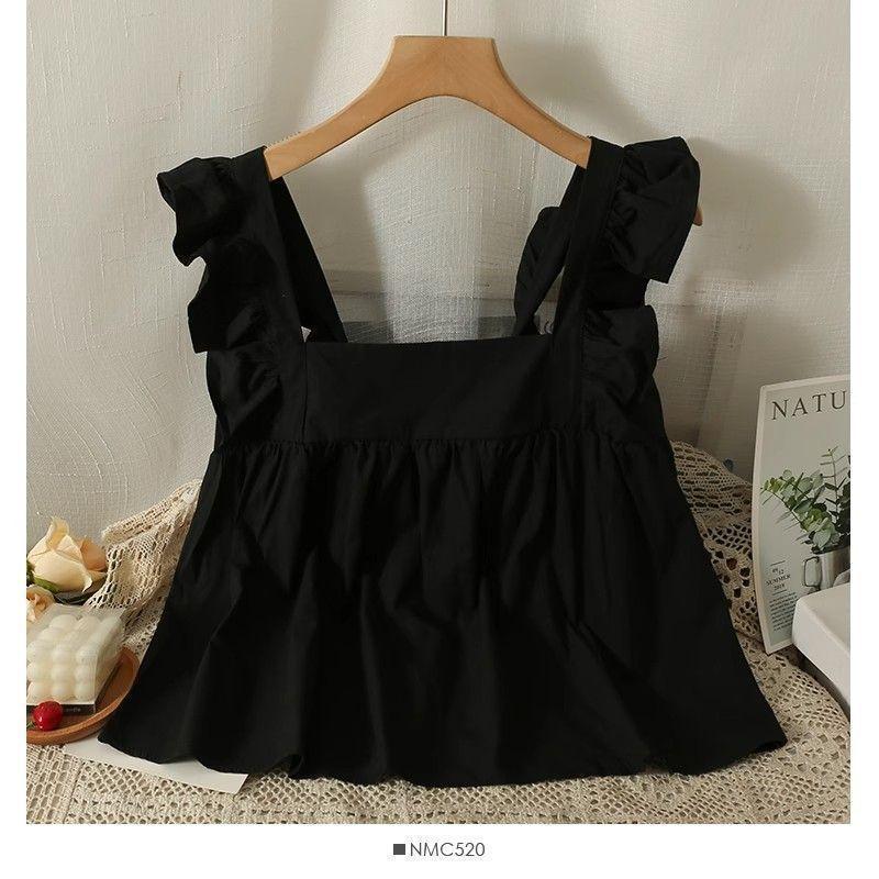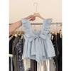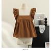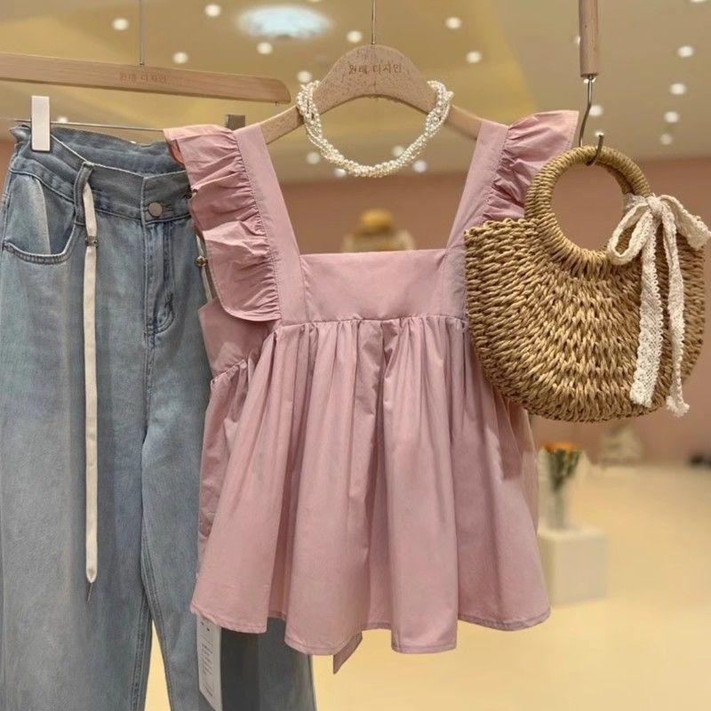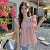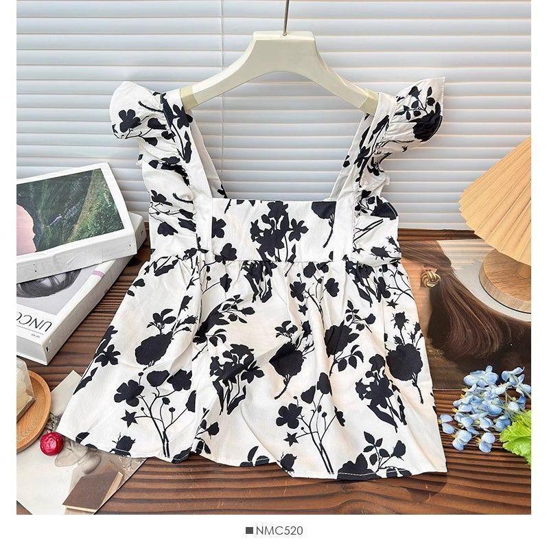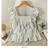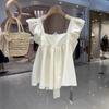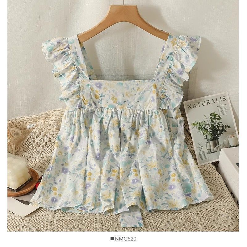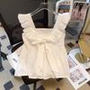 Camisa Francesa de Verano Diseño Dulce con Cordones Lazo Estampado Nueva Chic Cuello Cuadrado Manga con Volantes Top Corto