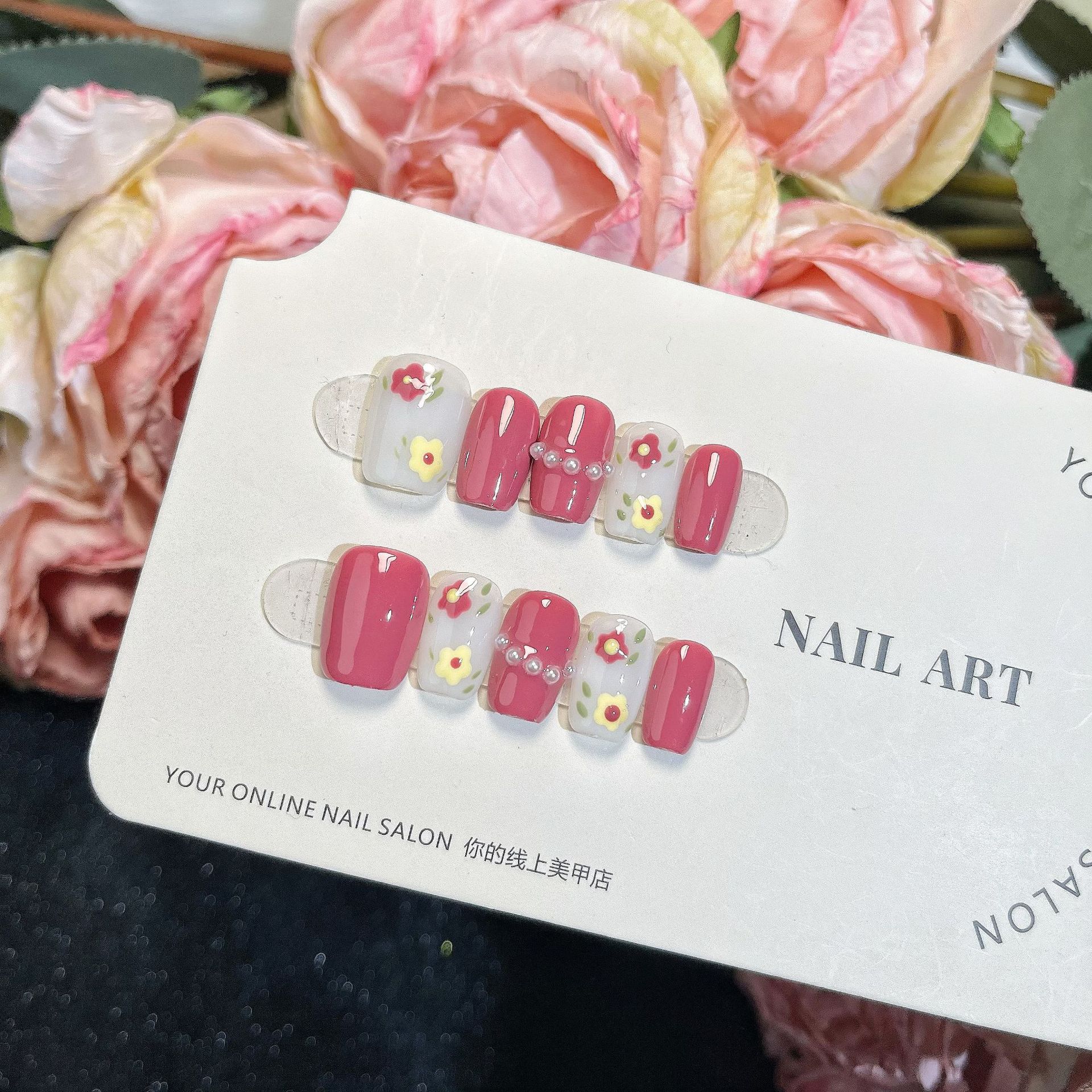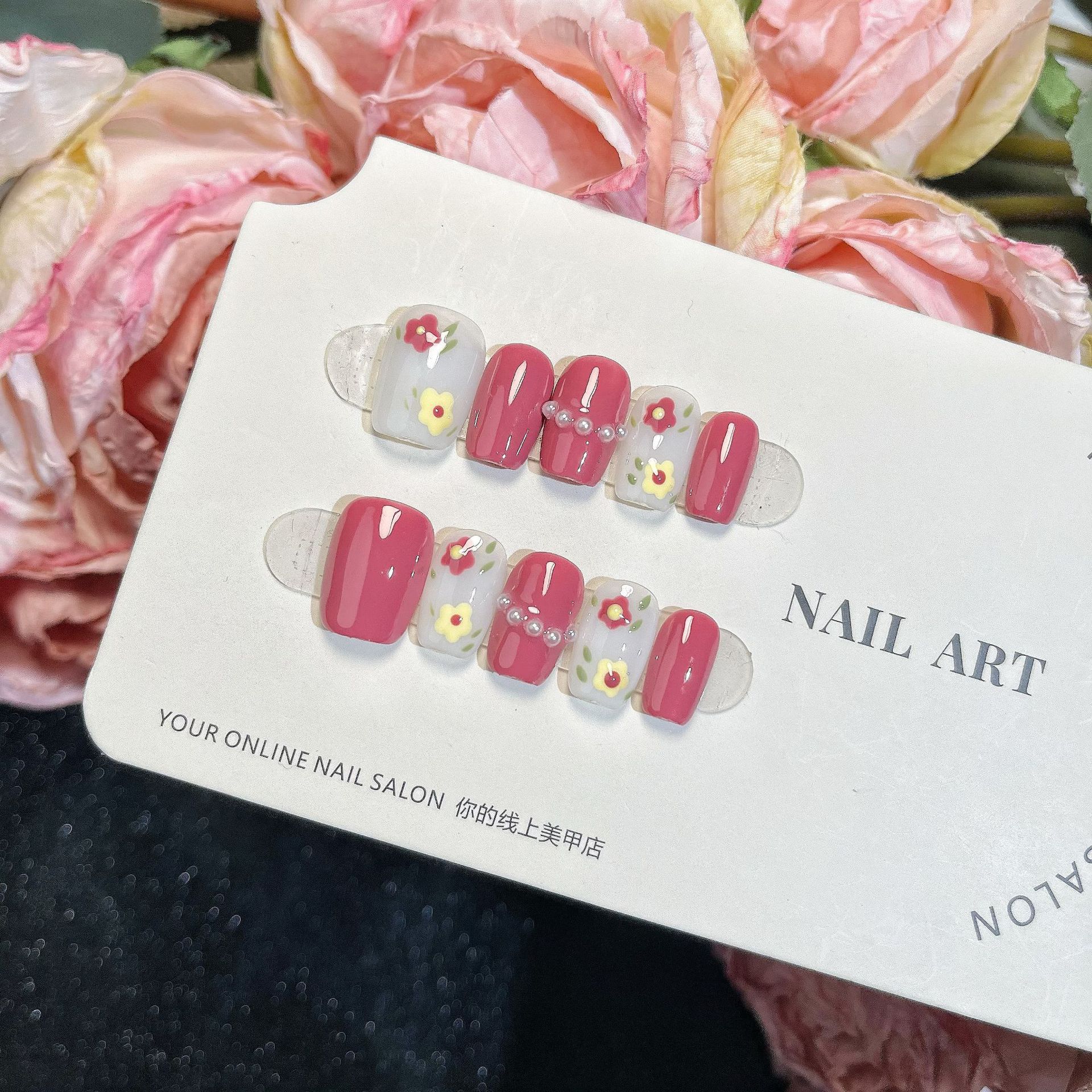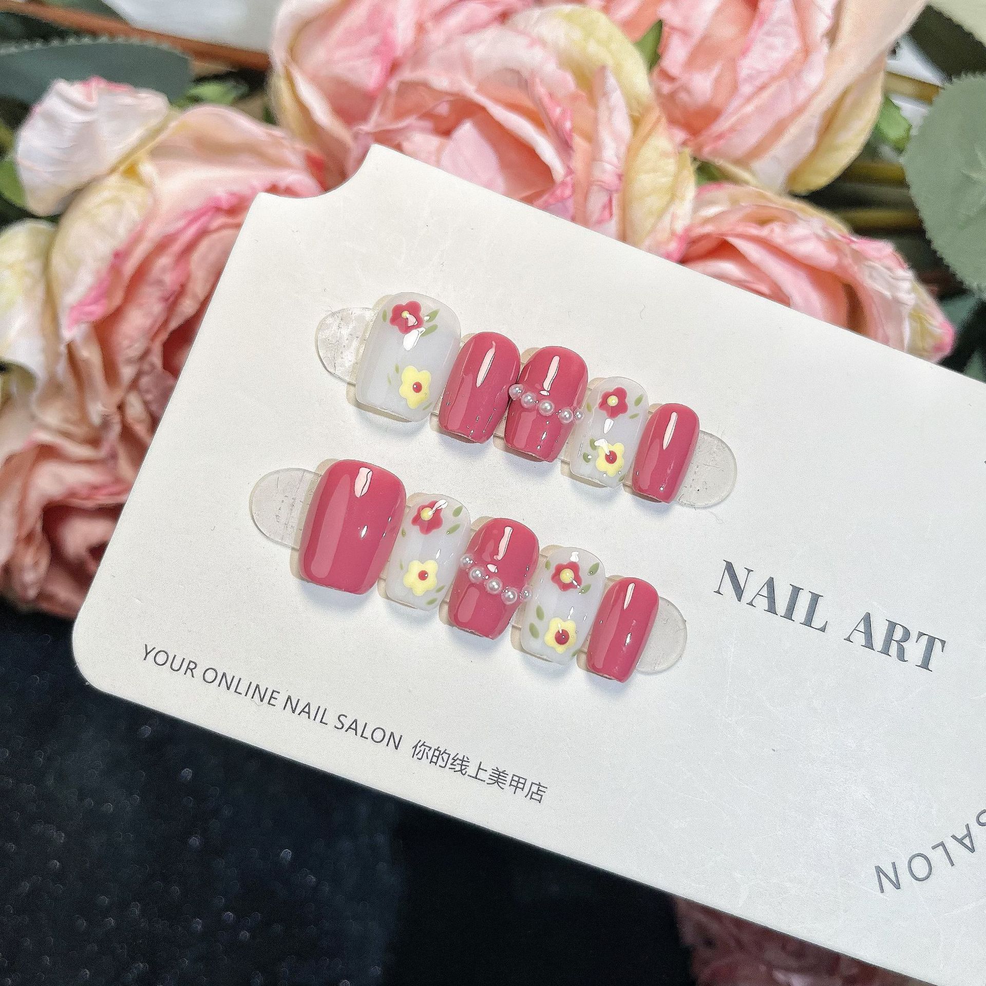 Uñas Postizas Hechas a Mano Uñas Postizas Flores Hechas a Mano Rosa Año Nuevo Manicura Postiza de Alta Gama Acabada Parche de Uña Postiza Estilo Corto