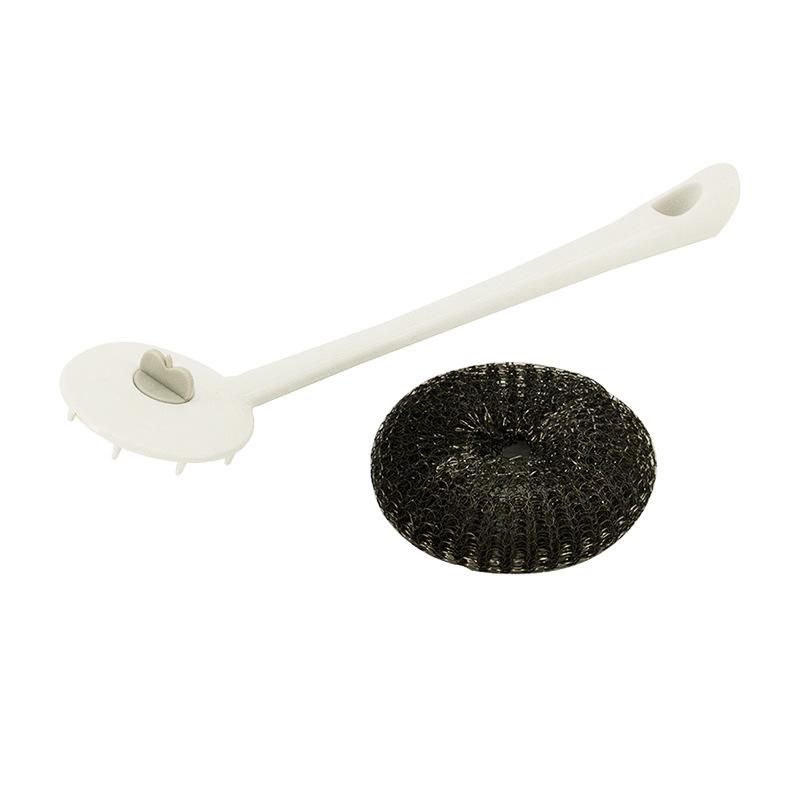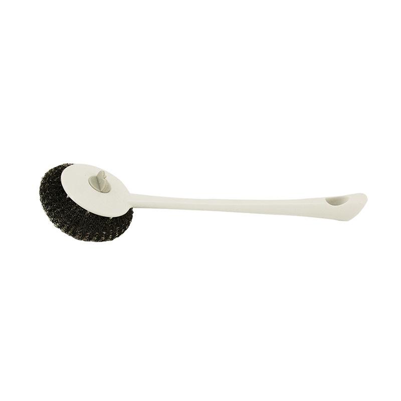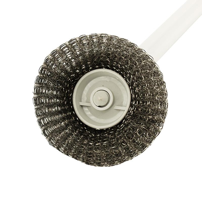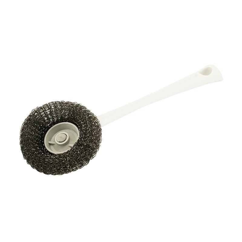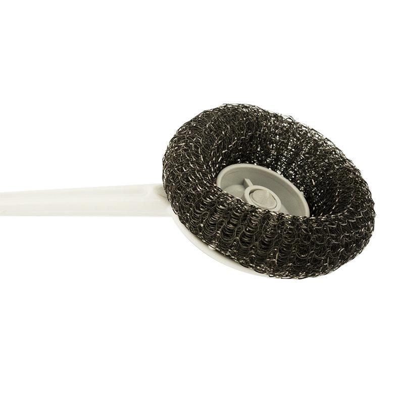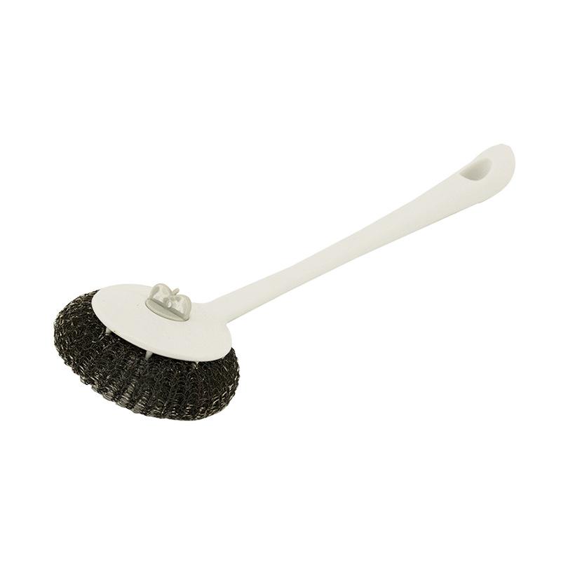Fregar ollas, lavar platos y limpiar el fregadero todo en uno, simple y conveniente sin dañar las manos. El cabezal del cepillo está hecho de material de acero inoxidable, para una eliminación de manchas y limpieza más rápidas, con un diseño espiral interno que no es fácil de aflojar. El mango está hecho de material PP de alta calidad, con una apariencia elegante y generosa. El orificio redondo en el extremo del mango de plástico permite el almacenamiento colgante, ahorrando espacio.