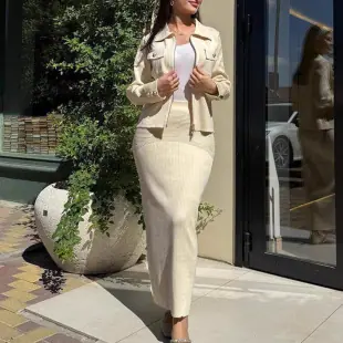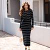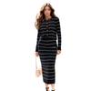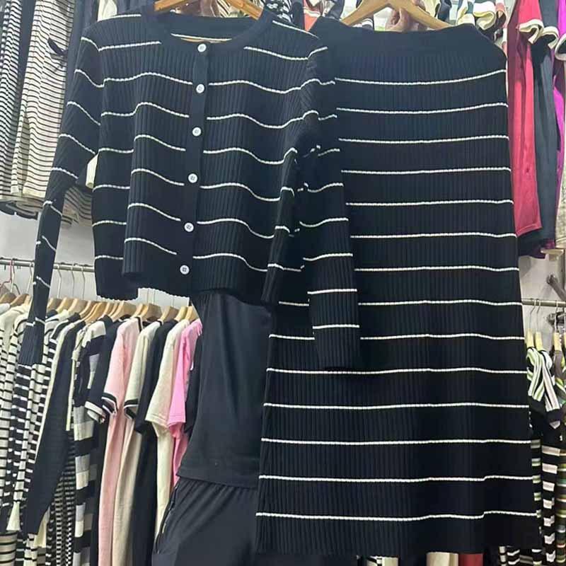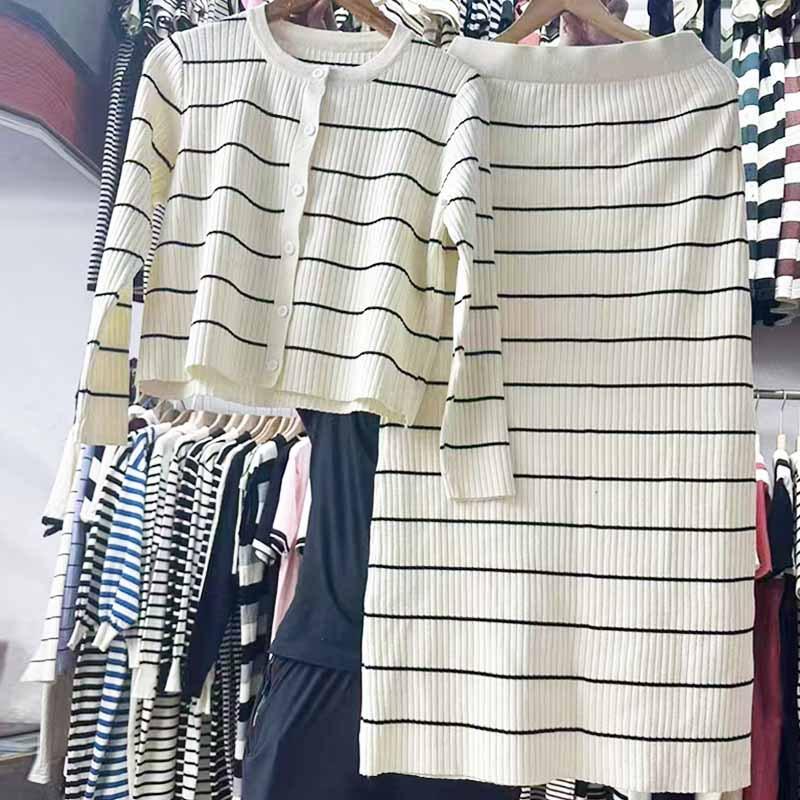 Transfronterizo 2025 Otoño/Invierno Nuevo Cárdigan de Punto de Dos Piezas con Cuello Redondo a Rayas de Manga Larga Falda Midi Adelgazante
