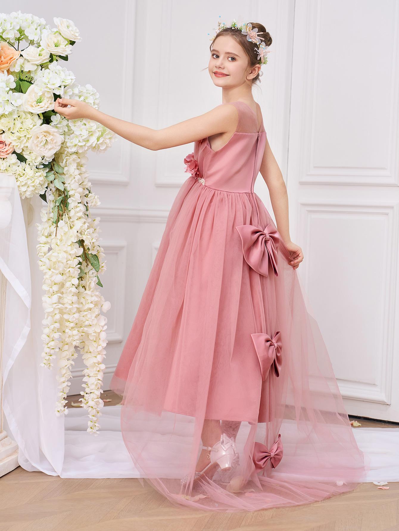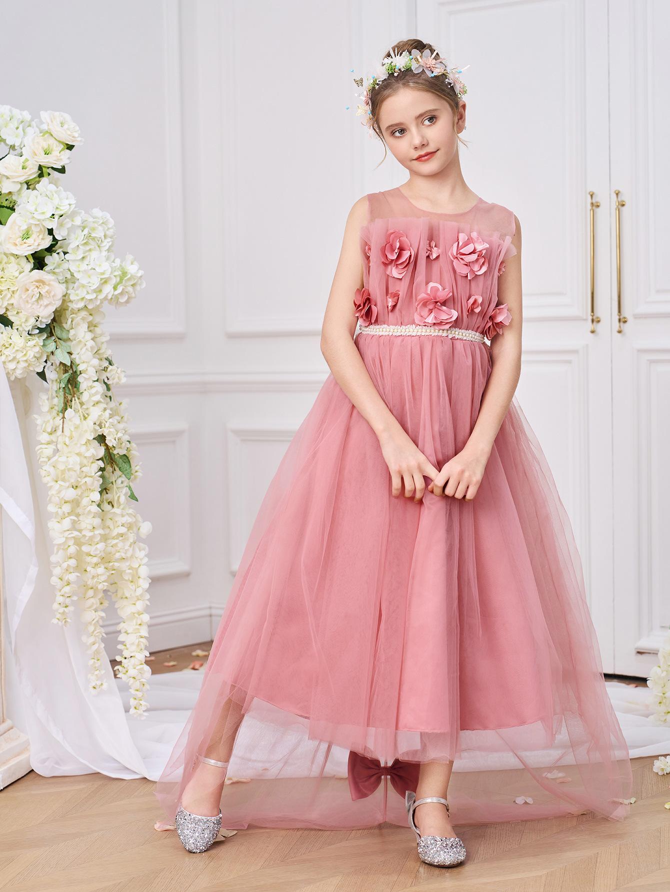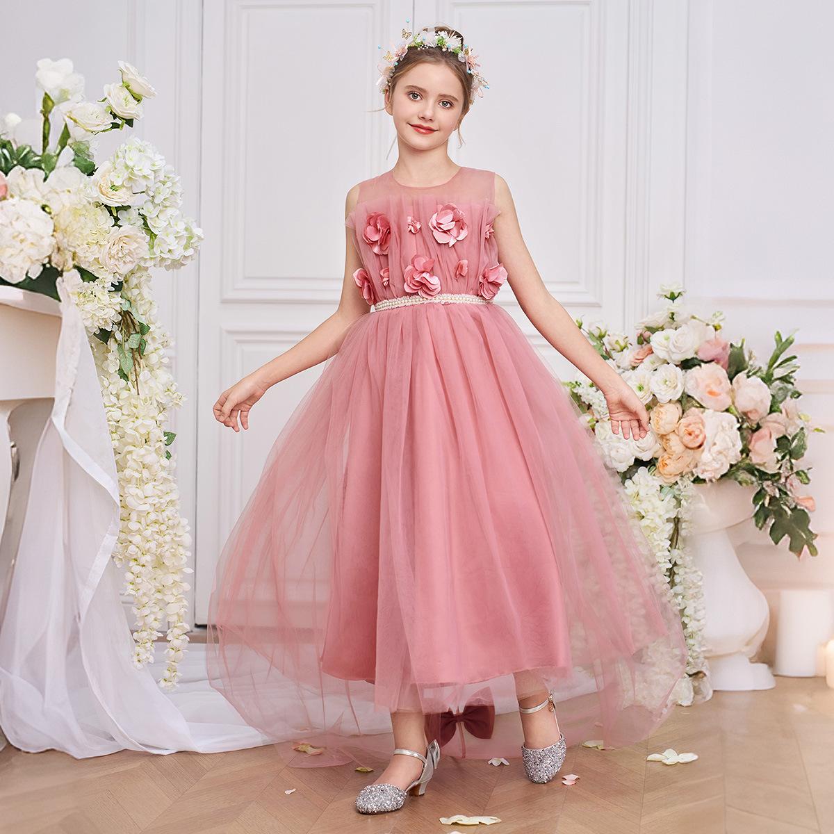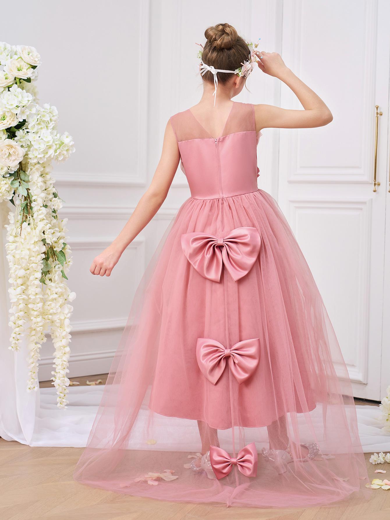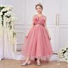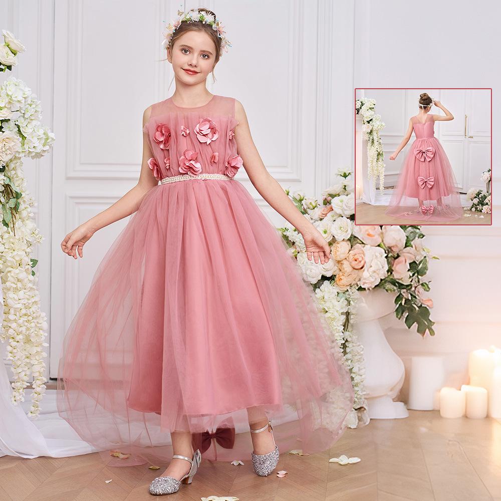Vestido Transfronterizo para Niñas Medianas y Grandes Vacaciones Boda Banquete Malla Niña de las Flores Esponjoso Vestido de Princesa Lazo Tridimensional Cola Vestido de Noche