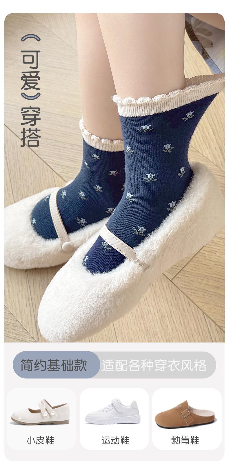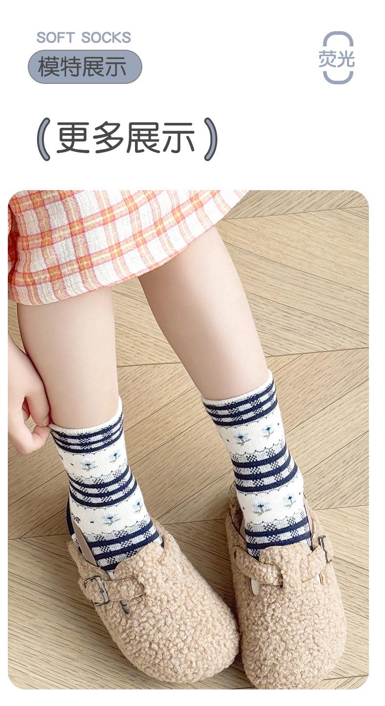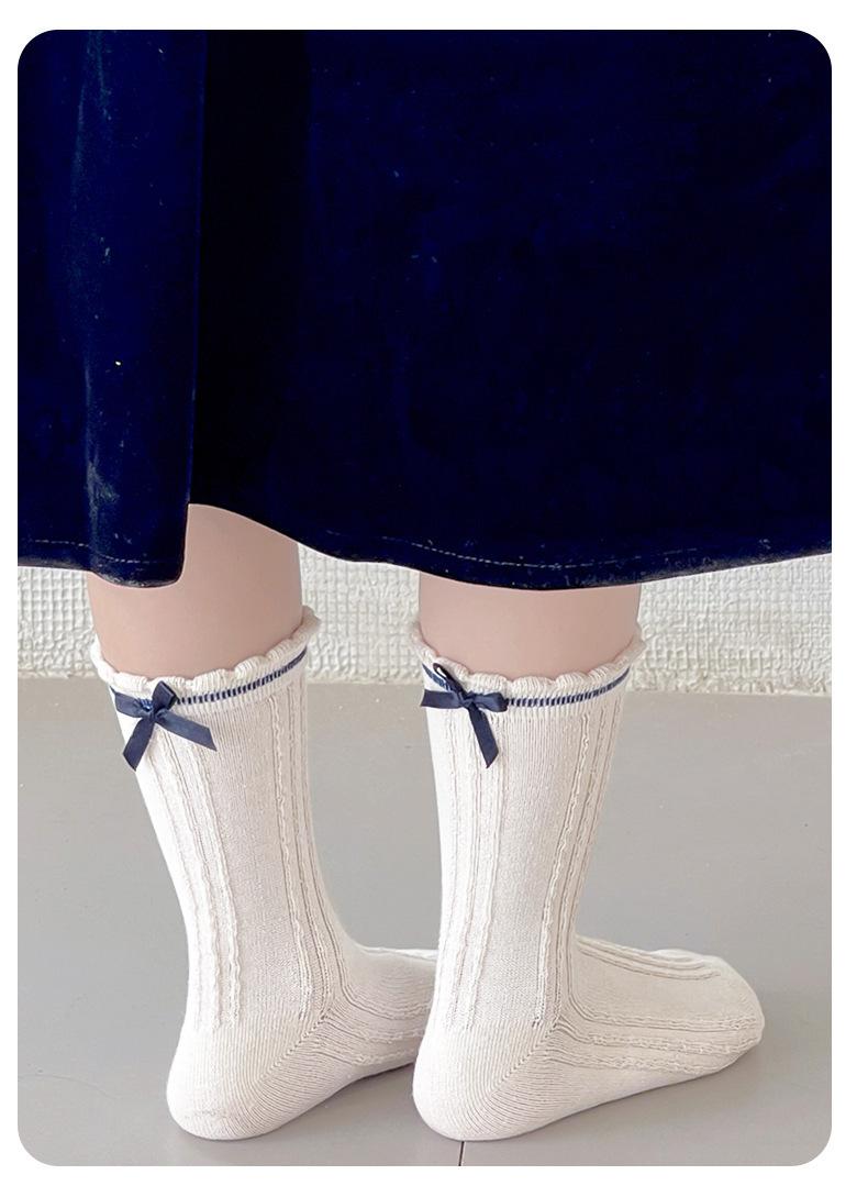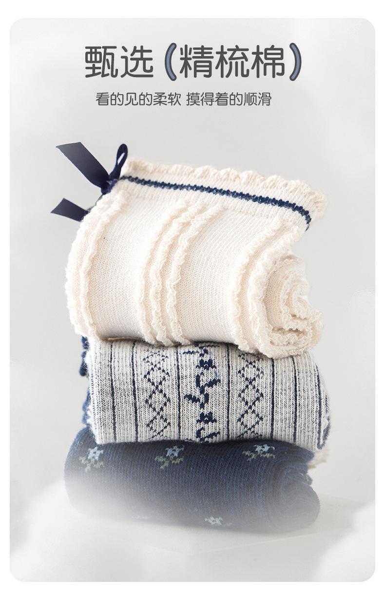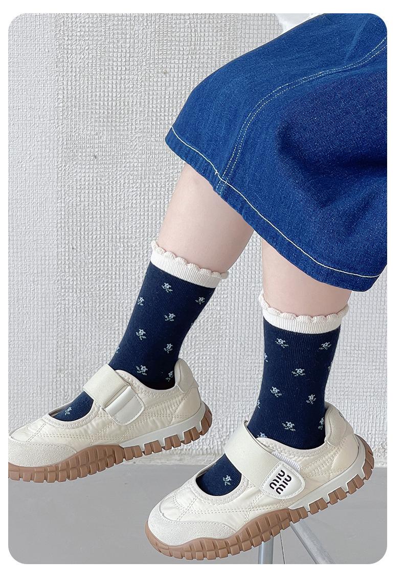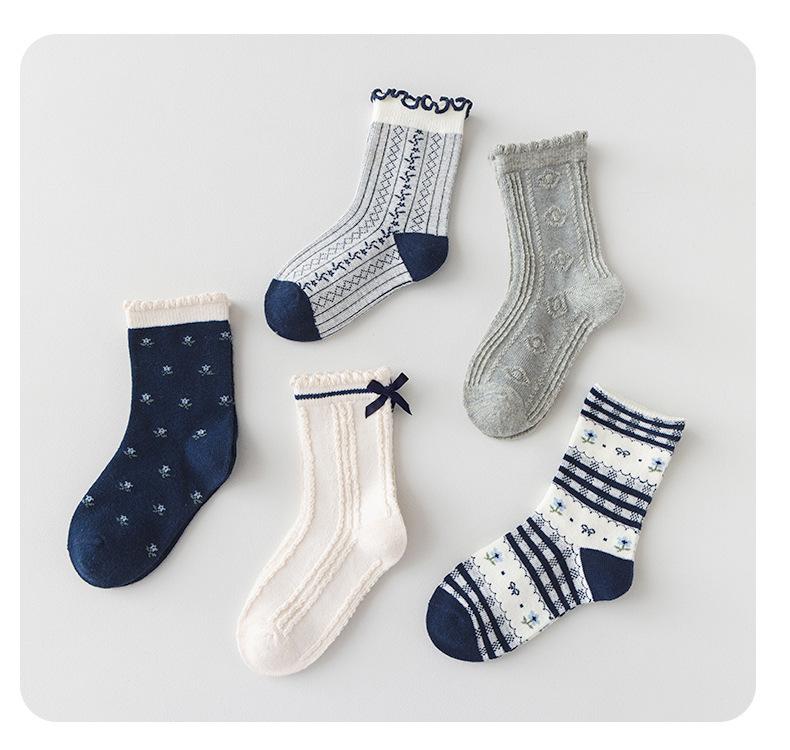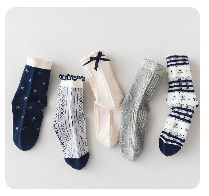 Calcetines Nuevos para Niñas Primavera Otoño Estilo Mori Azul Marino Florales Media Caña Calcetines Japoneses Encaje Lazo Calcetines de Princesa Calcetines para Niños