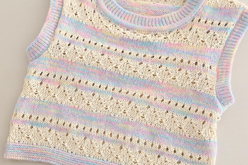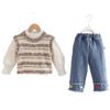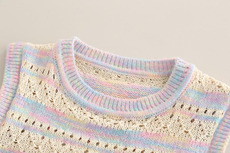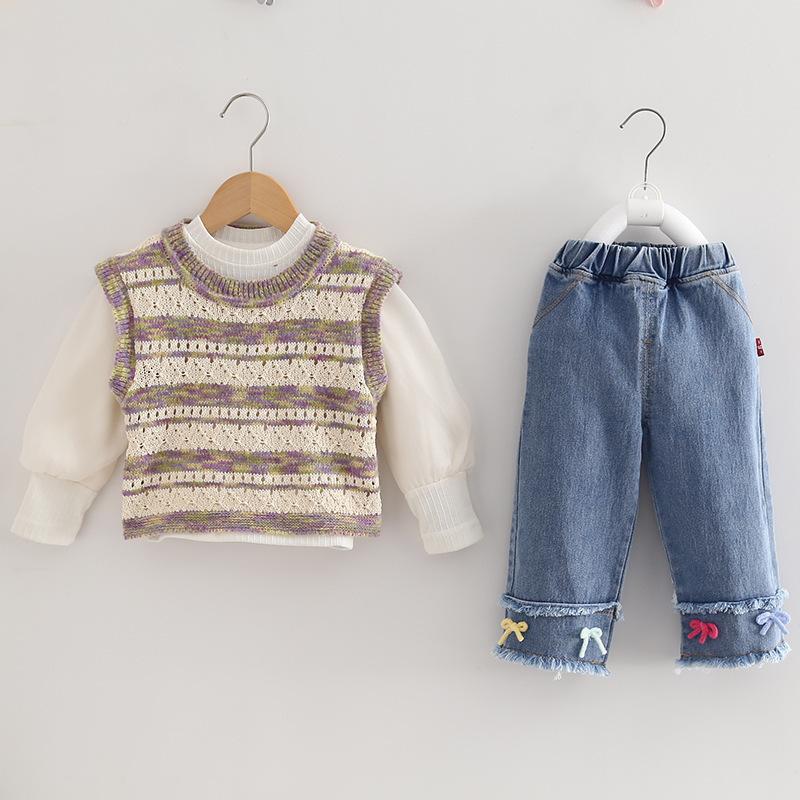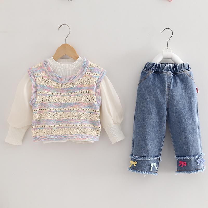 Conjunto de Otoño para Niñas 2025 Nuevo Estilo Coreano Lazo Bebé Moda Suéter Colorido Chaleco Ropa Conjunto de Tres Piezas