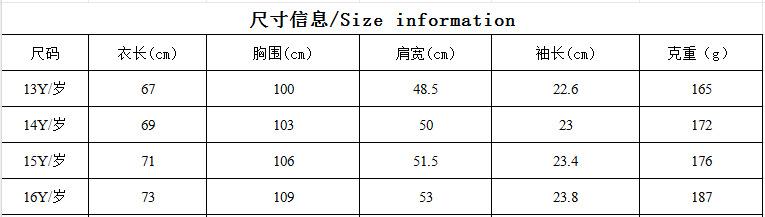 13Y/years old (suggested height 158cm), 14Y/years old (recommended height 164cm), 15Y/year(suggested height 17...