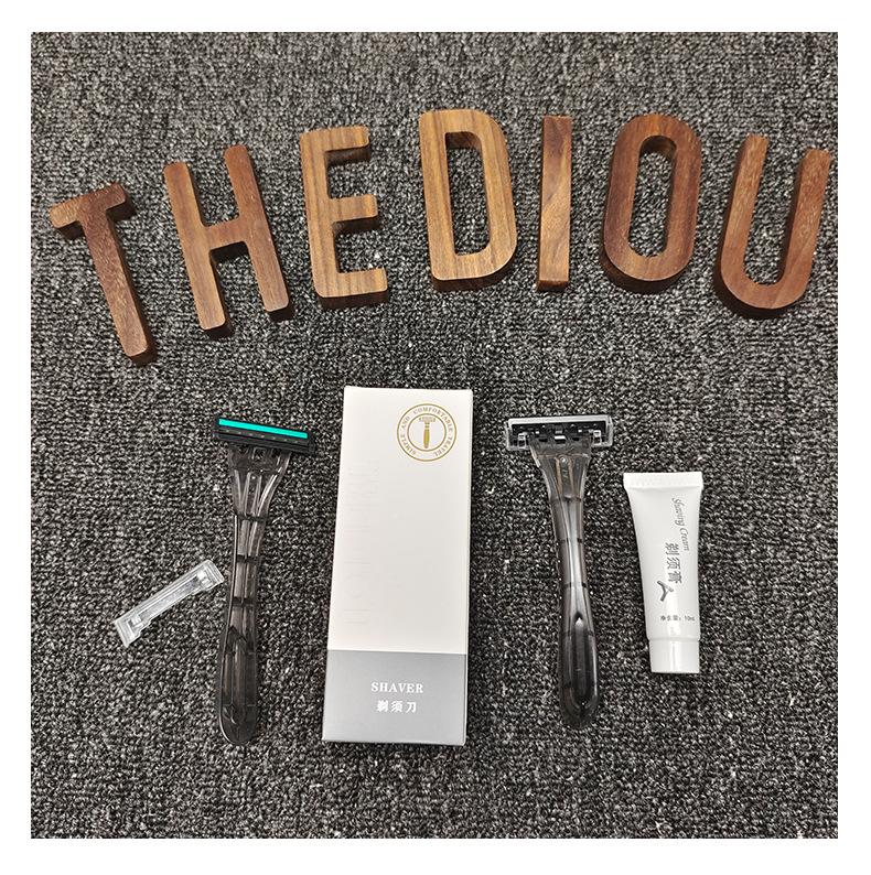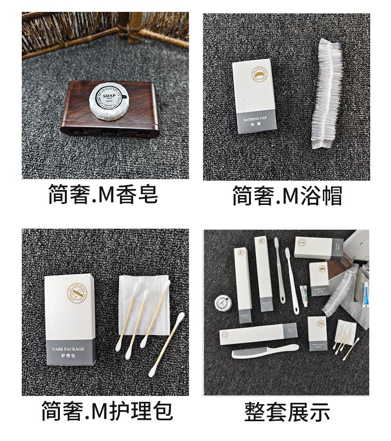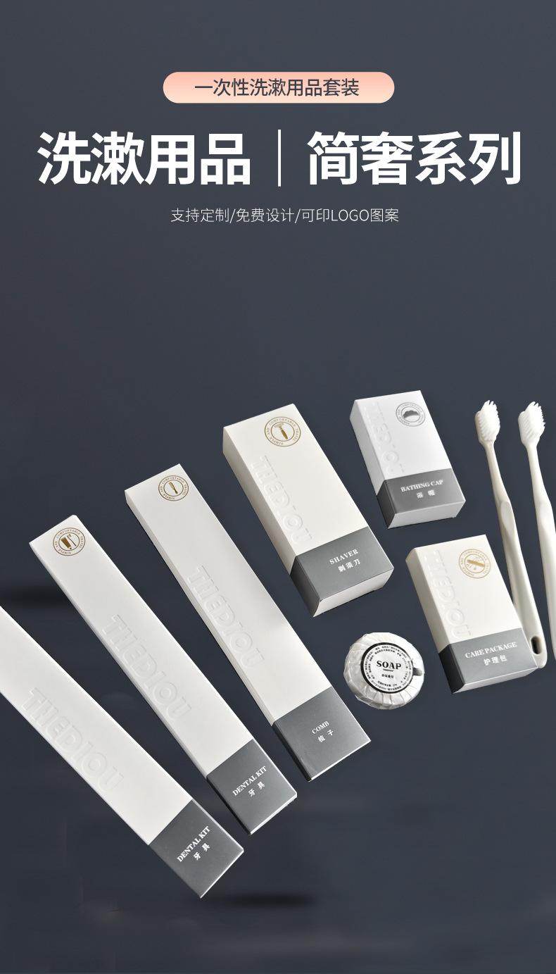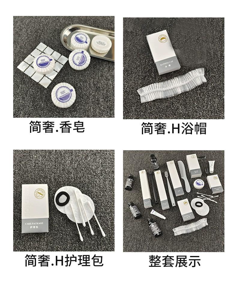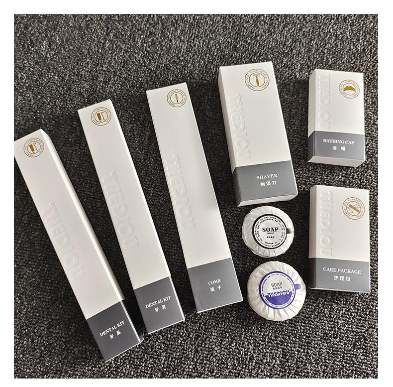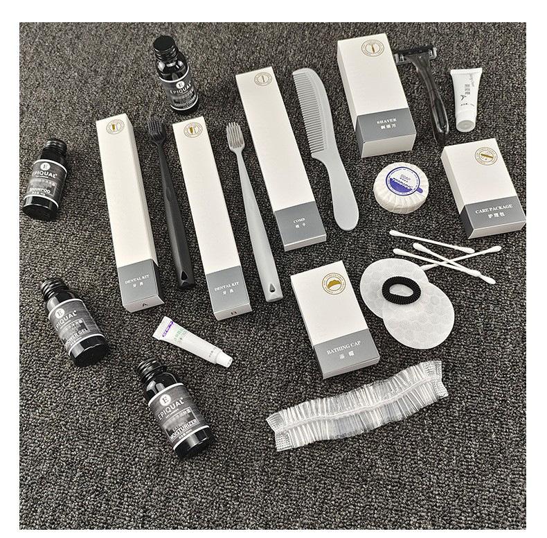 Disposable slippers, Disposable shower cap, Disposable soap, Disposable razor, Disposable toothbrush, Disposab...