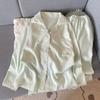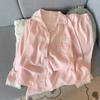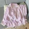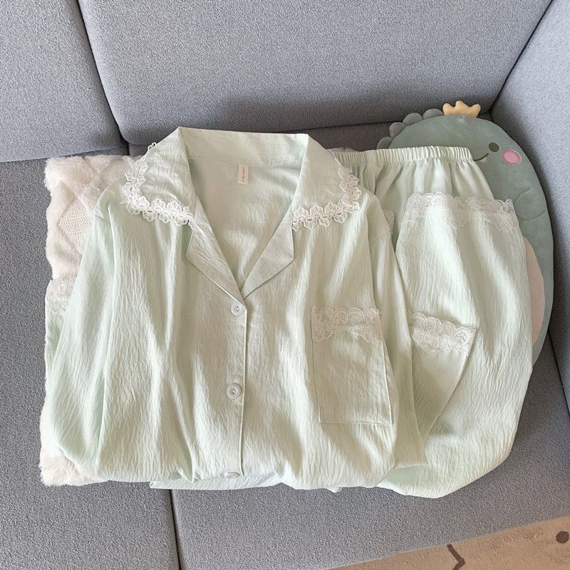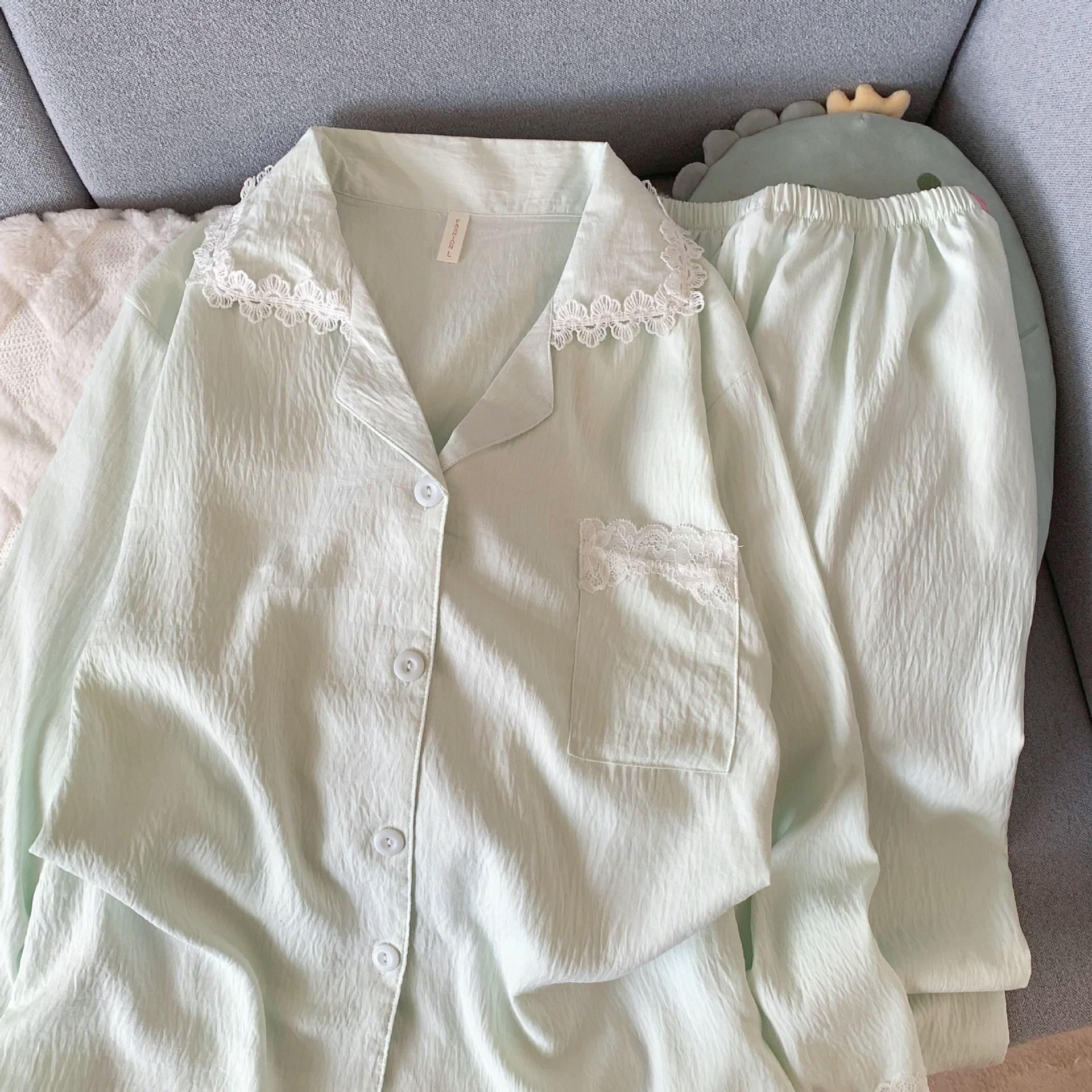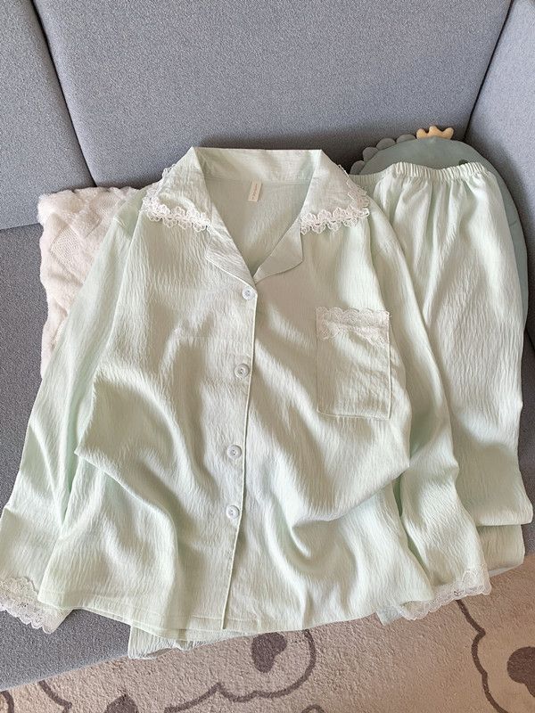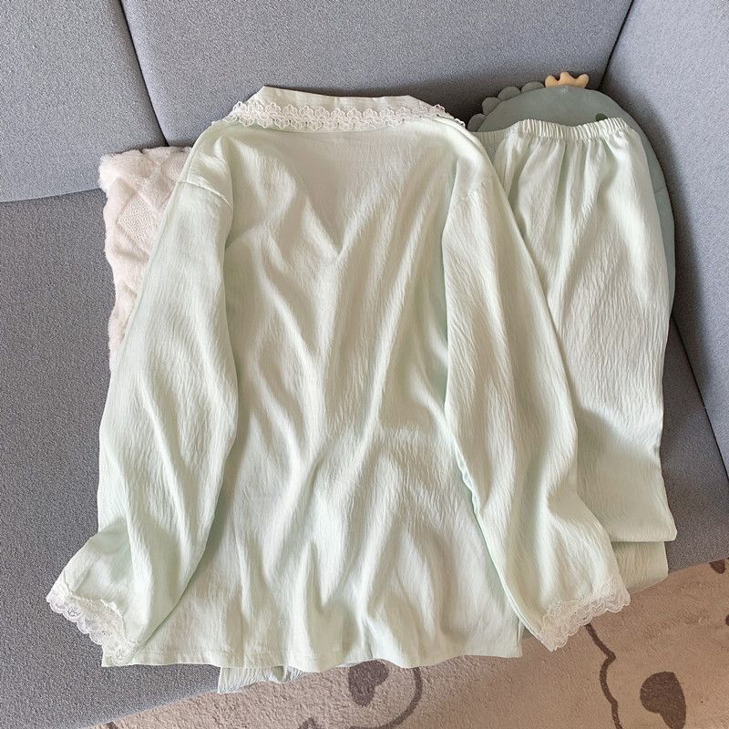 Primavera y Otoño Ins Coreano Color Puro Encaje Pijama para Mujer Algodón Nube Manga Larga Pantalones Dulce Sencillo Conjunto de Ropa para el Hogar