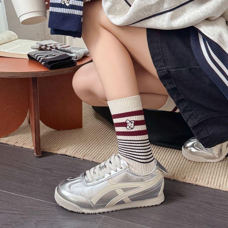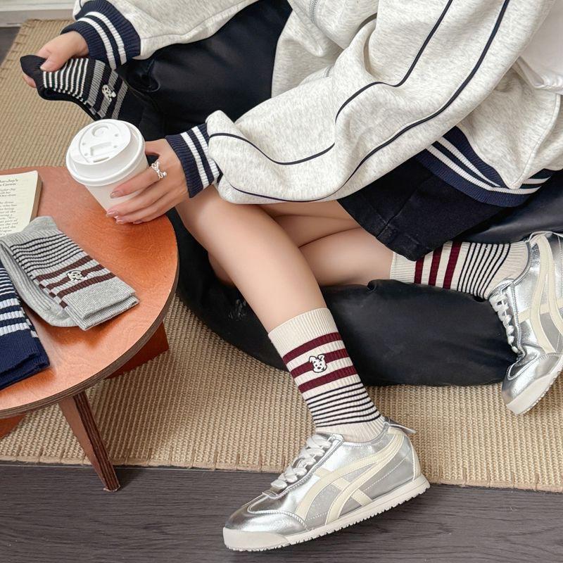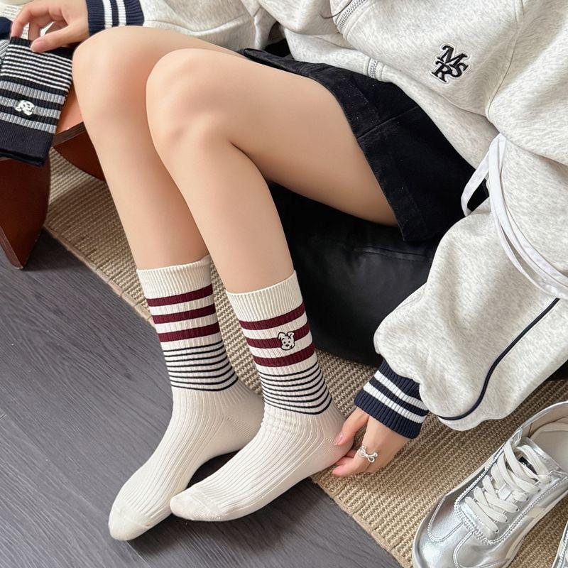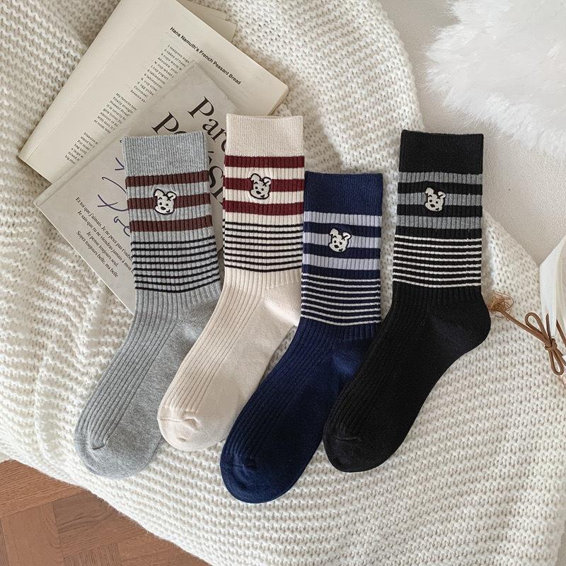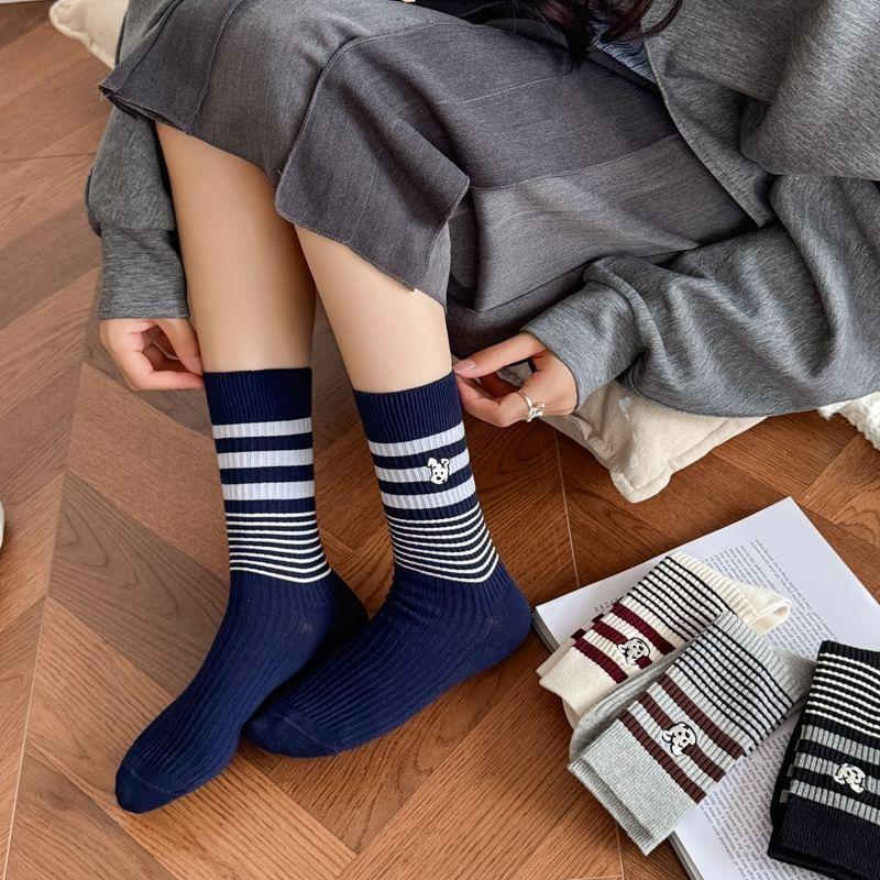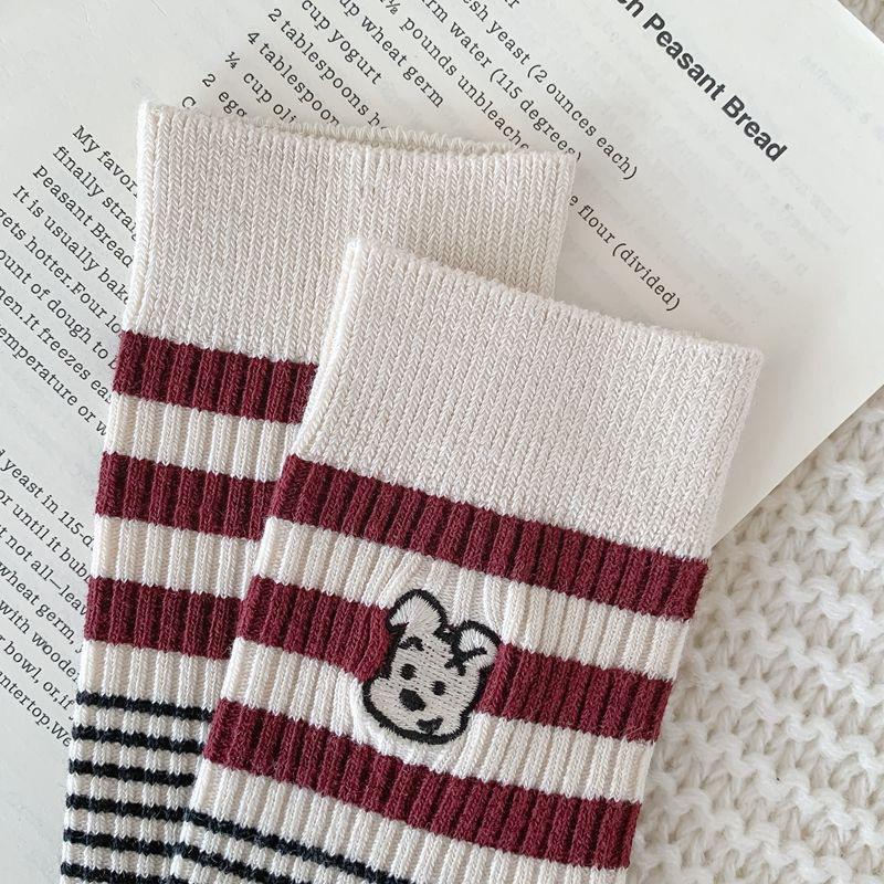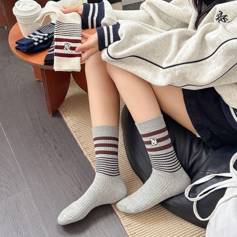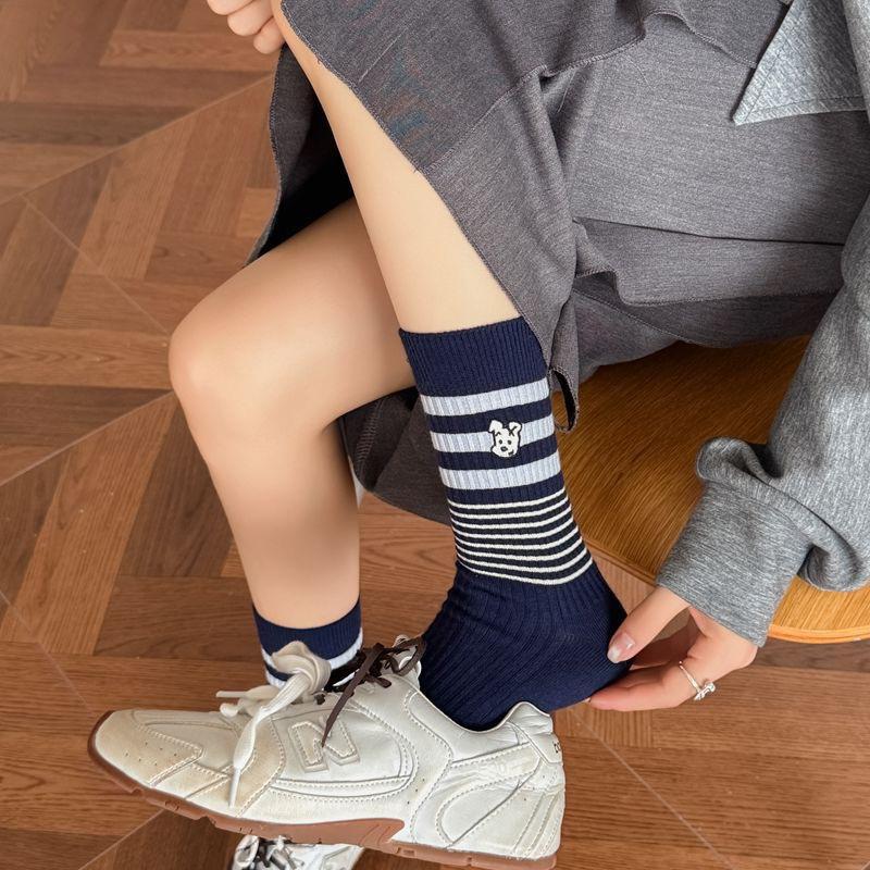 Otoño e invierno nuevos calcetines de felpa de media caña con bordado de rayas de cachorro para mujer, estilo coreano, calcetines para mujer, doble aguja, mismo estilo de Xiaohongshu, calcetines de influencer