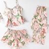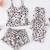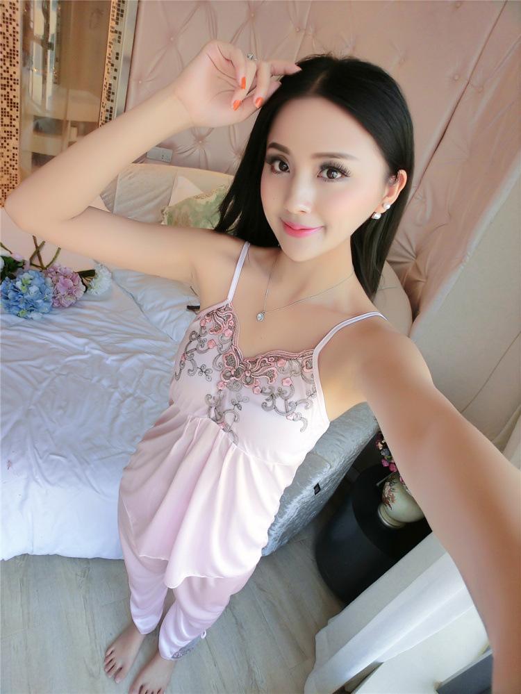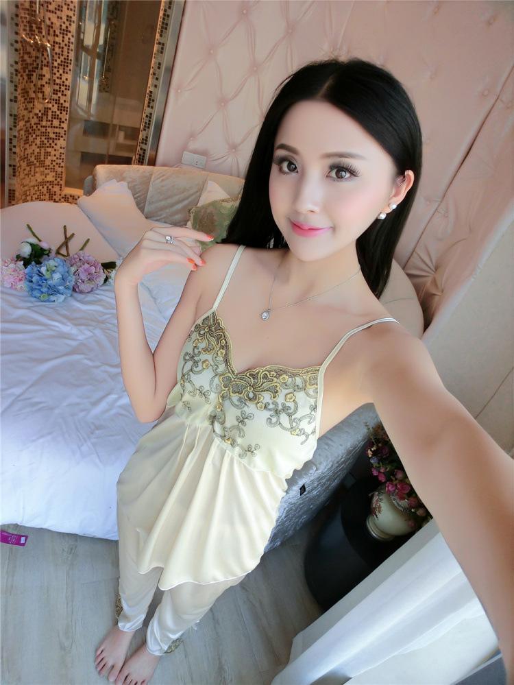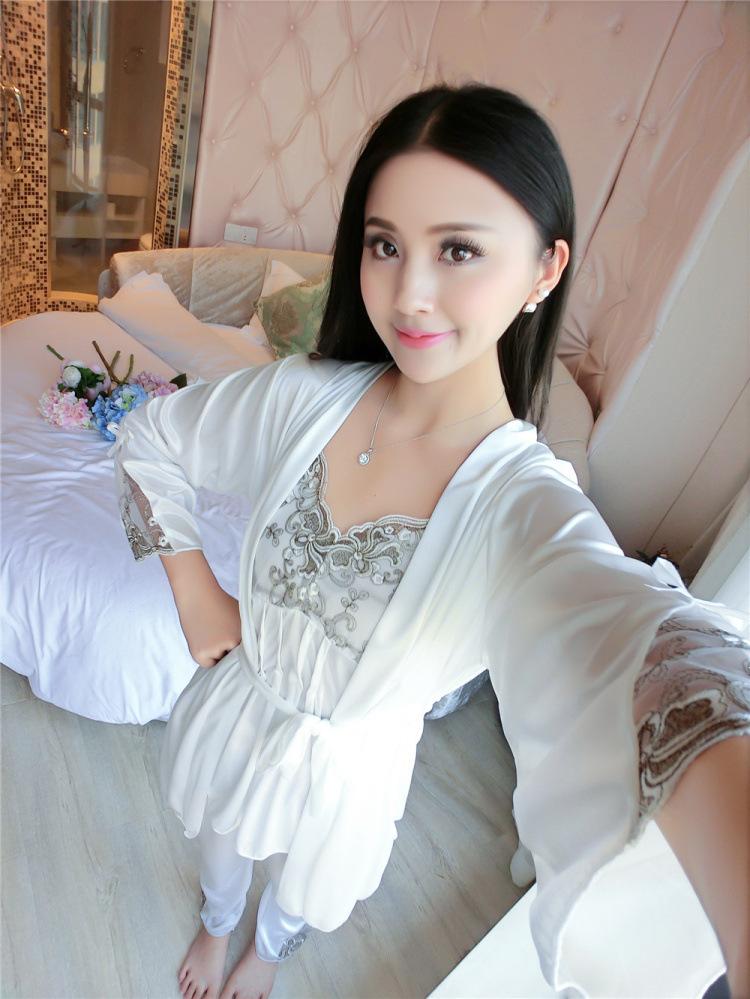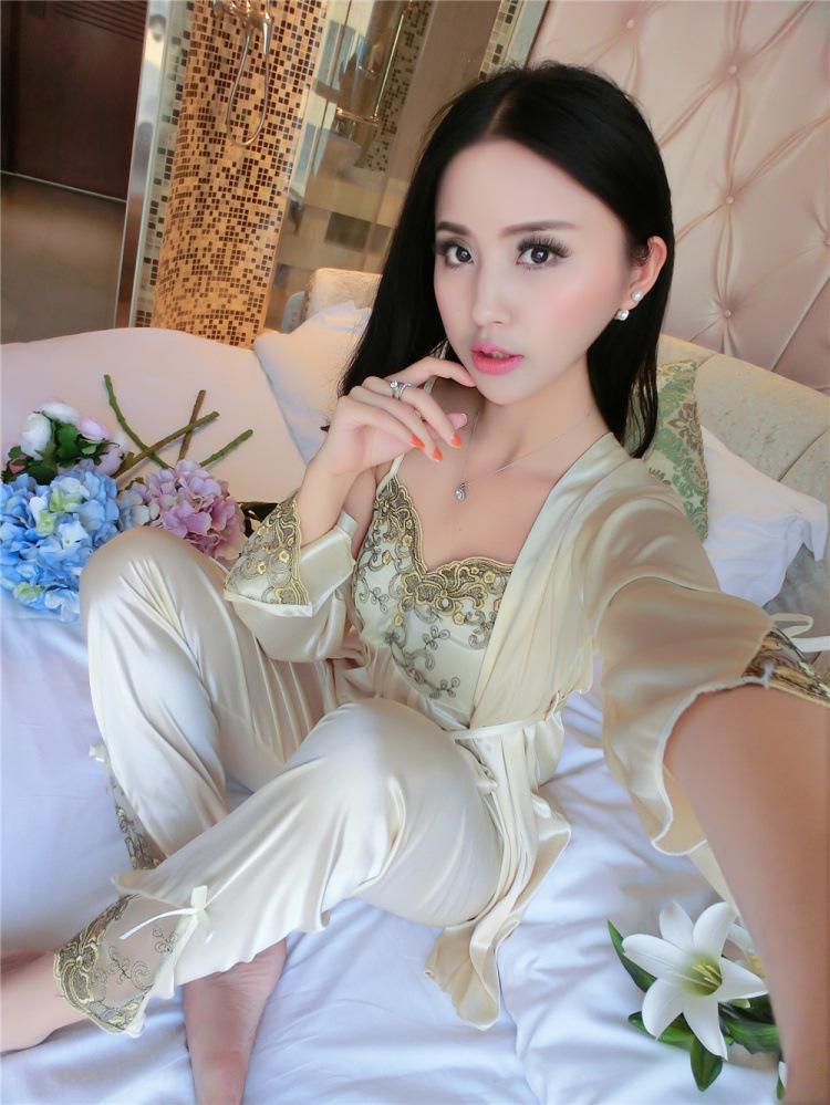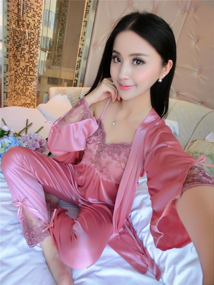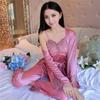 Primavera y Otoño Estilo Caliente Manga Larga Sexy Encaje Seda de Hielo Camisola Conjunto de Tres Piezas Ropa de Casa Pijama Venta al por Mayor Envío Directo
