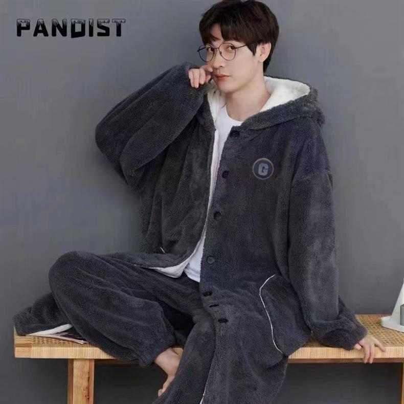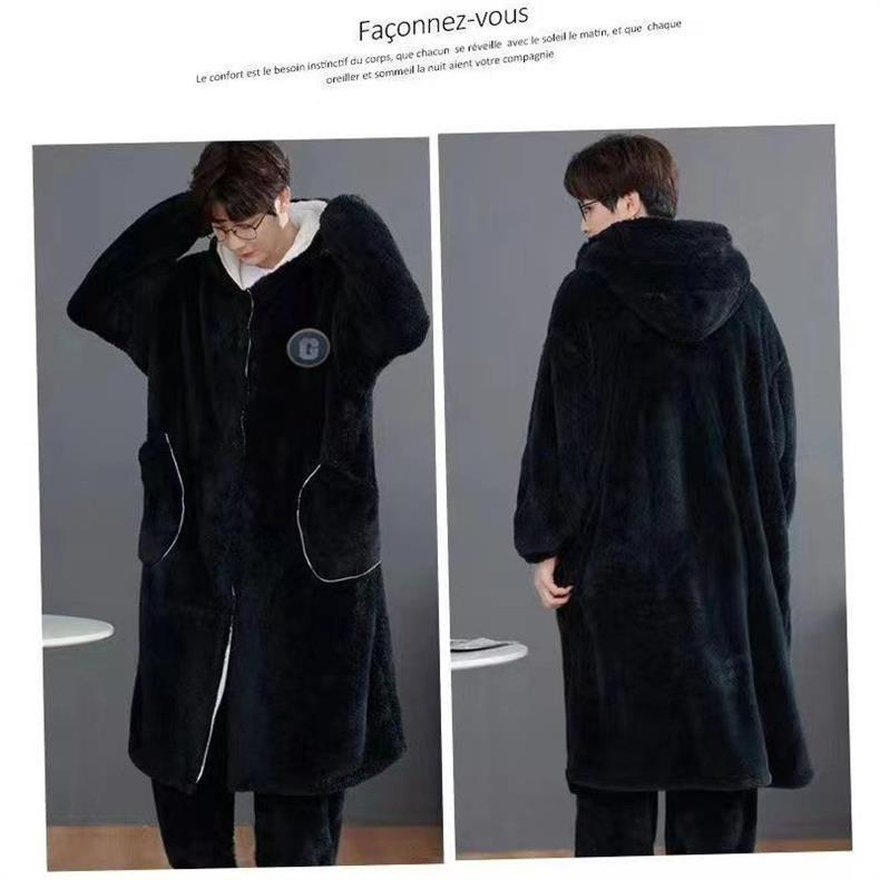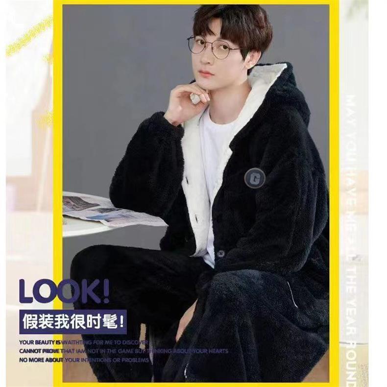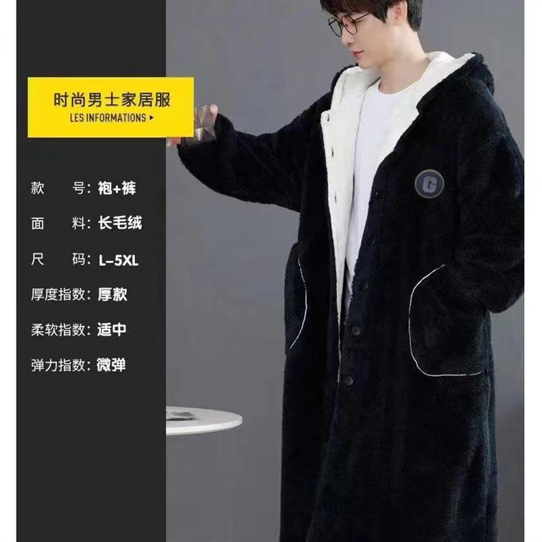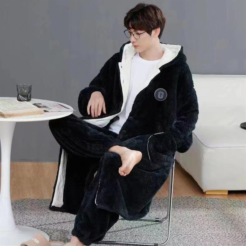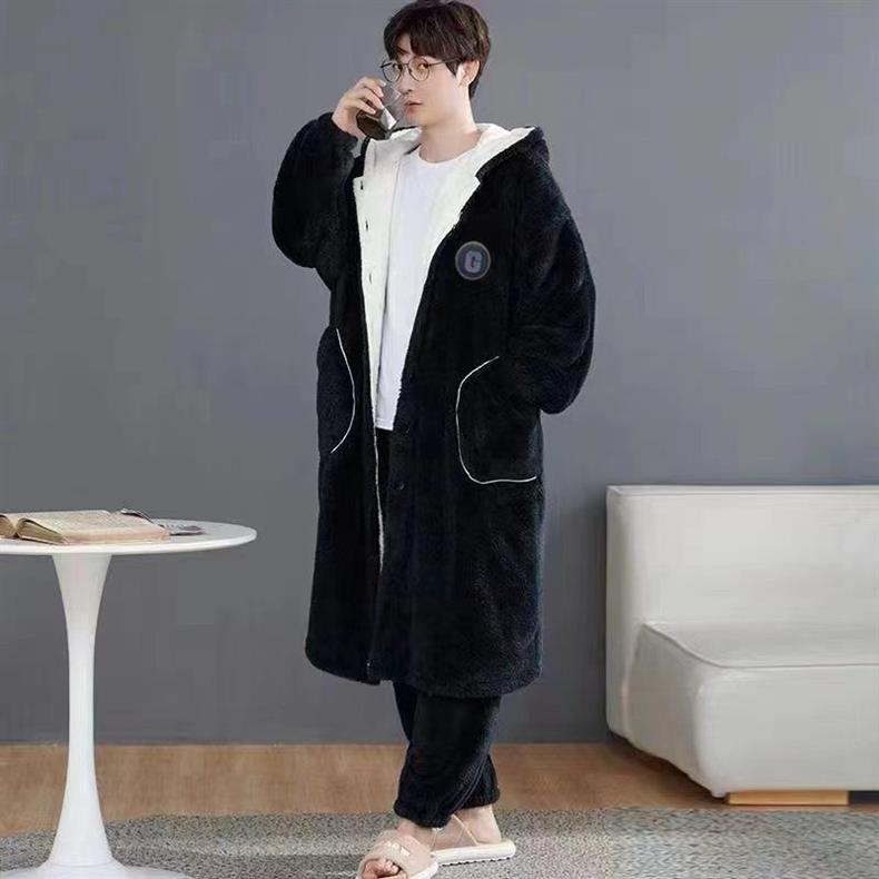 Traje de bata de invierno para hombre, pijama largo grueso de forro polar de coral con capucha y terciopelo adicional, albornoz nuevo para estudiante, ropa para el hogar