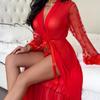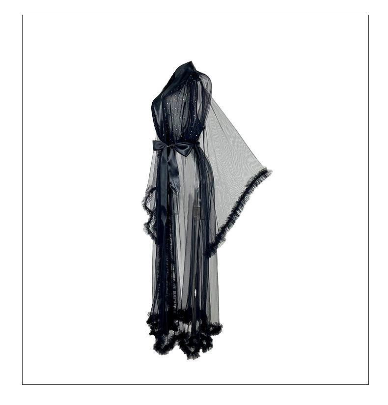 Fiyun Bata Larga Sexy de Malla Transparente para Mujer con Lentejuelas en el Pecho, Flecos en el Borde y Cinturón para Atar en la Cintura, Ropa para Casa 721