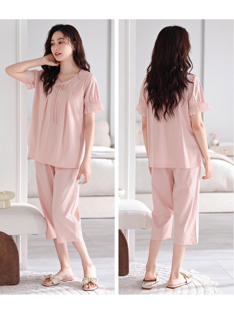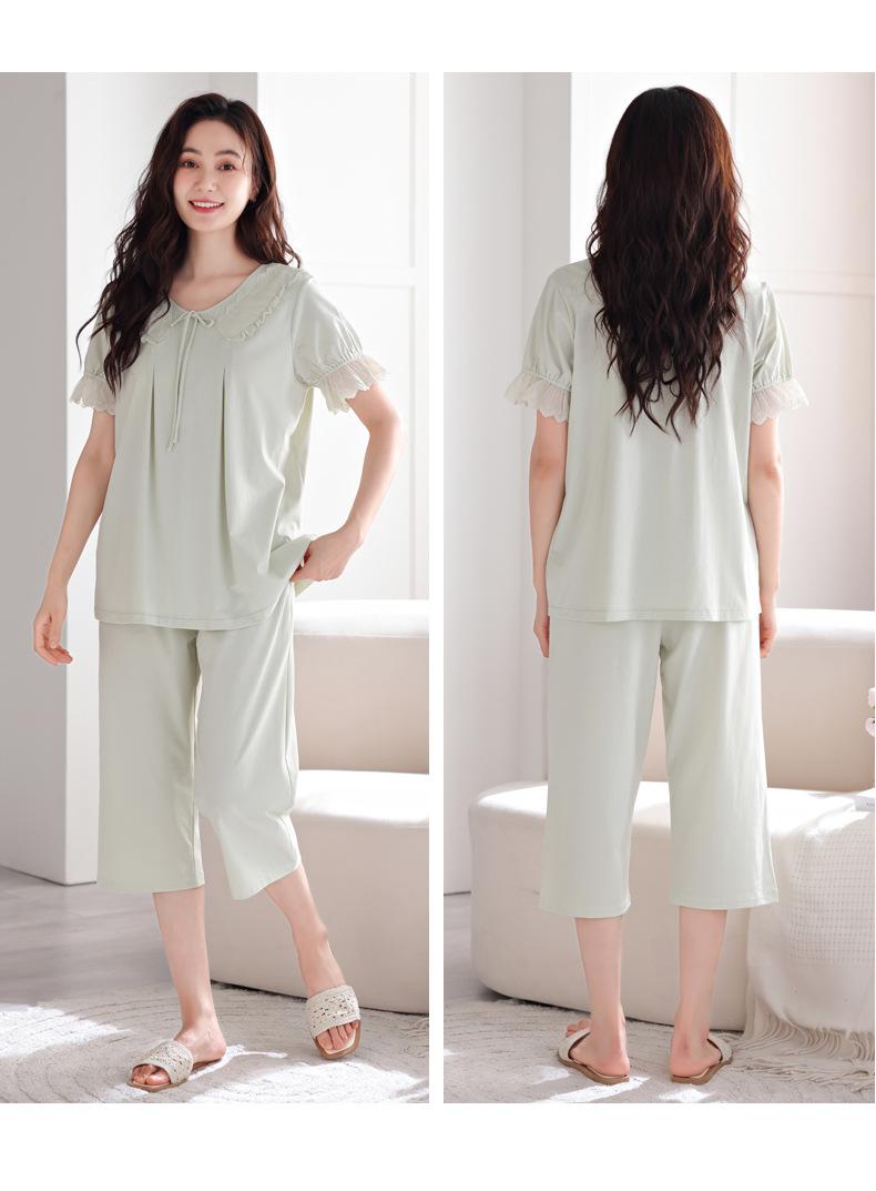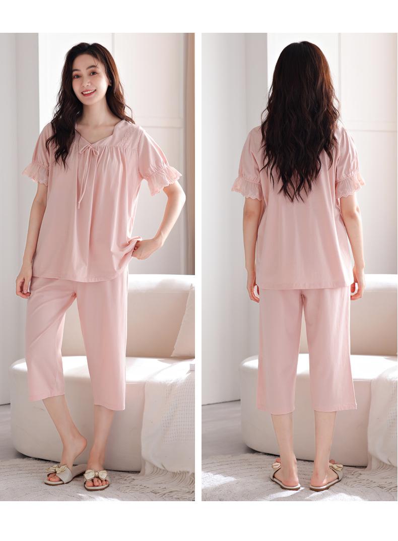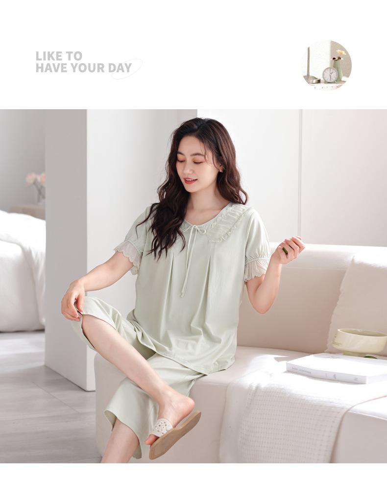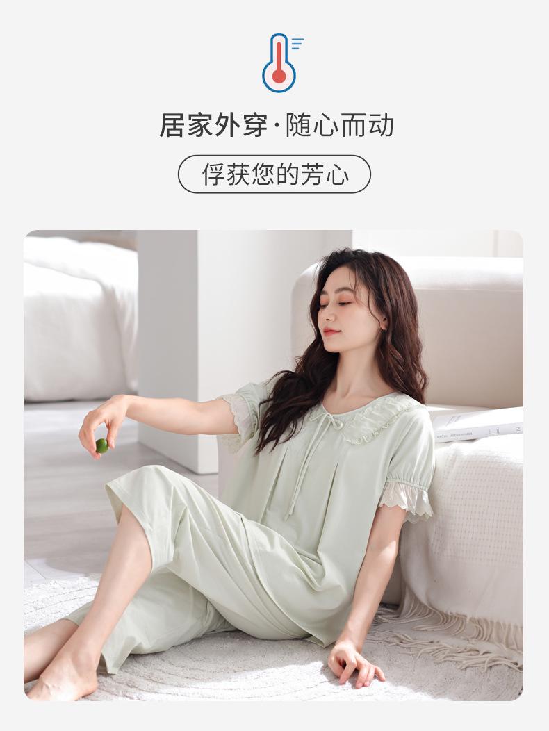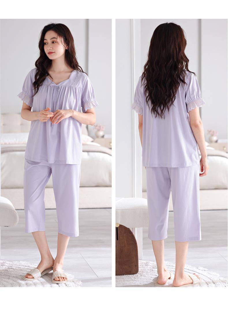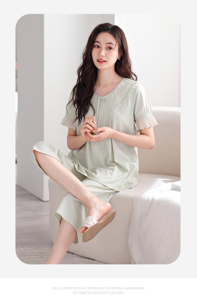 Compra Pijama de verano para mujer de algodón de manga corta y pantalones capri, ropa para el hogar 2024 Nuevo traje delgado de dos piezas con almohadilla en el pecho al por mayor en Joom.pro