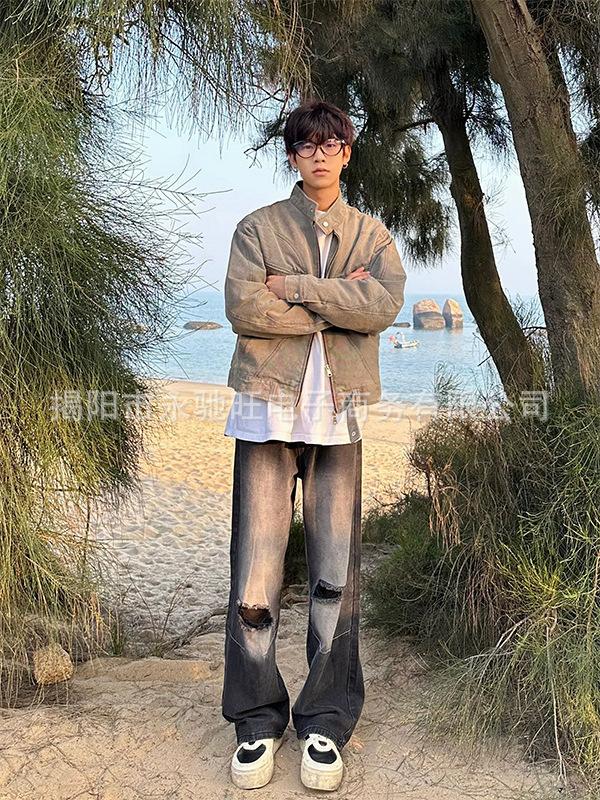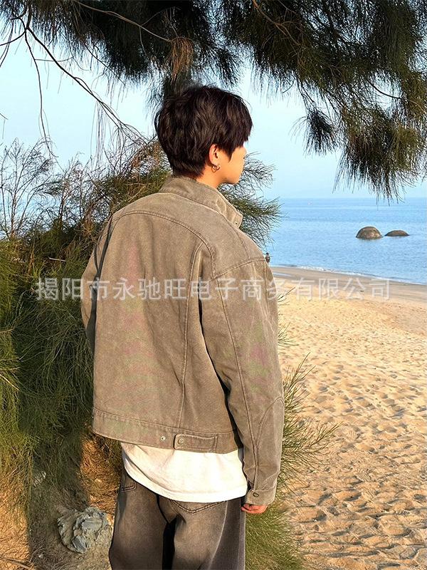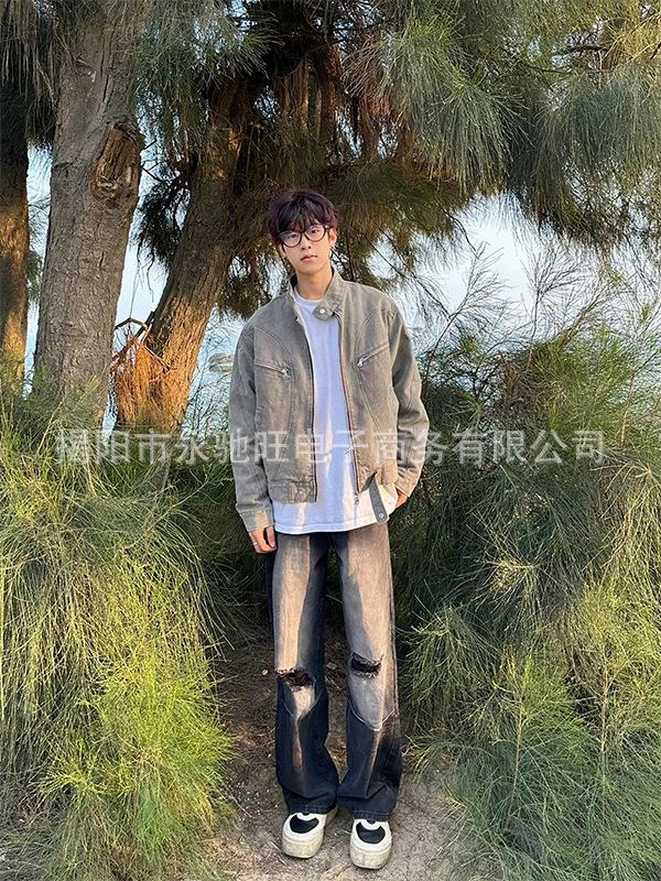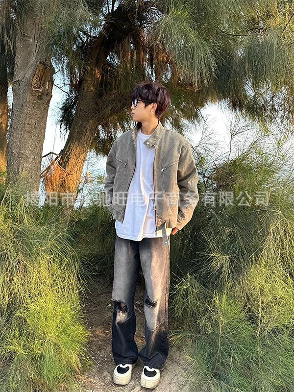 Chaqueta Corta Nueva con Cremallera para Primavera y Otoño Abrigo Moda Americana Retro Lavado Abrigo de Mezclilla con Cuello Vertical para Hombre y Mujer