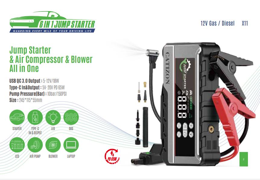 La corriente pico del arrancador de emergencia automotriz de 24800 mAh es de 6000 A, que admite bombas de aire, sopladores, compresores, luces LED, SOS y varias funciones de carga rápida bidireccional PD65W.. Asegurar que los bienes cumplen con los estándares internacionales de seguridad y proporcionar a los usuarios acceso al mercado y fiabilidad.