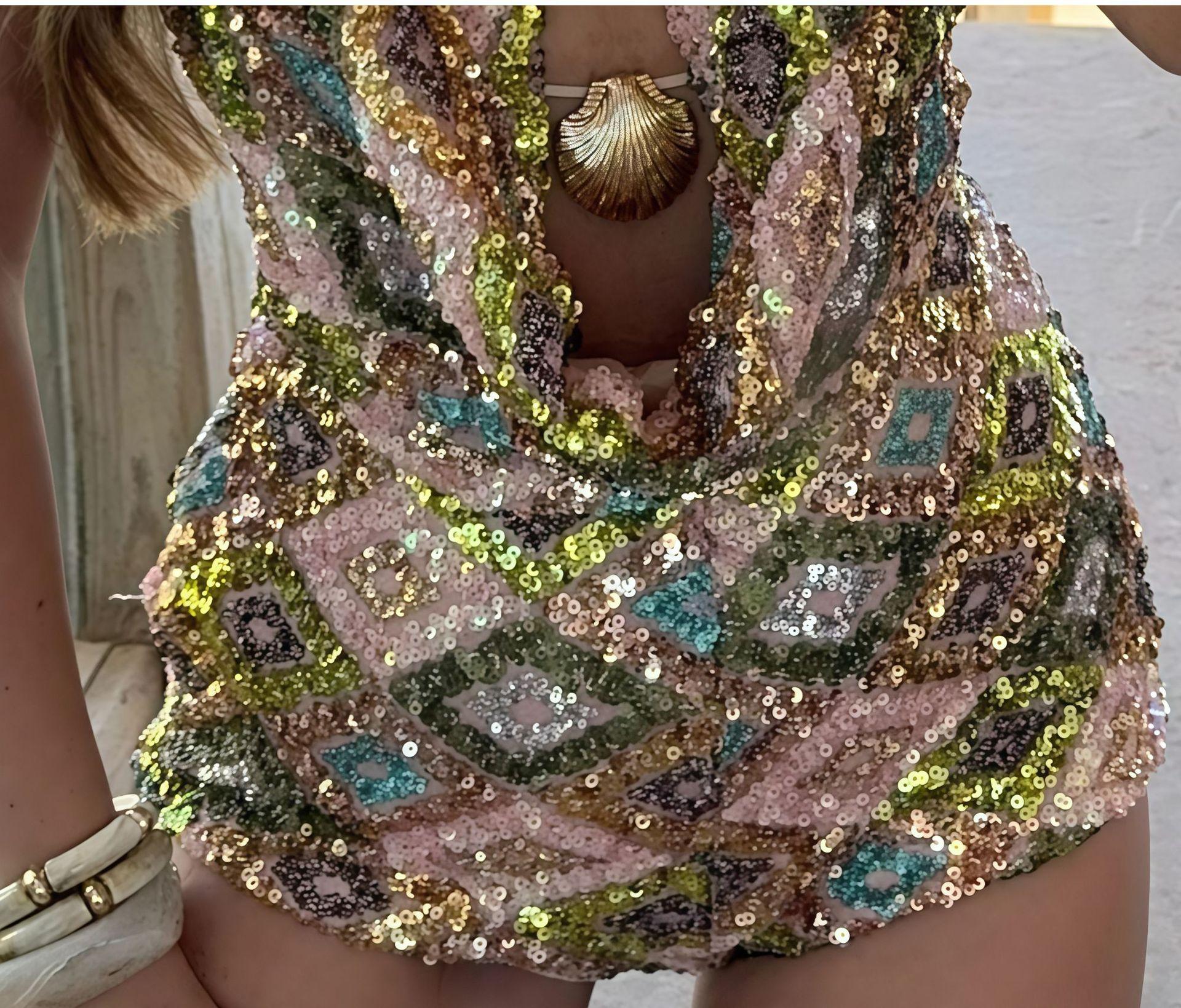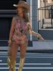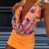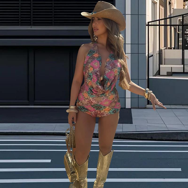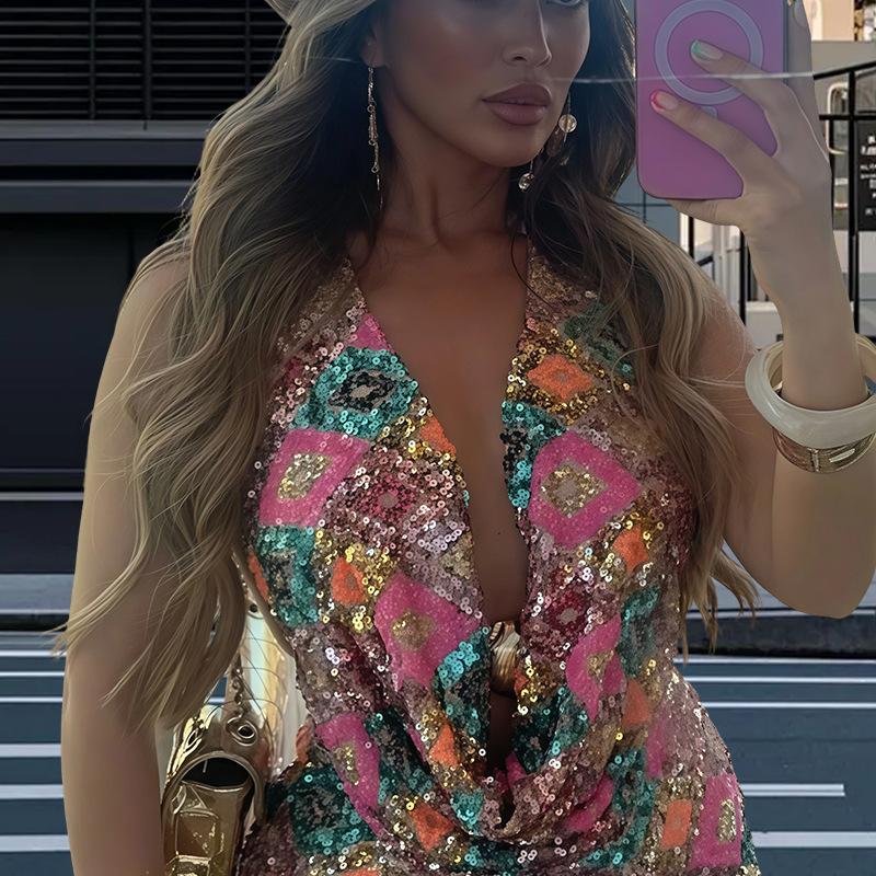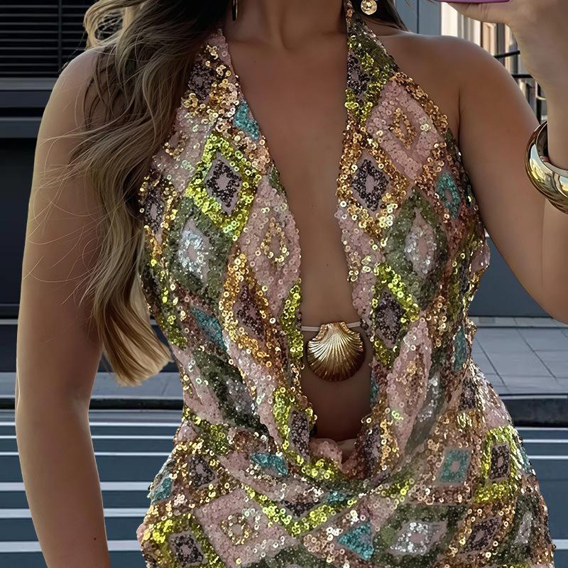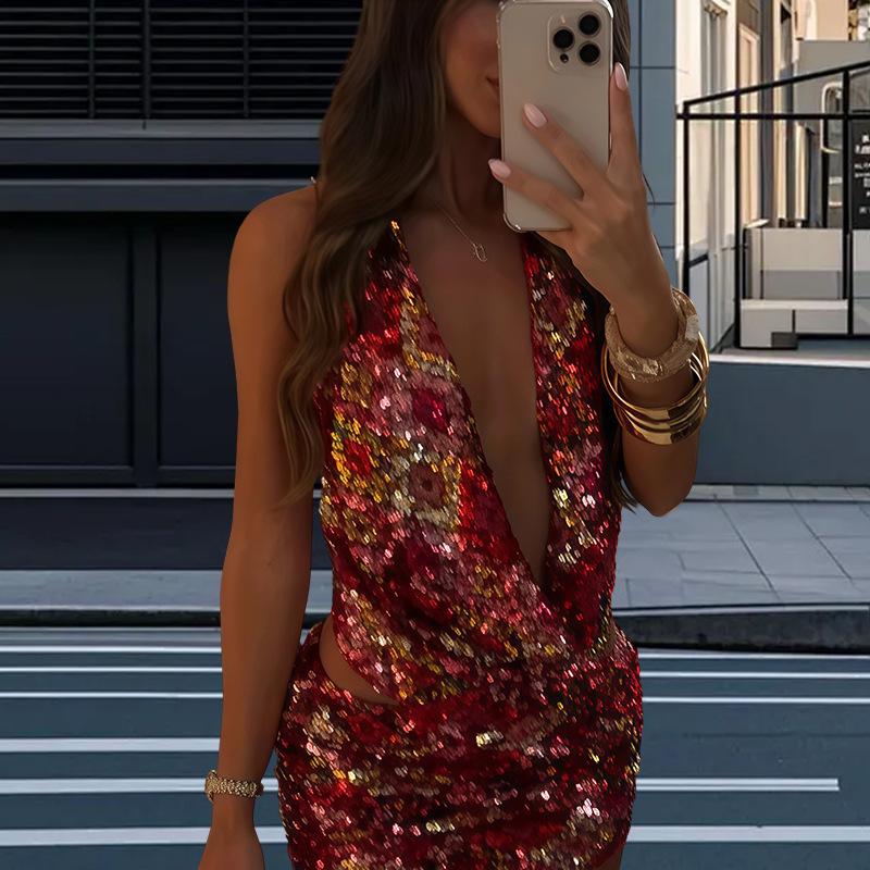 Conjunto de Falda Corta Transfronterizo Europeo y Americano Ropa de Mujer 2025 Sexy Escote Profundo Espalda Descubierta Lentejuelas Floral Temperamento Halter Tirantes Conjunto