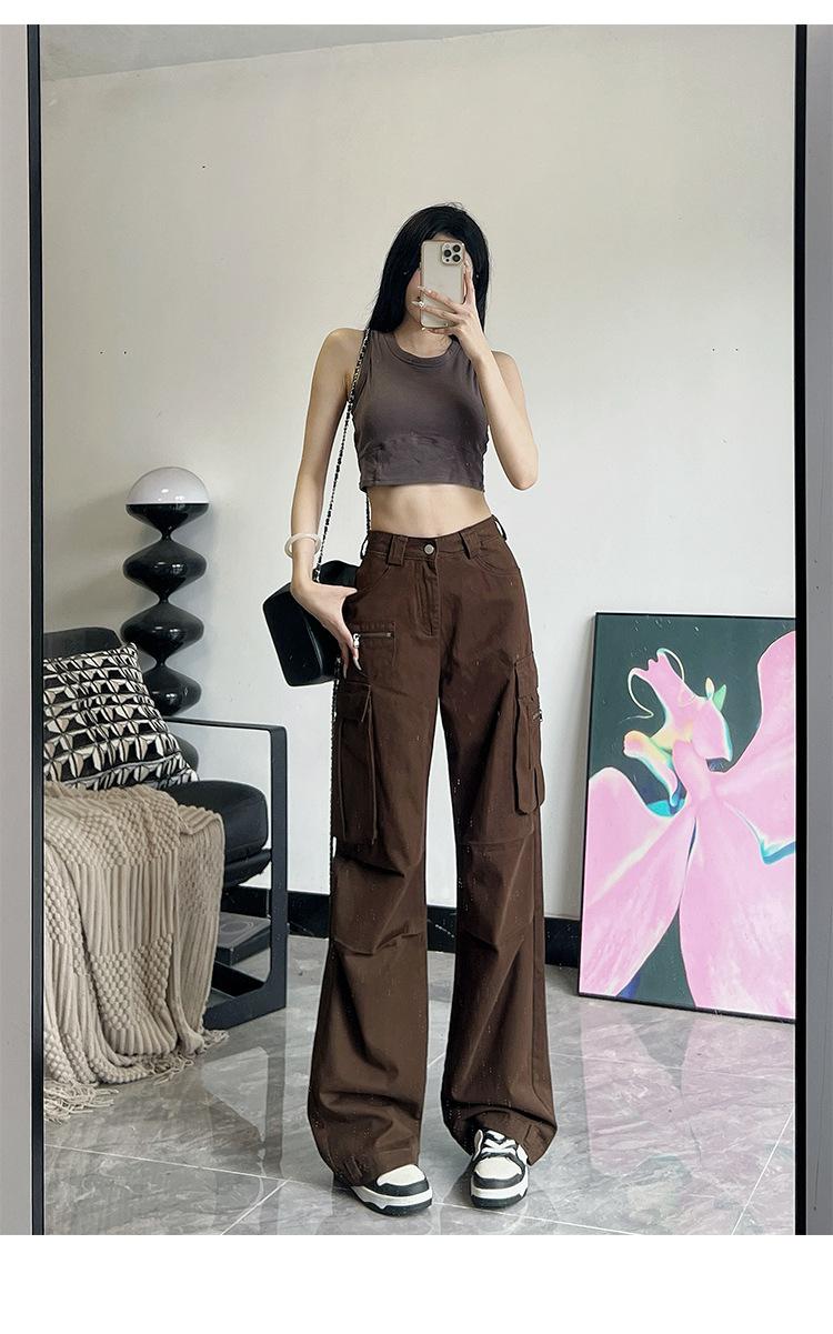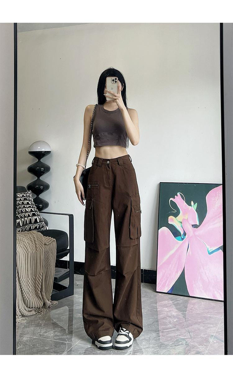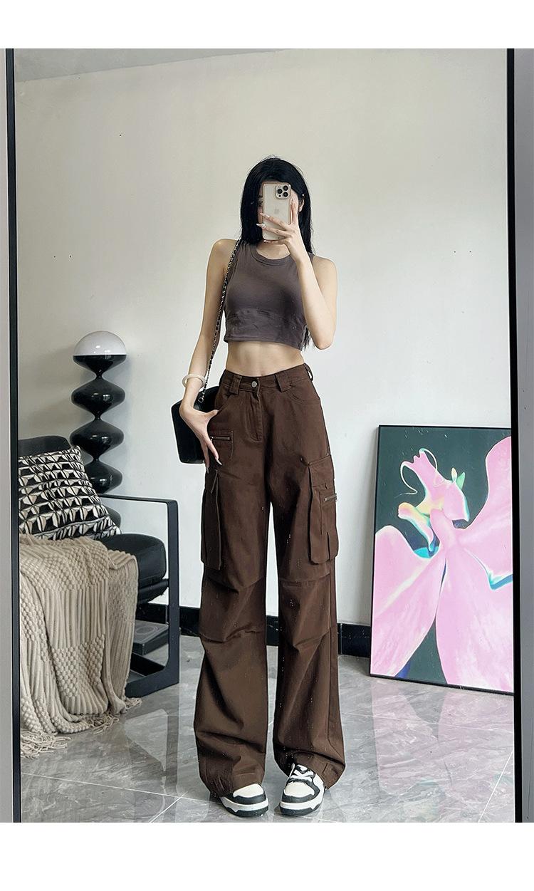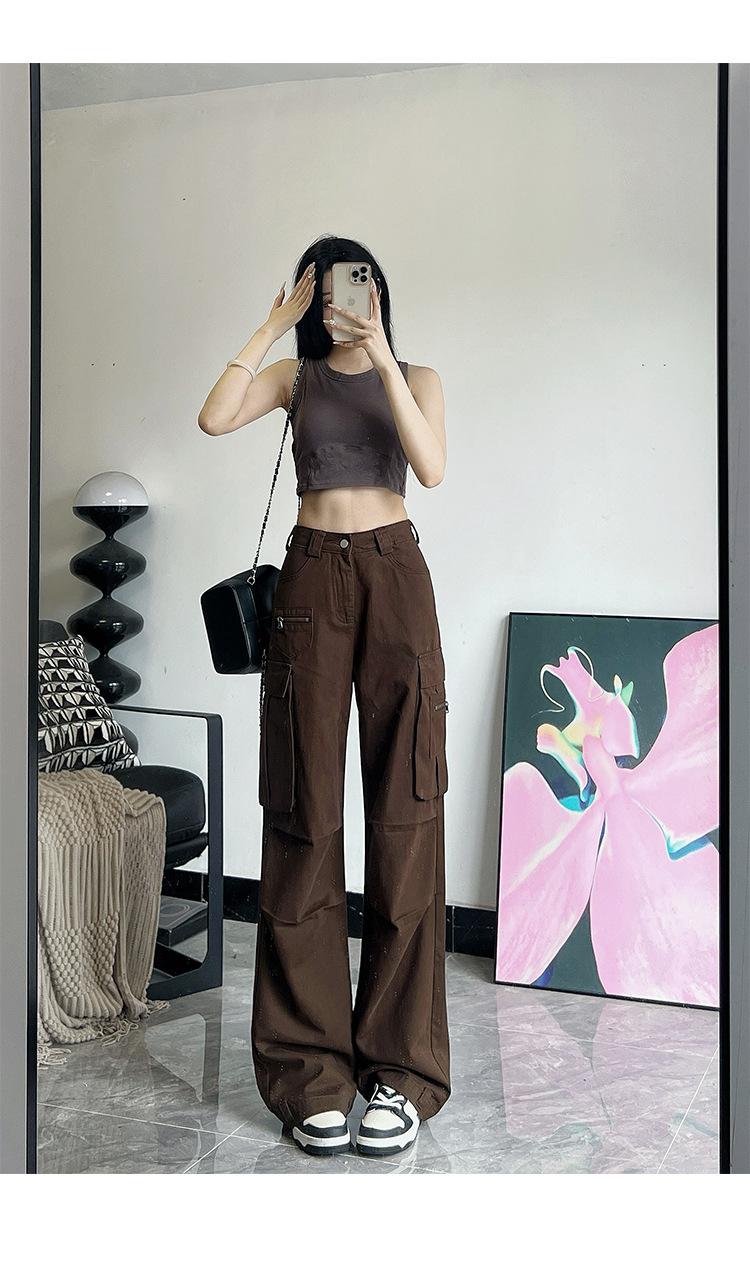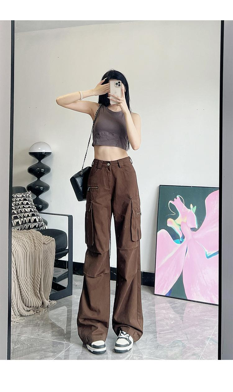 Compra Pantalones cargo plisados de estilo americano cool y vanguardista para mujer, primavera y otoño, diseño multibolsillo, vintage, holgados, rectos, largos hasta el suelo, de pierna ancha al por mayor en Joom.pro