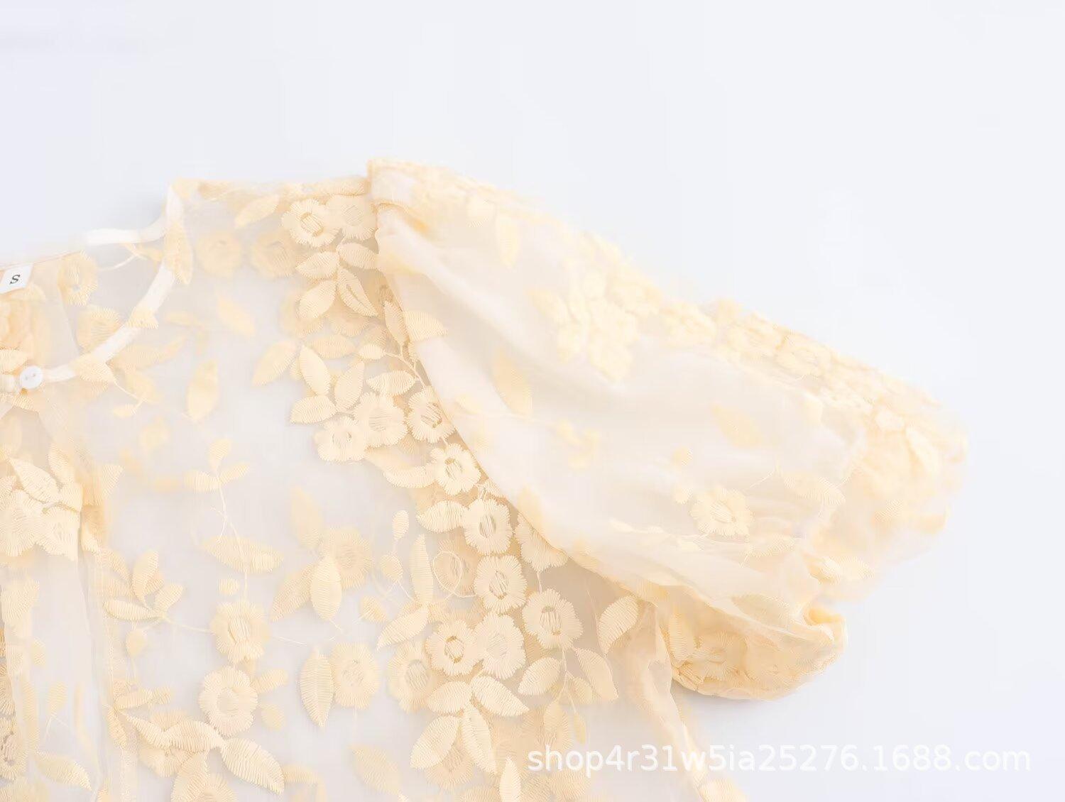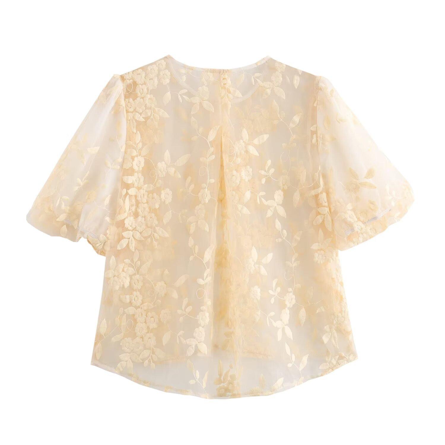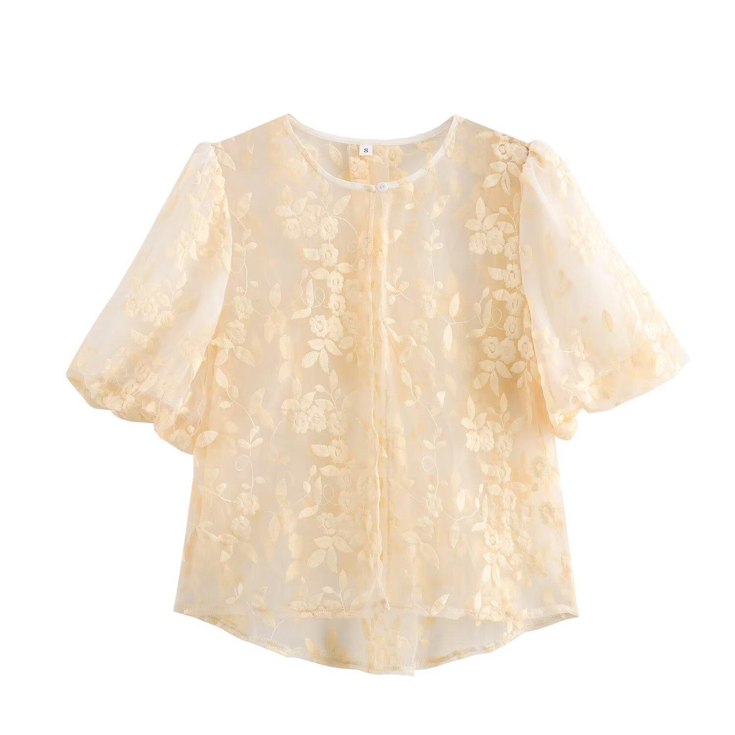 Estilo Europeo y Americano 2024 Verano Nuevo Camisetas Tops de Mujer de Cuello Redondo Manga Abullonada Sexy Transparente Bordado Floral Venta al por Mayor