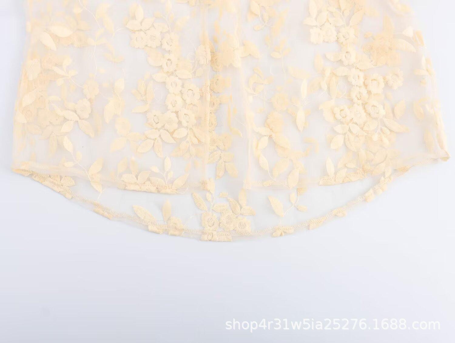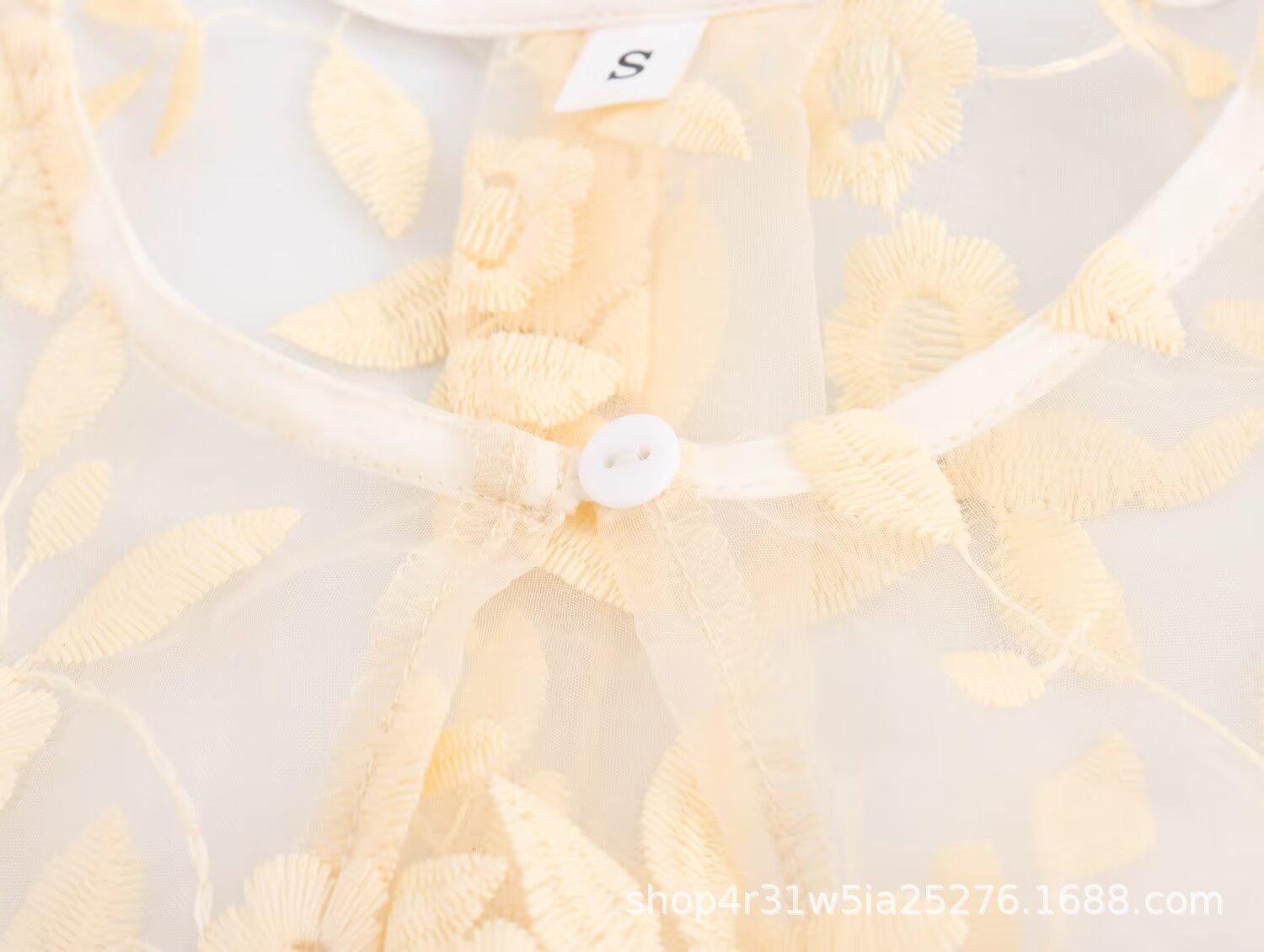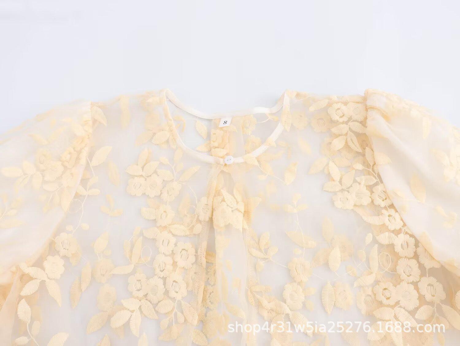 Estilo Europeo y Americano 2024 Verano Nuevo Camisetas Tops de Mujer de Cuello Redondo Manga Abullonada Sexy Transparente Bordado Floral Venta al por Mayor