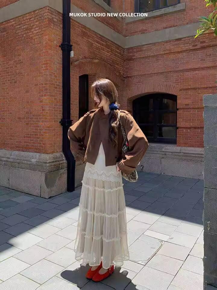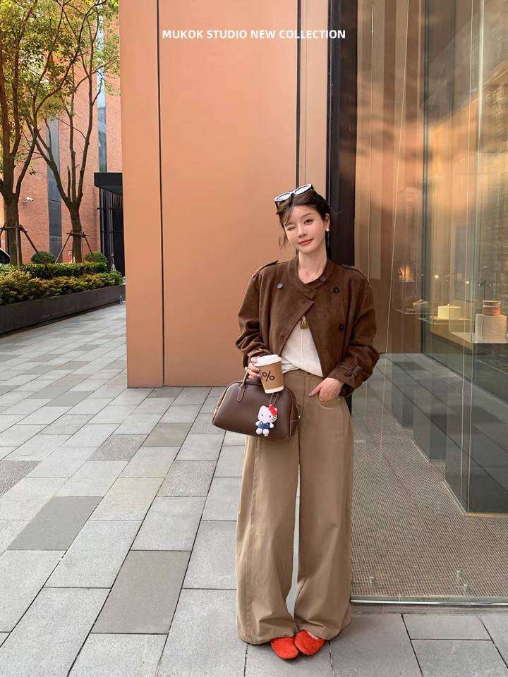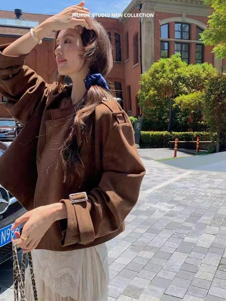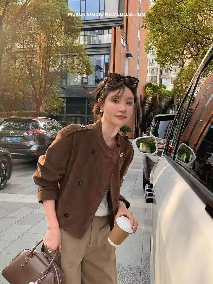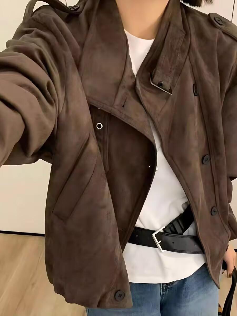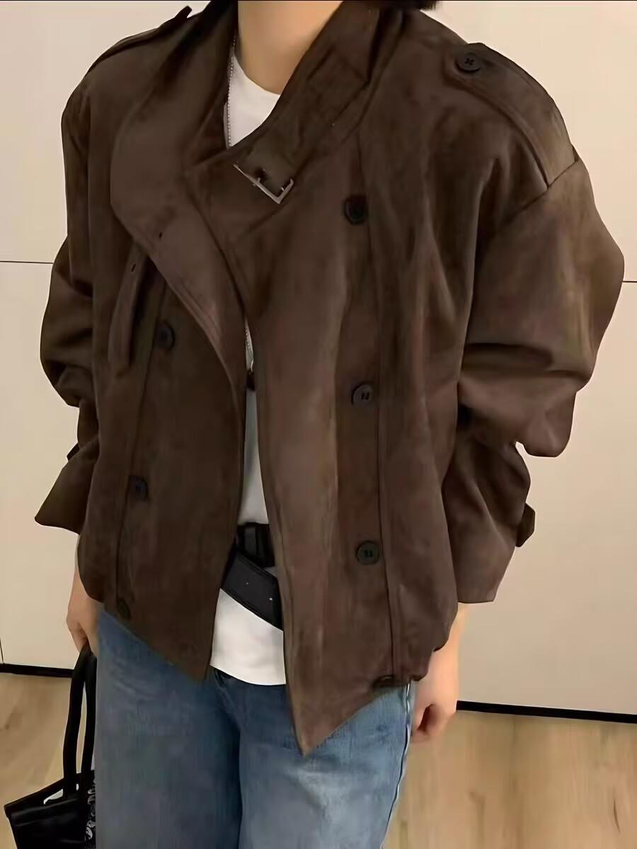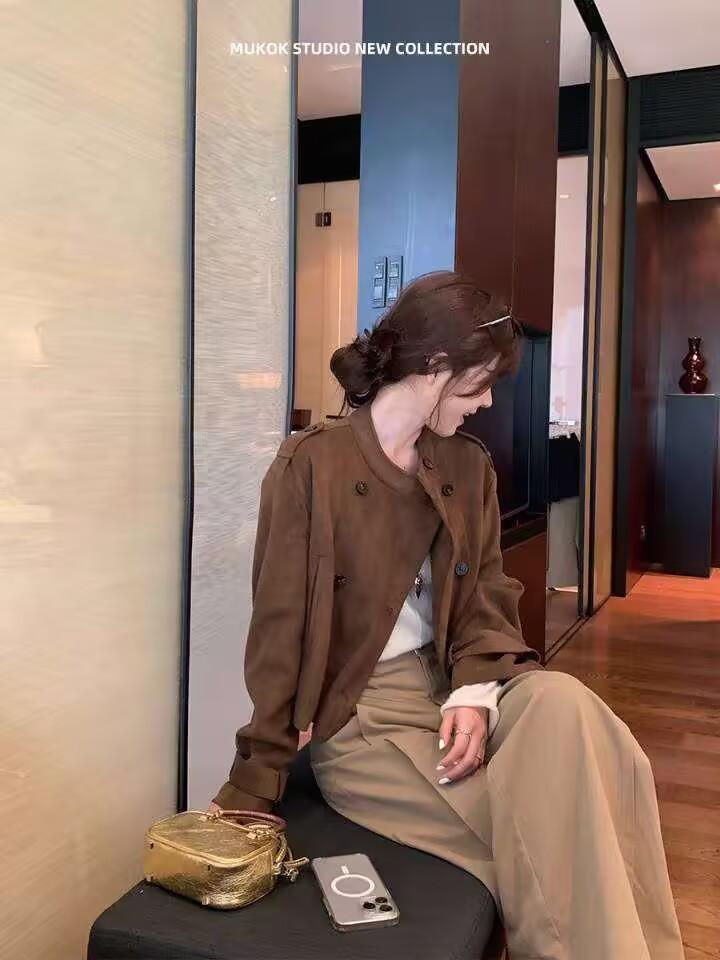 Abrigo Trench Corto de Gamuza Retro de Moda de Alta Gama para Mujer 2025 Otoño Nuevo Estilo Coreano Suelto Cuello Alto Top