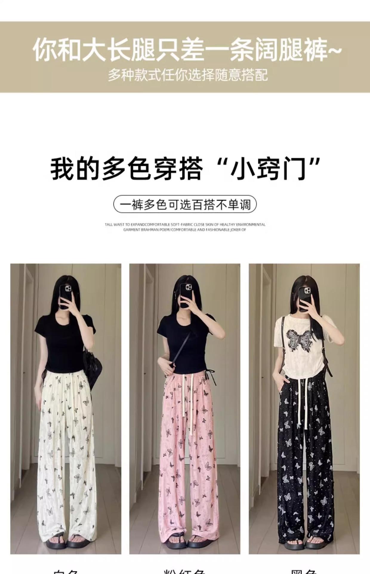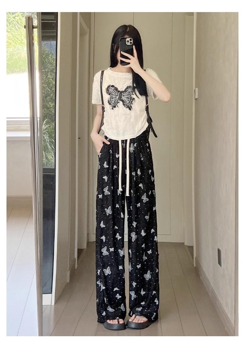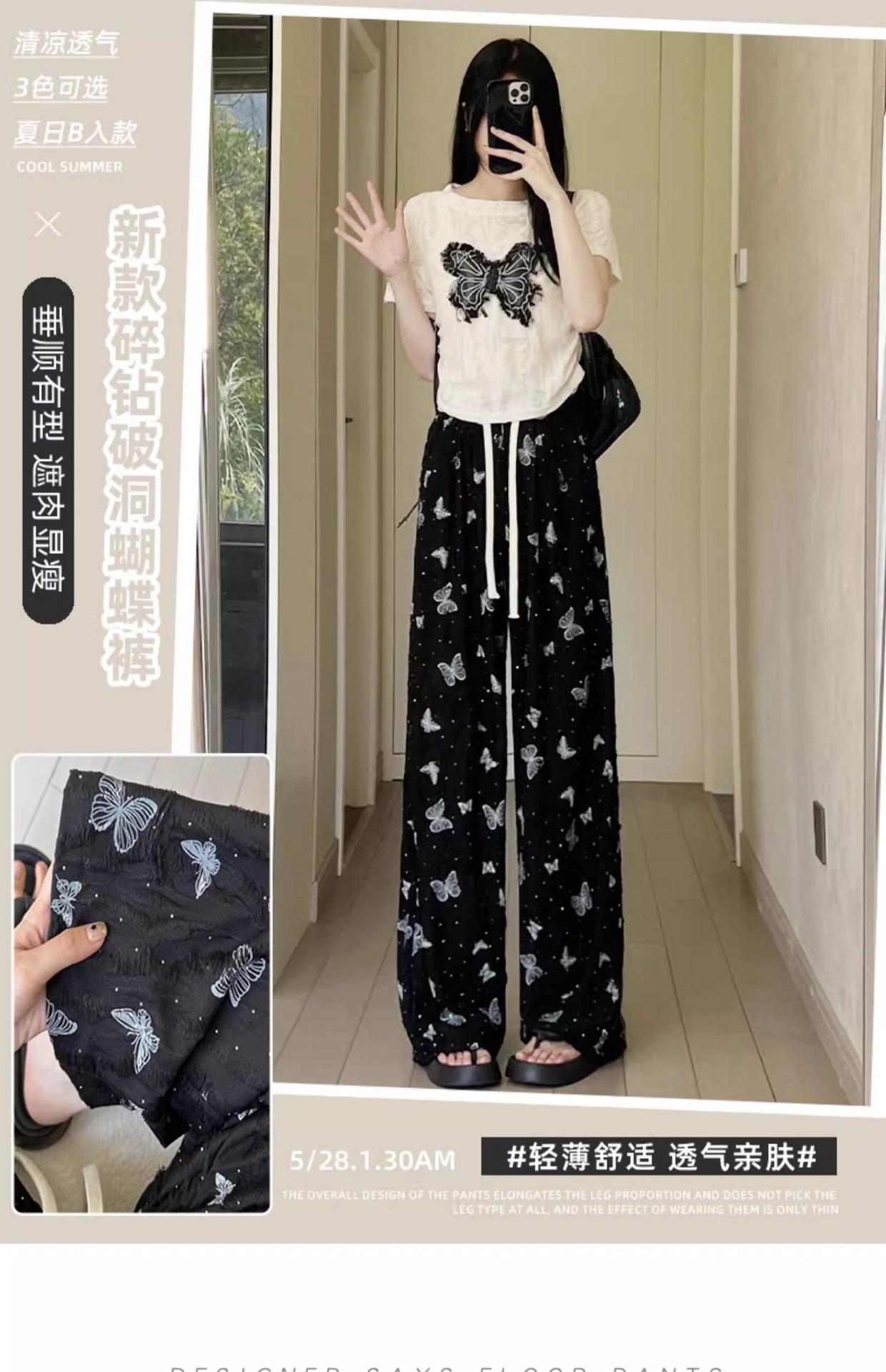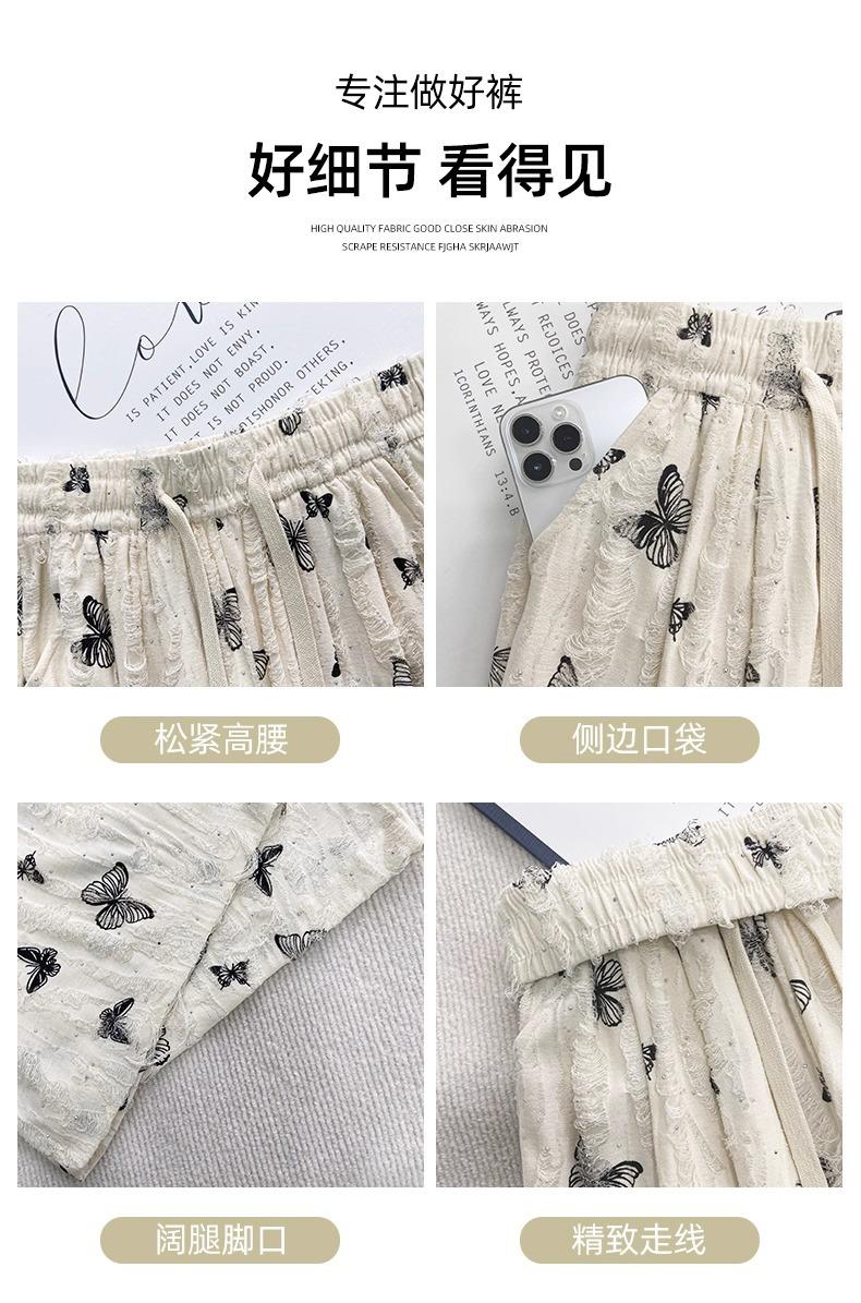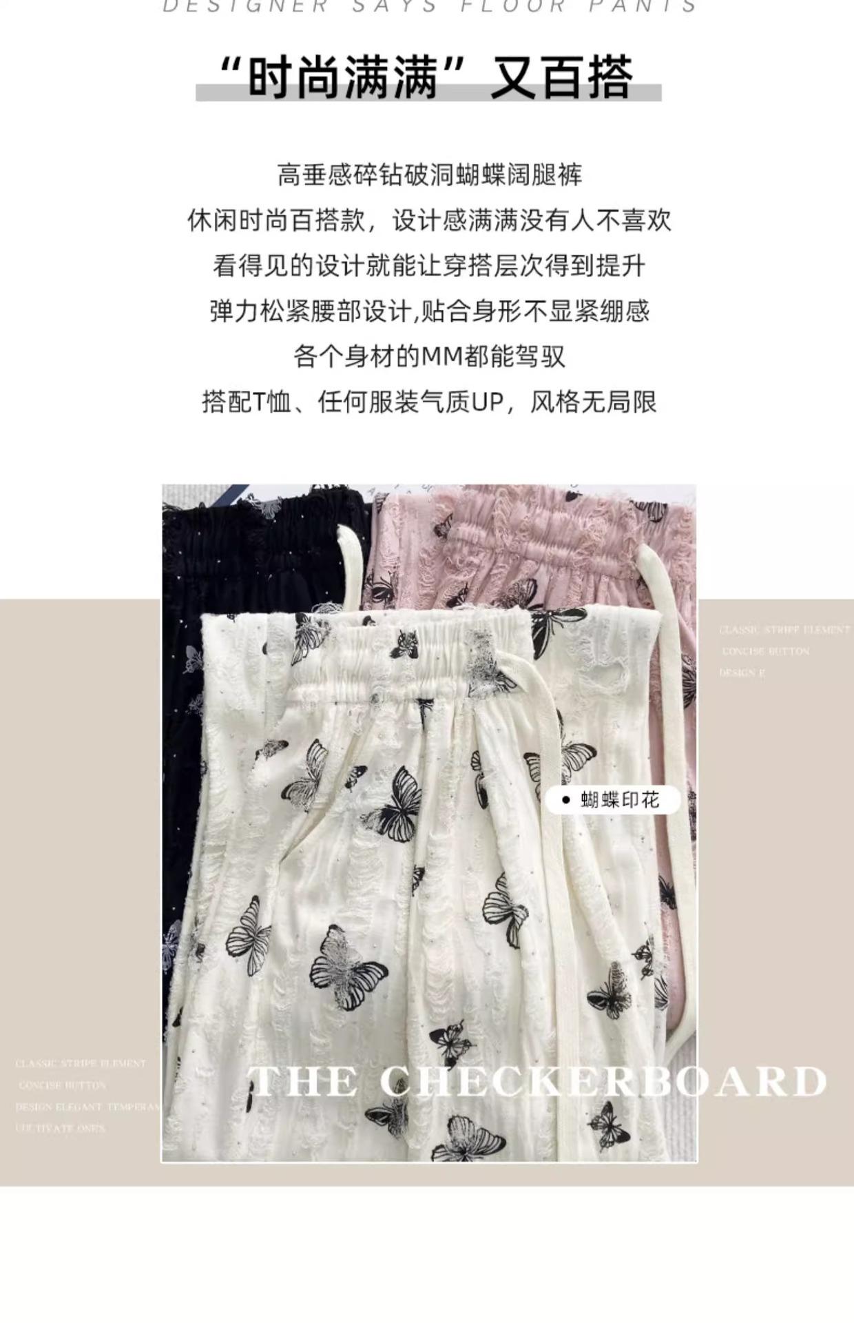 Pantalones anchos rasgados con estampado de mariposas de talla grande 300 jin grasa mm para mujer verano delgados sueltos de pierna recta casuales de seda helada