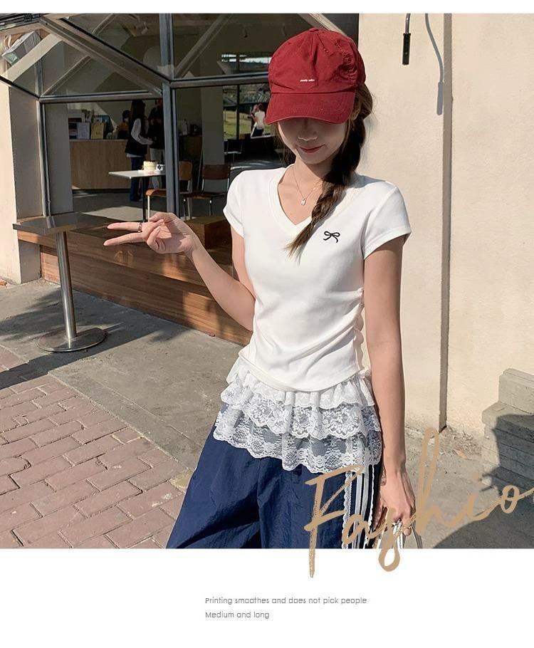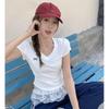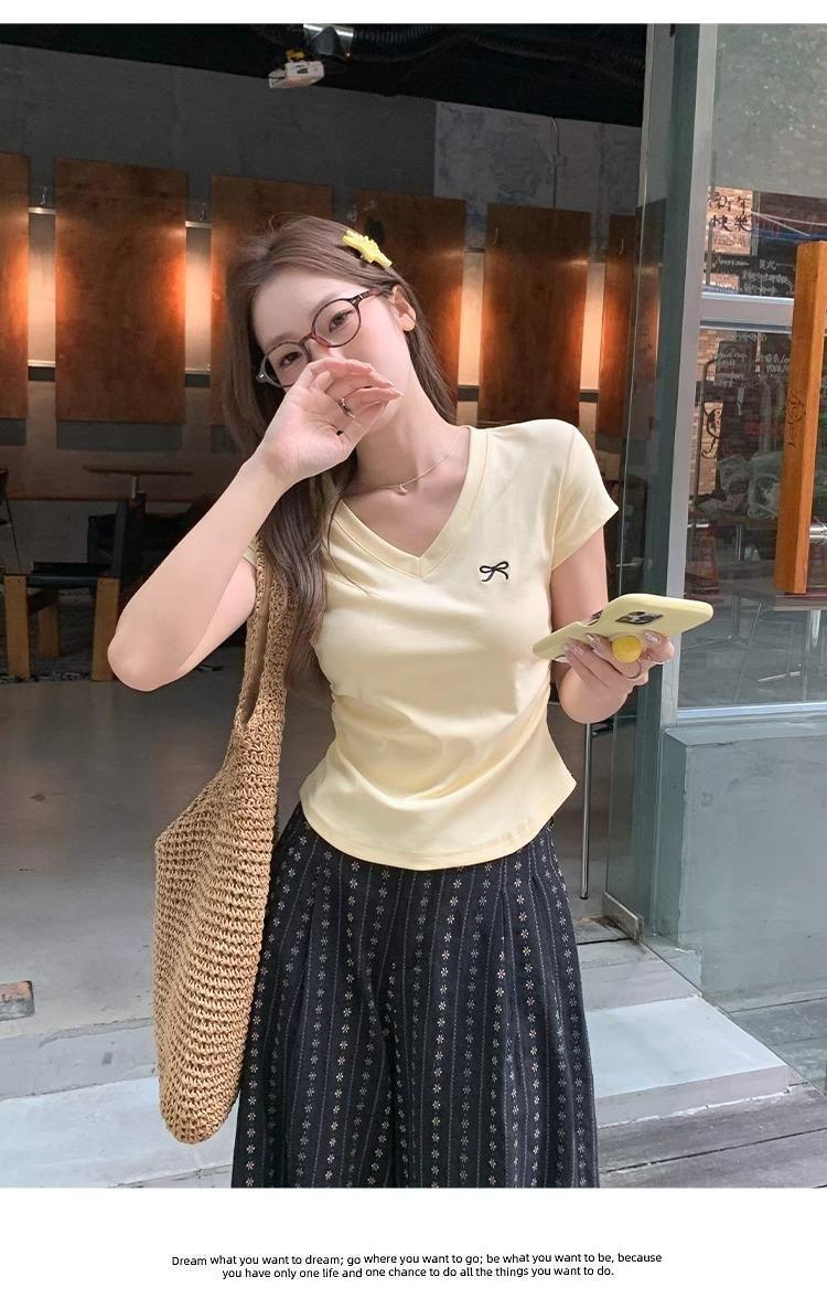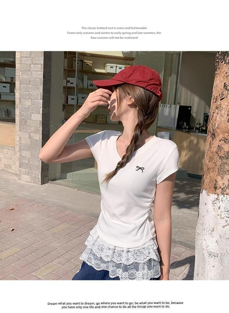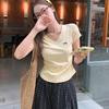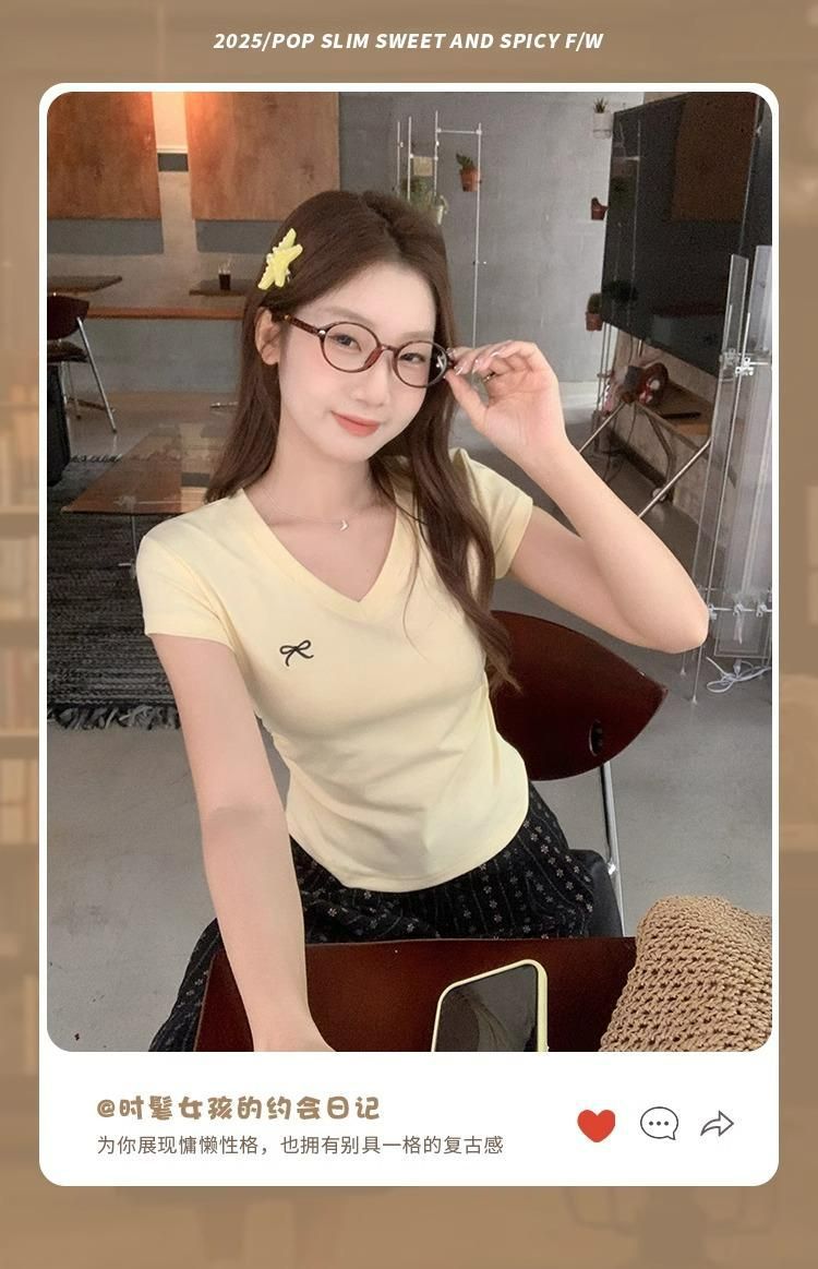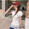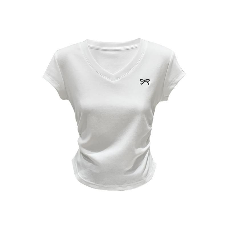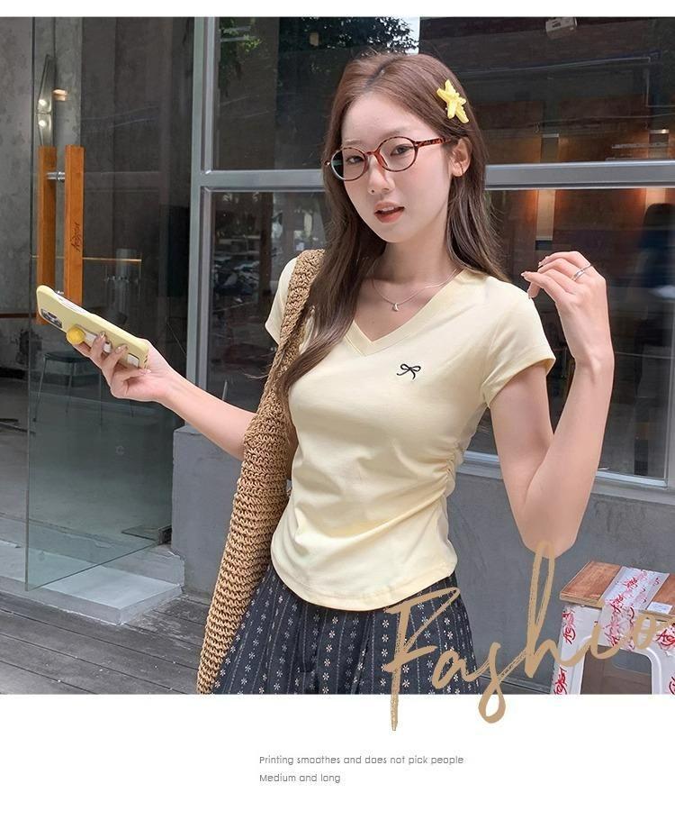 Compra Camiseta de Verano para Mujer con Cuello en V de Hombro Derecho, Manga Corta, Nuevo Estilo, Diseño de Cintura Plisada, Slim, Sexy, Corta, Top Bordado para Mujer al por mayor en Joom.pro
