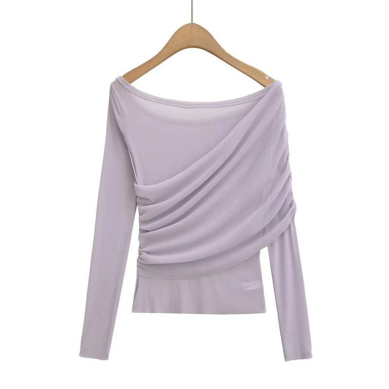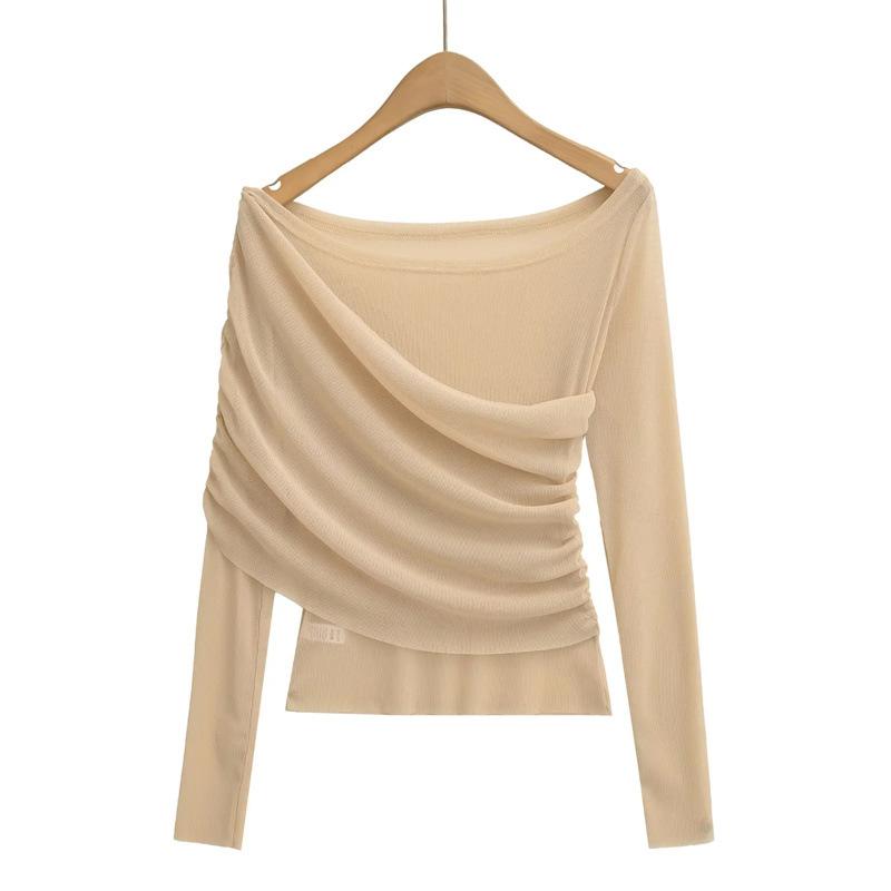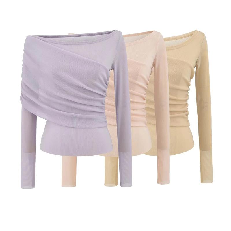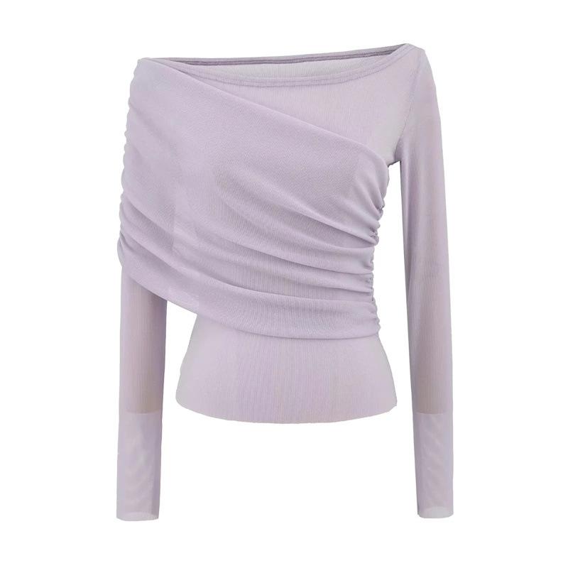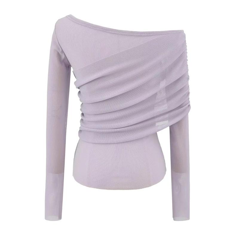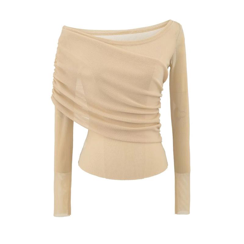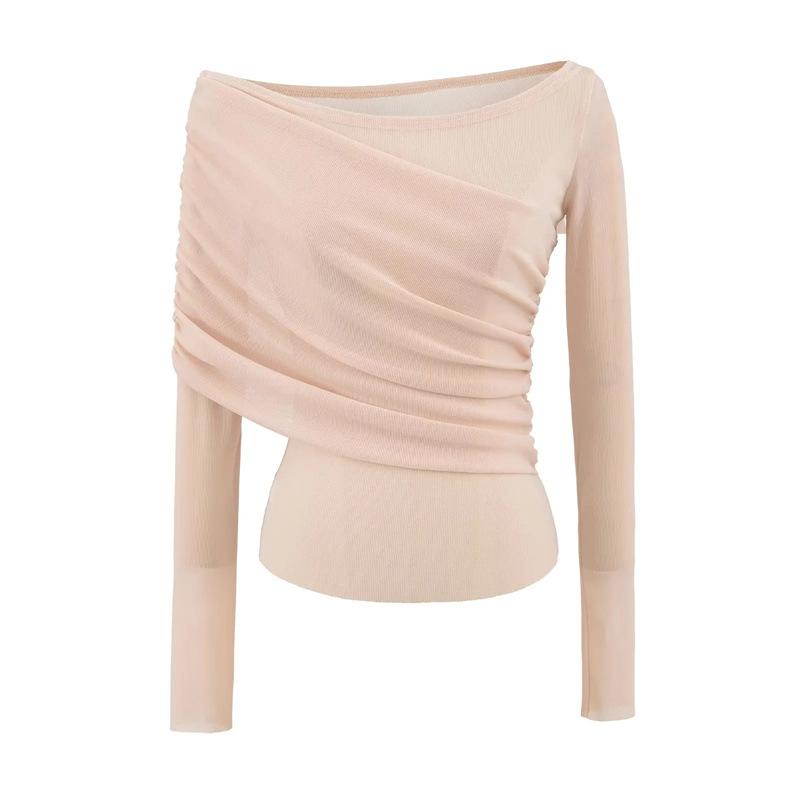 Playera de malla pura y sexy de un hombro y manga larga, nueva de otoño, estilo extranjero, corte ajustado, plisada, corta, top de chica caliente para mujer