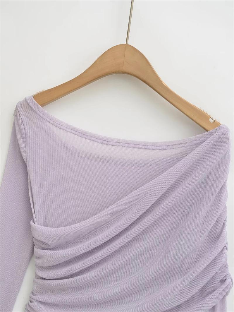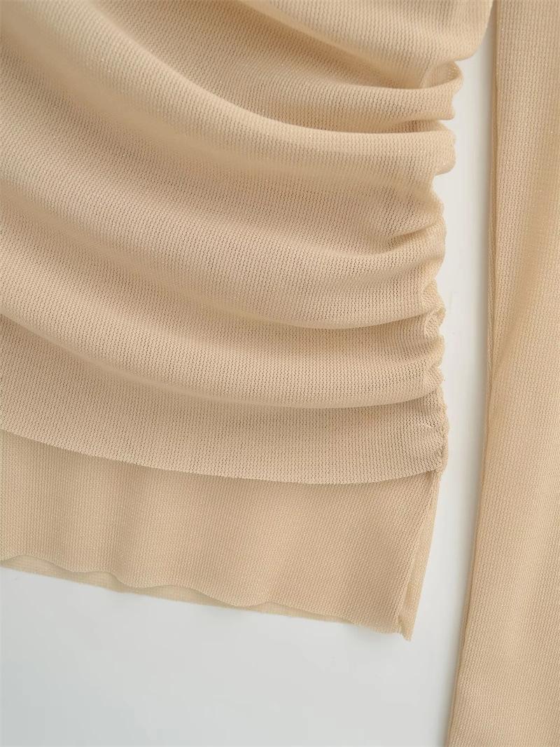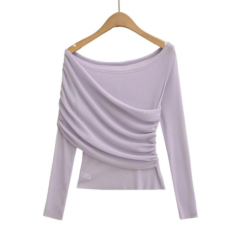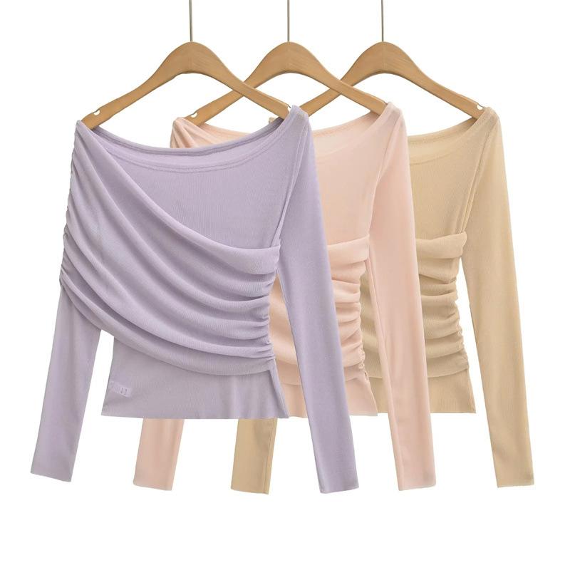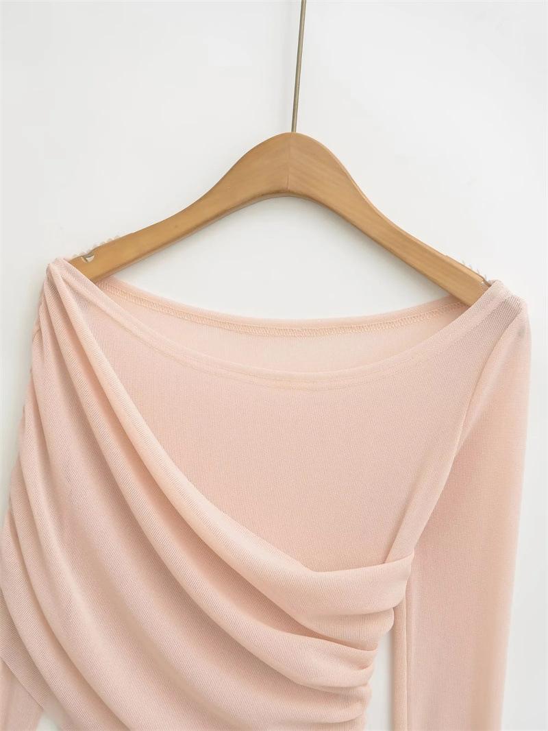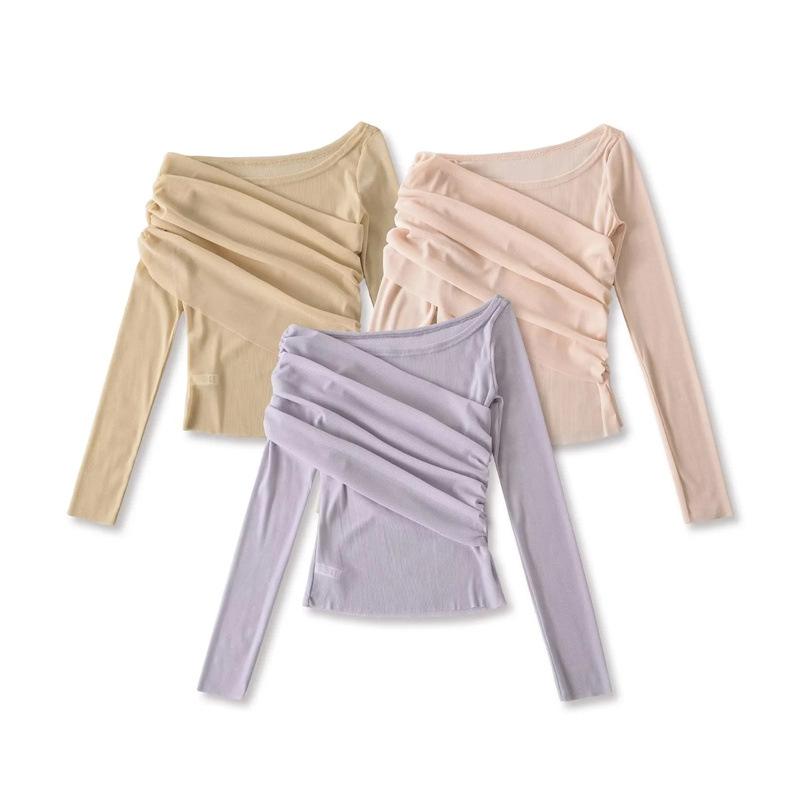 Playera de malla pura y sexy de un hombro y manga larga, nueva de otoño, estilo extranjero, corte ajustado, plisada, corta, top de chica caliente para mujer