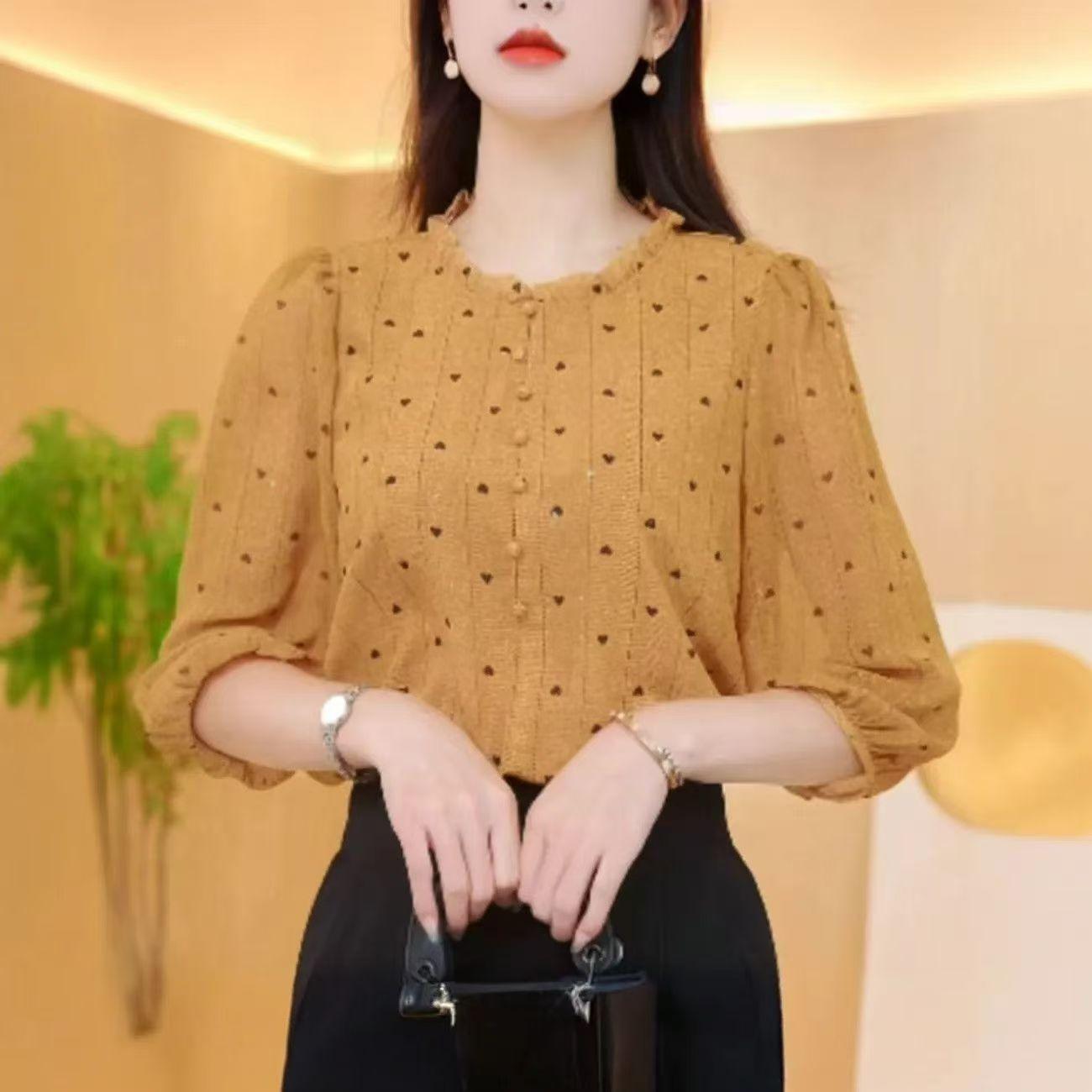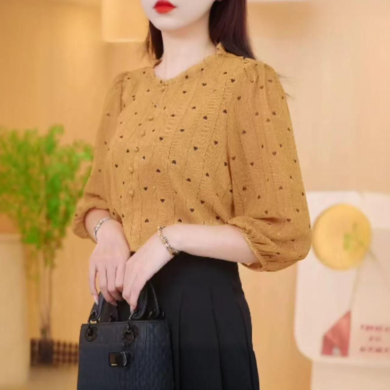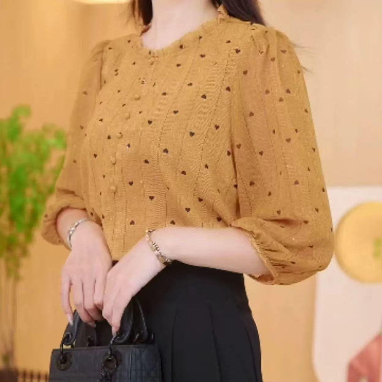 Camisa de Corazón a la Moda para Mujer 2025 Verano Nuevo Temperamento Elegante Moda Suelta Adelgazante Top de Siete Mangas