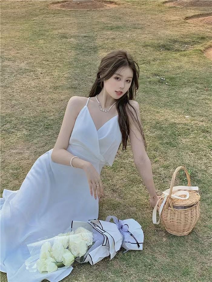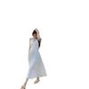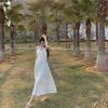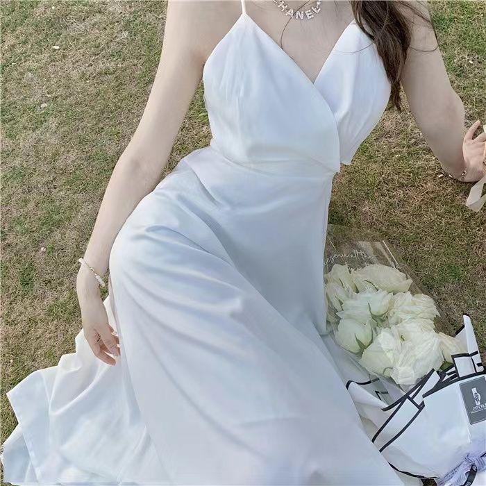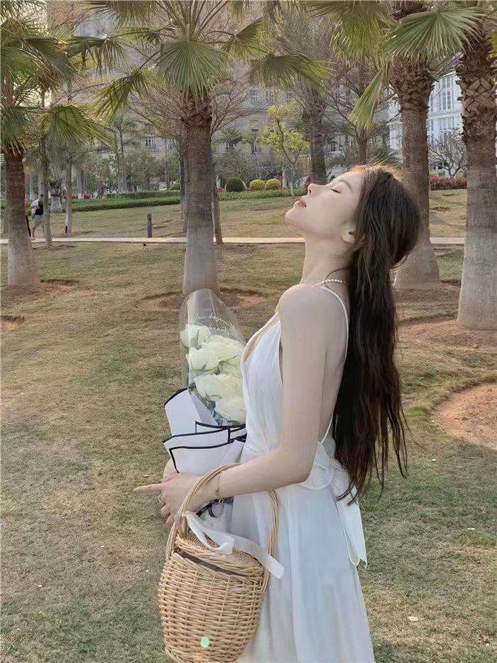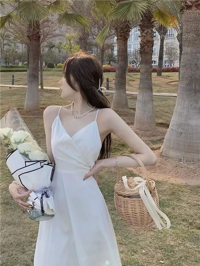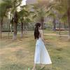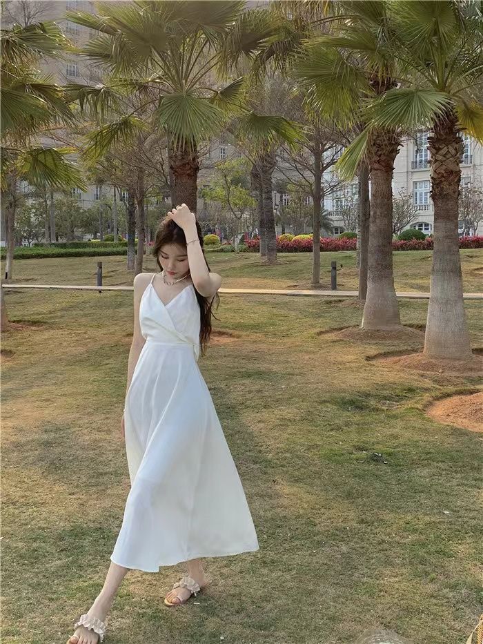 Vestido Vacacional Junto al Mar Verano Super Hada Ropa de Viaje Sanya Blanco Sexy Espalda Descubierta Falda de Tirantes Falda de Playa para Mujer