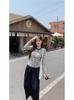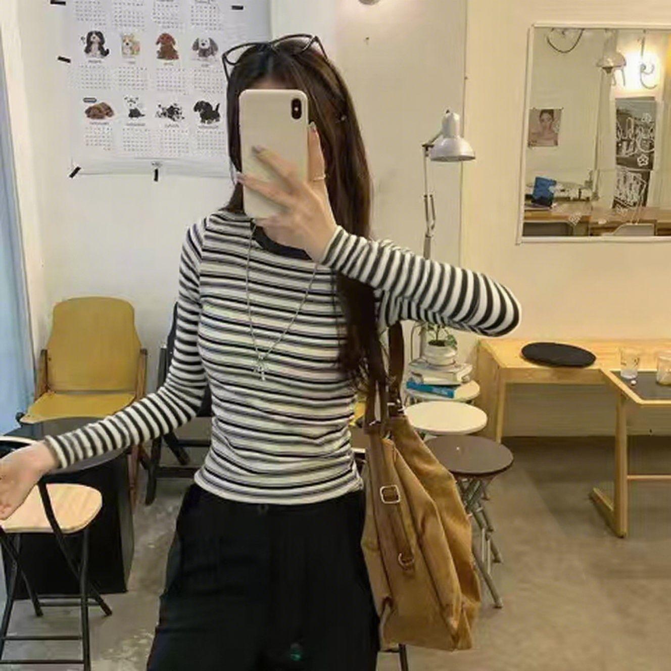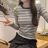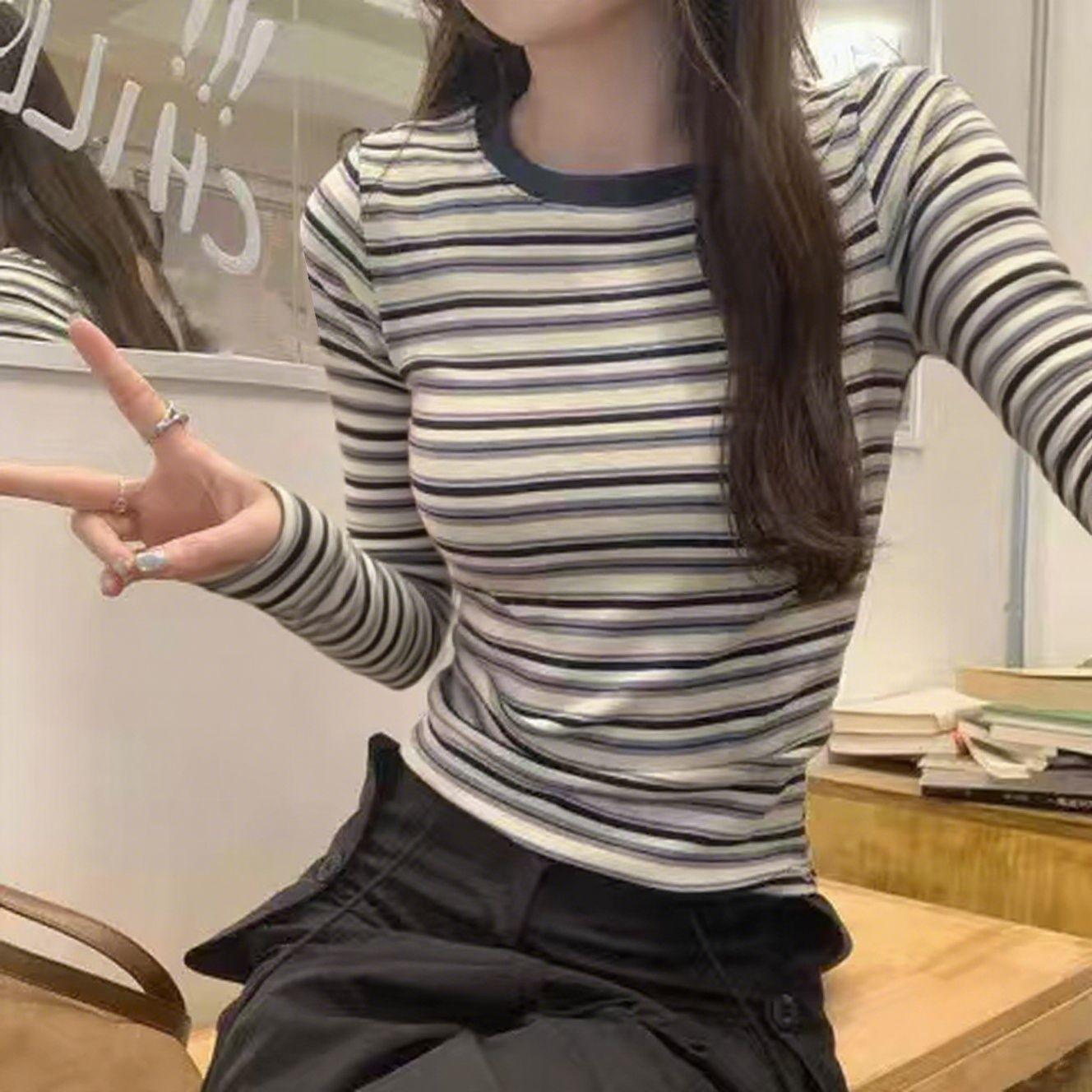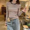 Compra Camiseta de Manga Larga para Mujer Estilo Americano Cuello Redondo Bloque de Color Rayas Primavera Otoño 2025 Nueva Retro ins Top Adelgazante al por mayor en Joom.pro