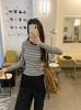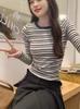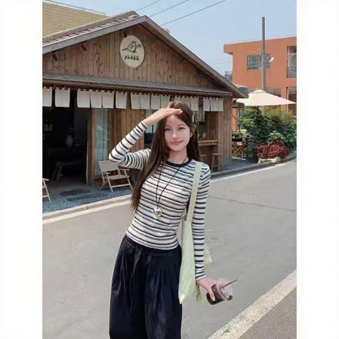 Camiseta de Manga Larga para Mujer Estilo Americano Cuello Redondo Bloque de Color Rayas Primavera Otoño 2025 Nueva Retro ins Top Adelgazante