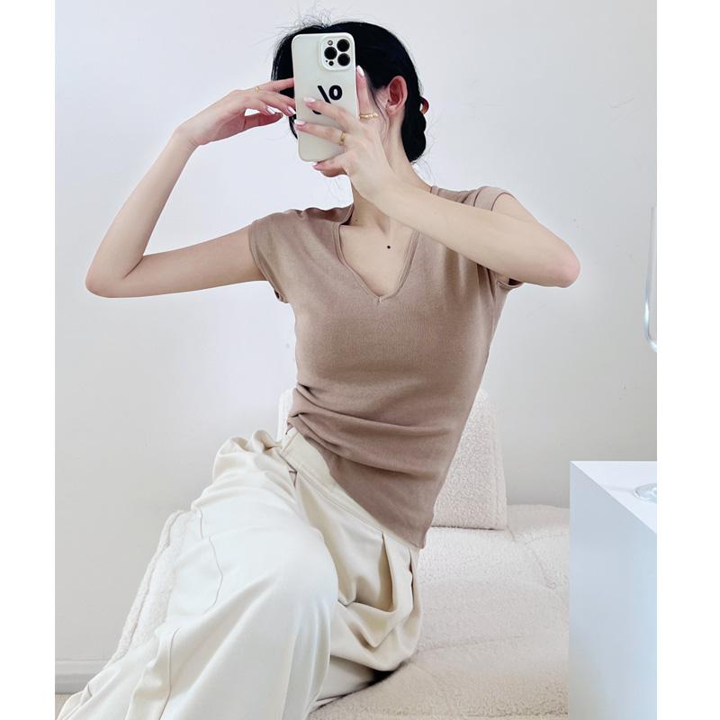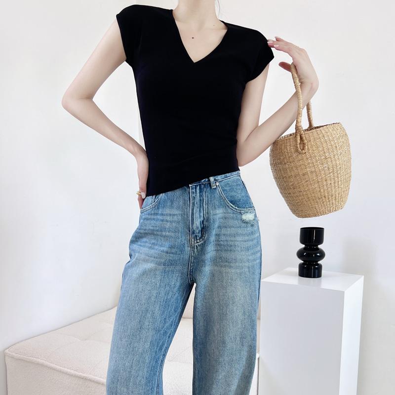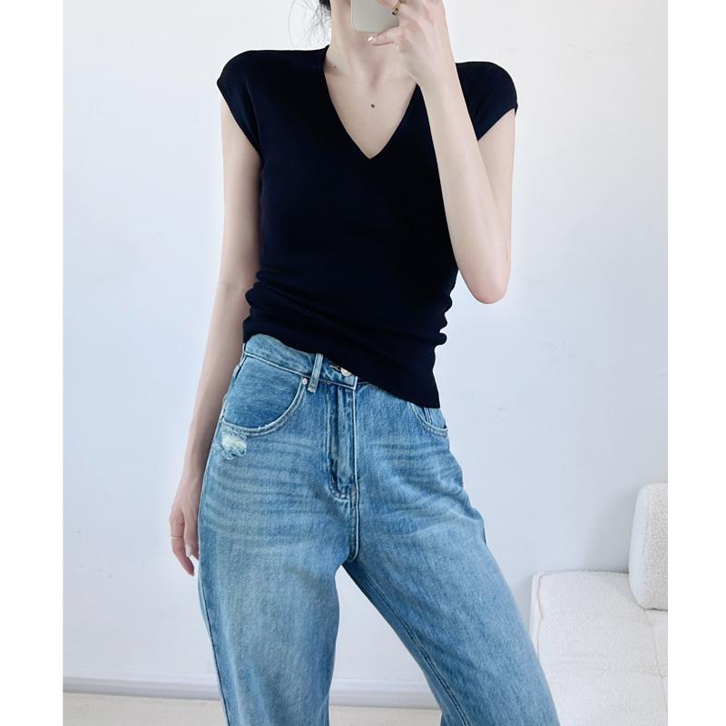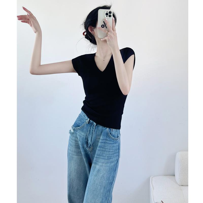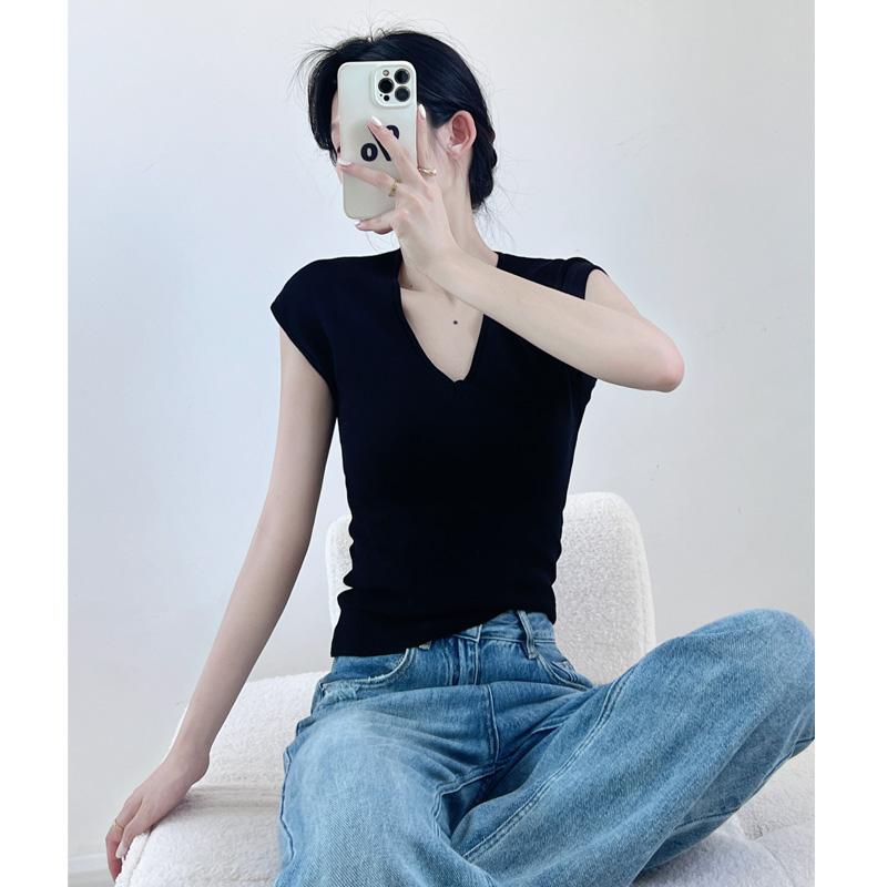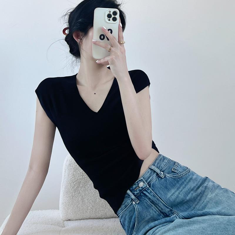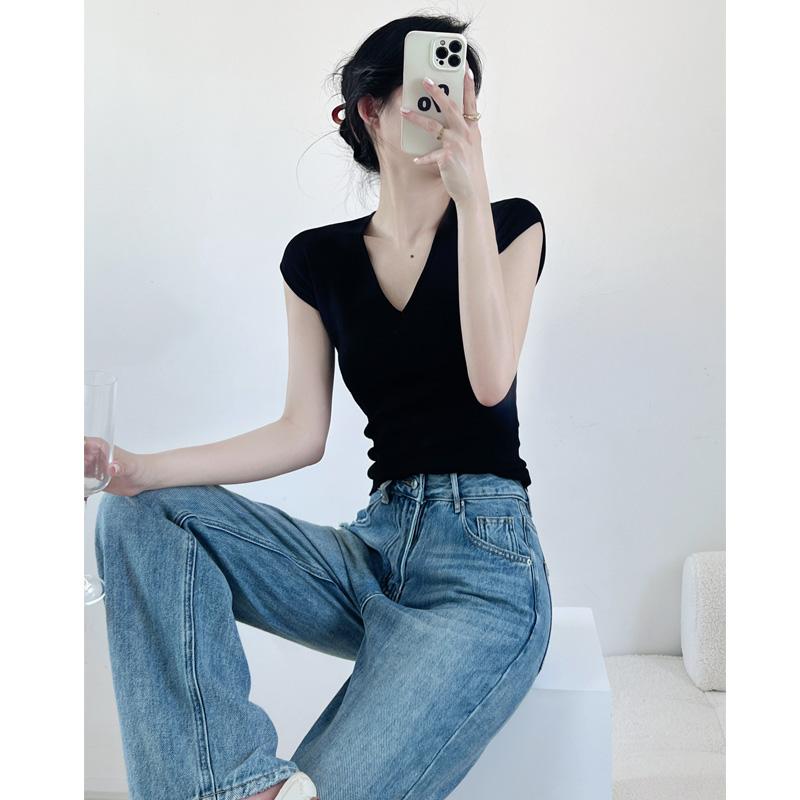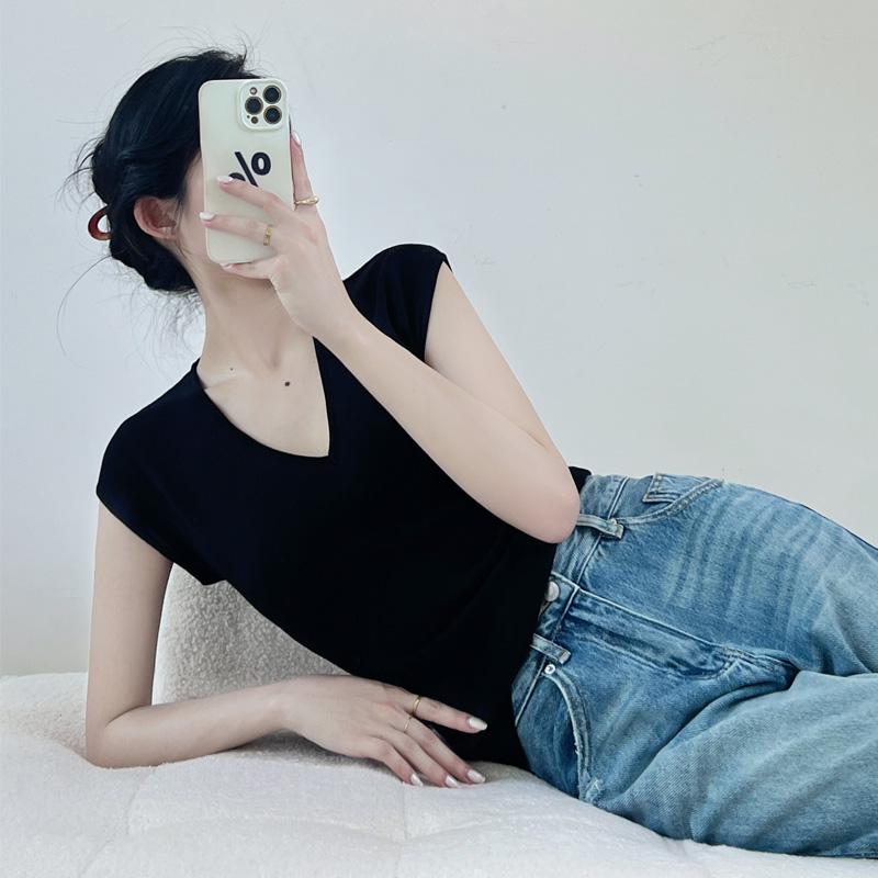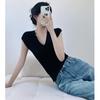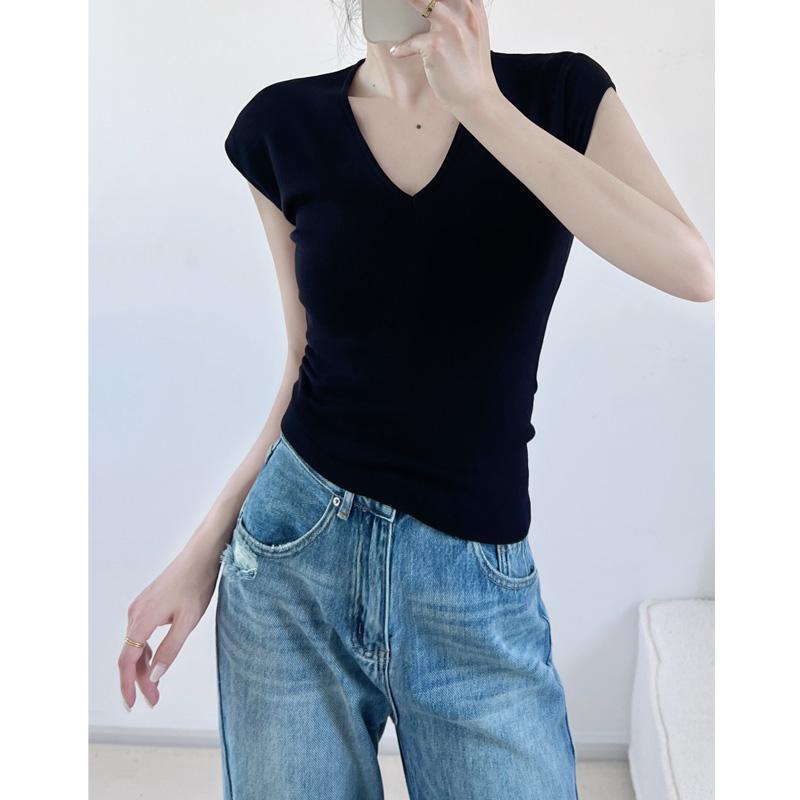 Verano Nueva Camiseta Slim de Manga Corta con Cuello en V Negra Tops Sexy Europeos y Americanos Hombro Derecho Tops Tejidos de Seda de Hielo para Mujer