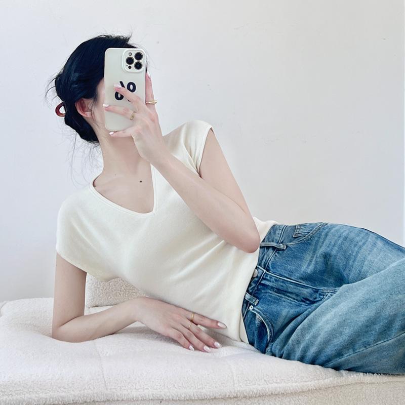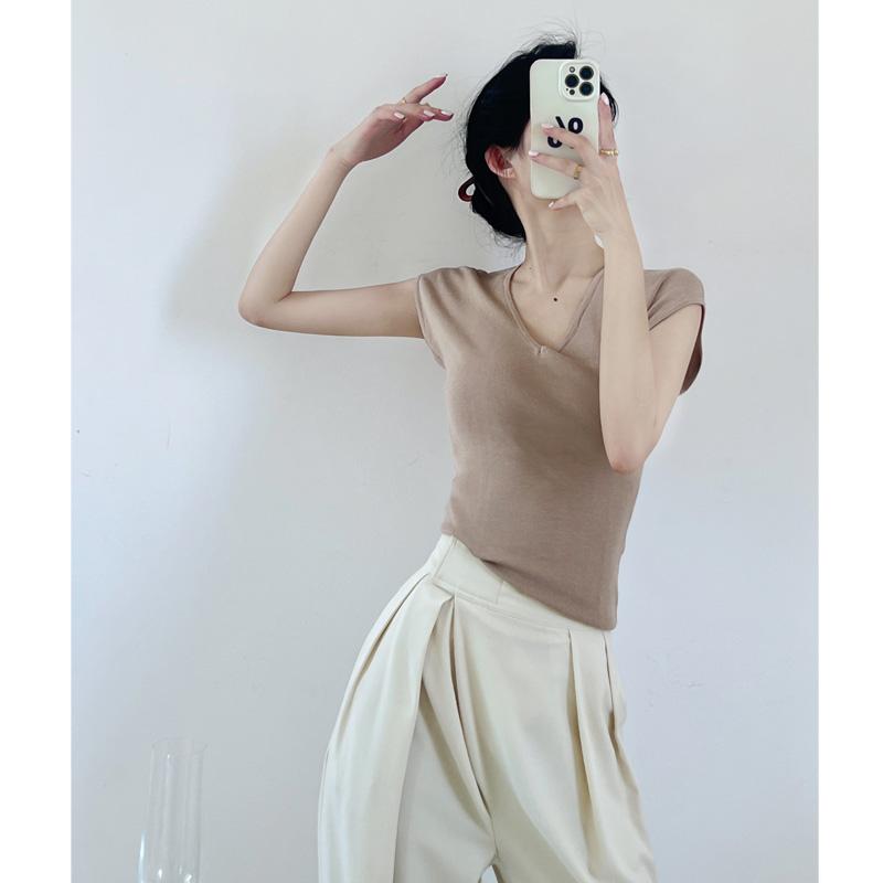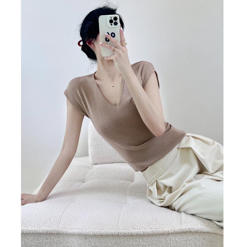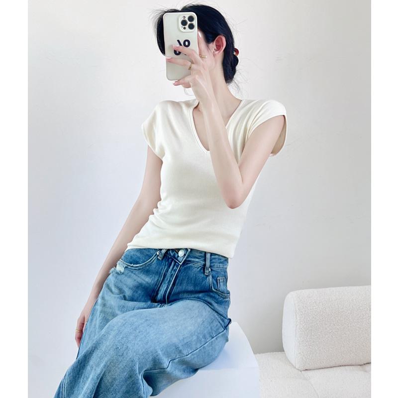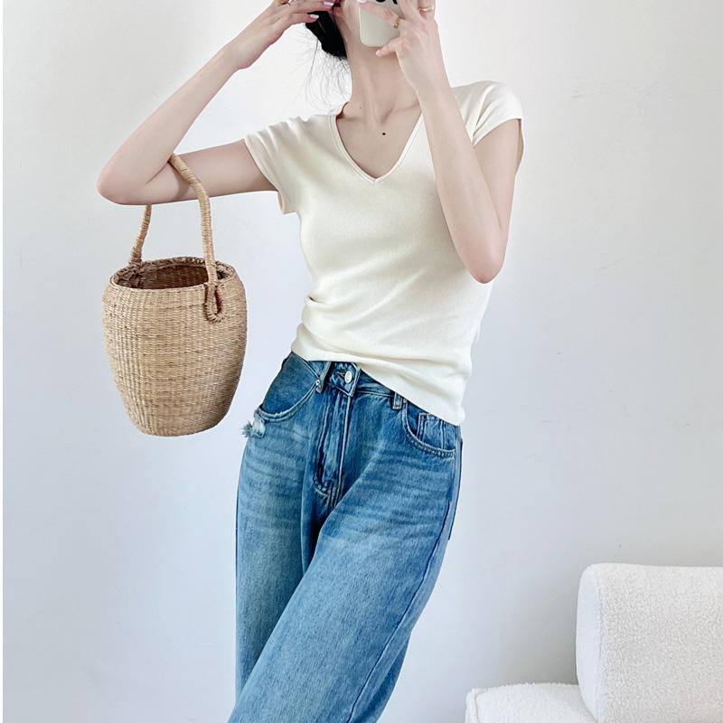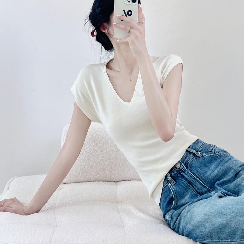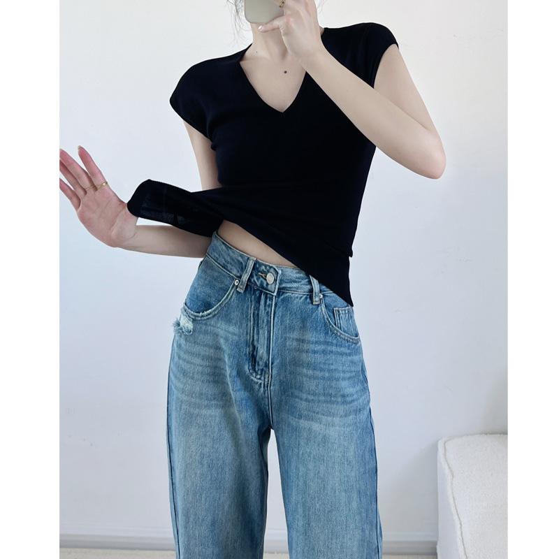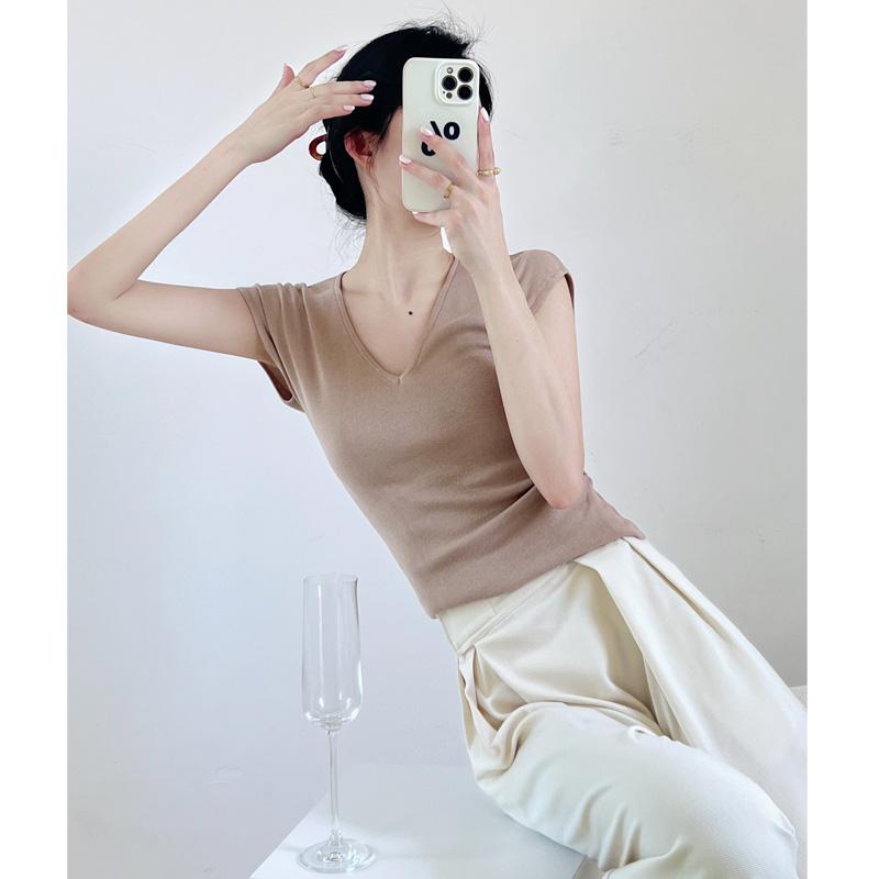 Verano Nueva Camiseta Slim de Manga Corta con Cuello en V Negra Tops Sexy Europeos y Americanos Hombro Derecho Tops Tejidos de Seda de Hielo para Mujer