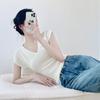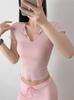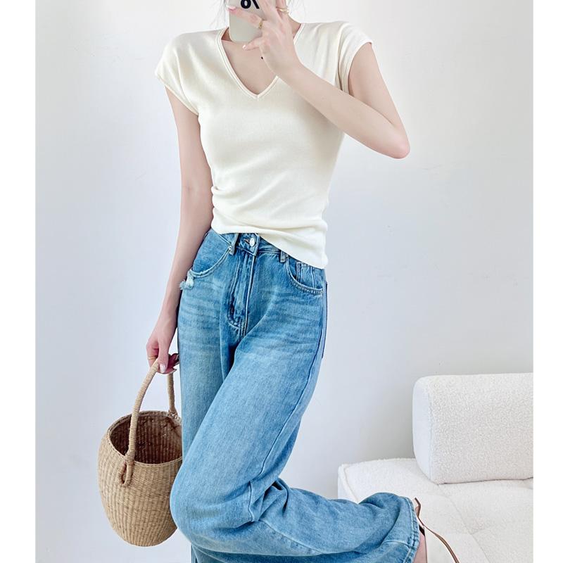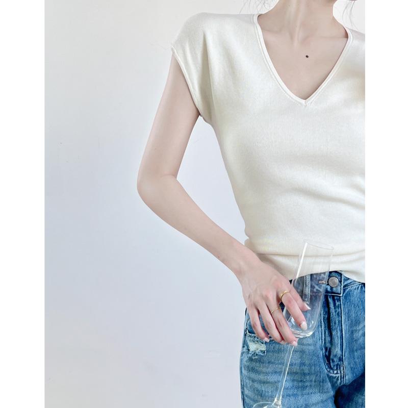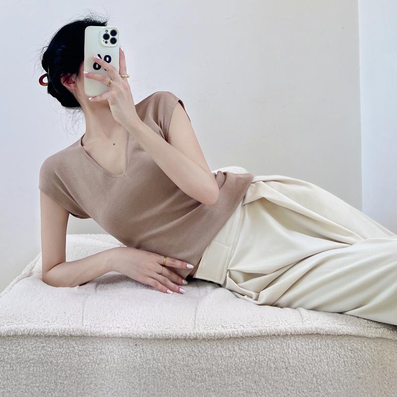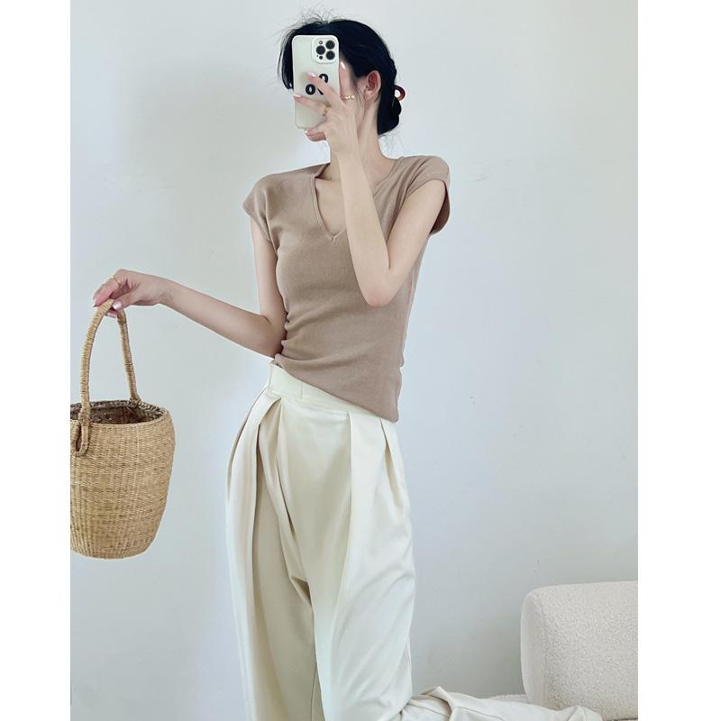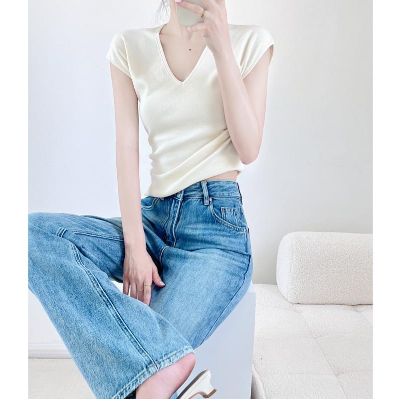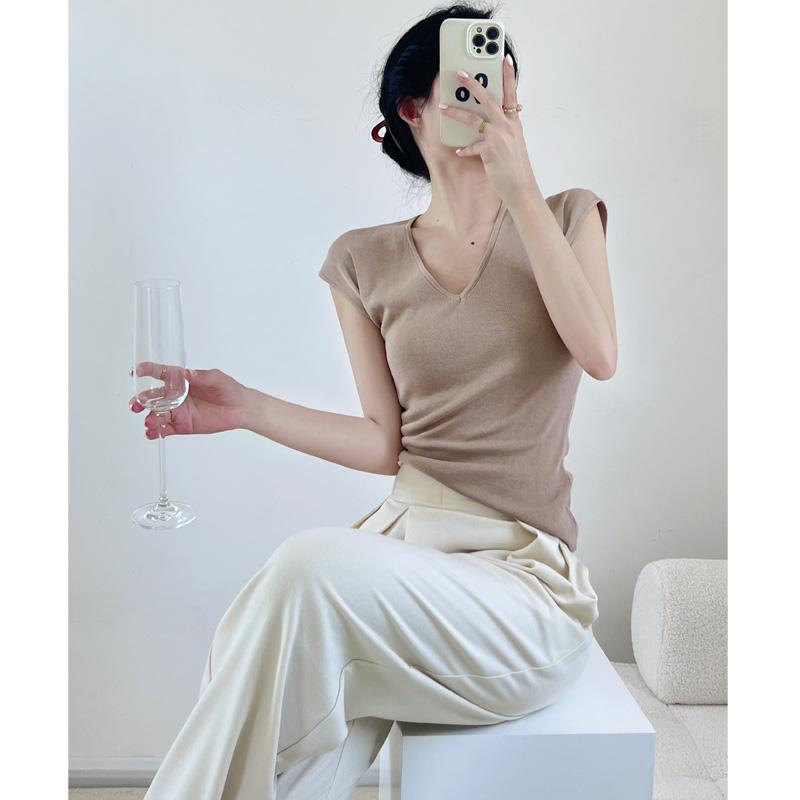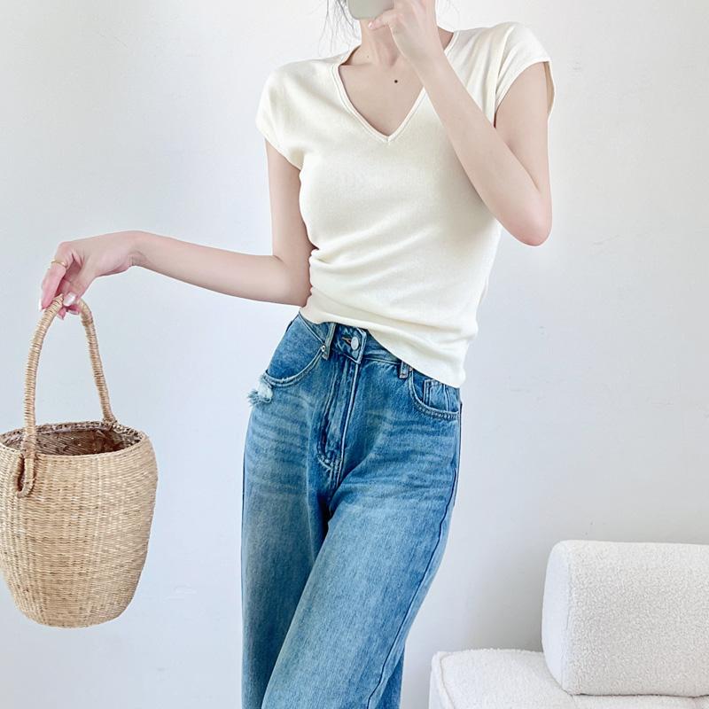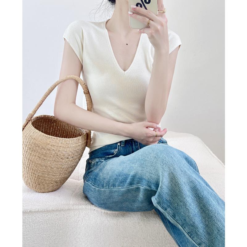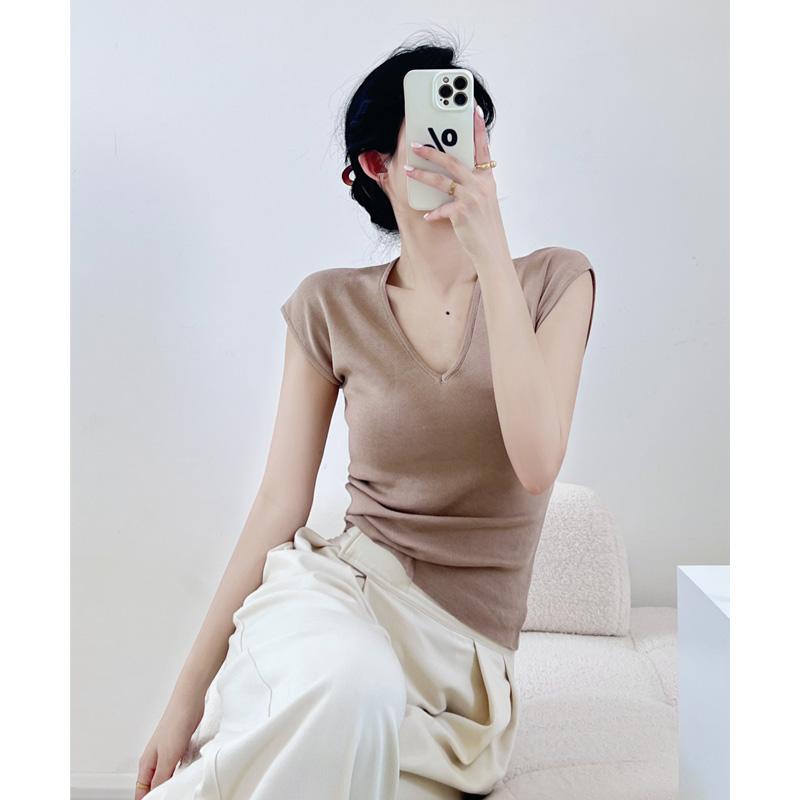 Verano Nueva Camiseta Slim de Manga Corta con Cuello en V Negra Tops Sexy Europeos y Americanos Hombro Derecho Tops Tejidos de Seda de Hielo para Mujer