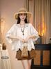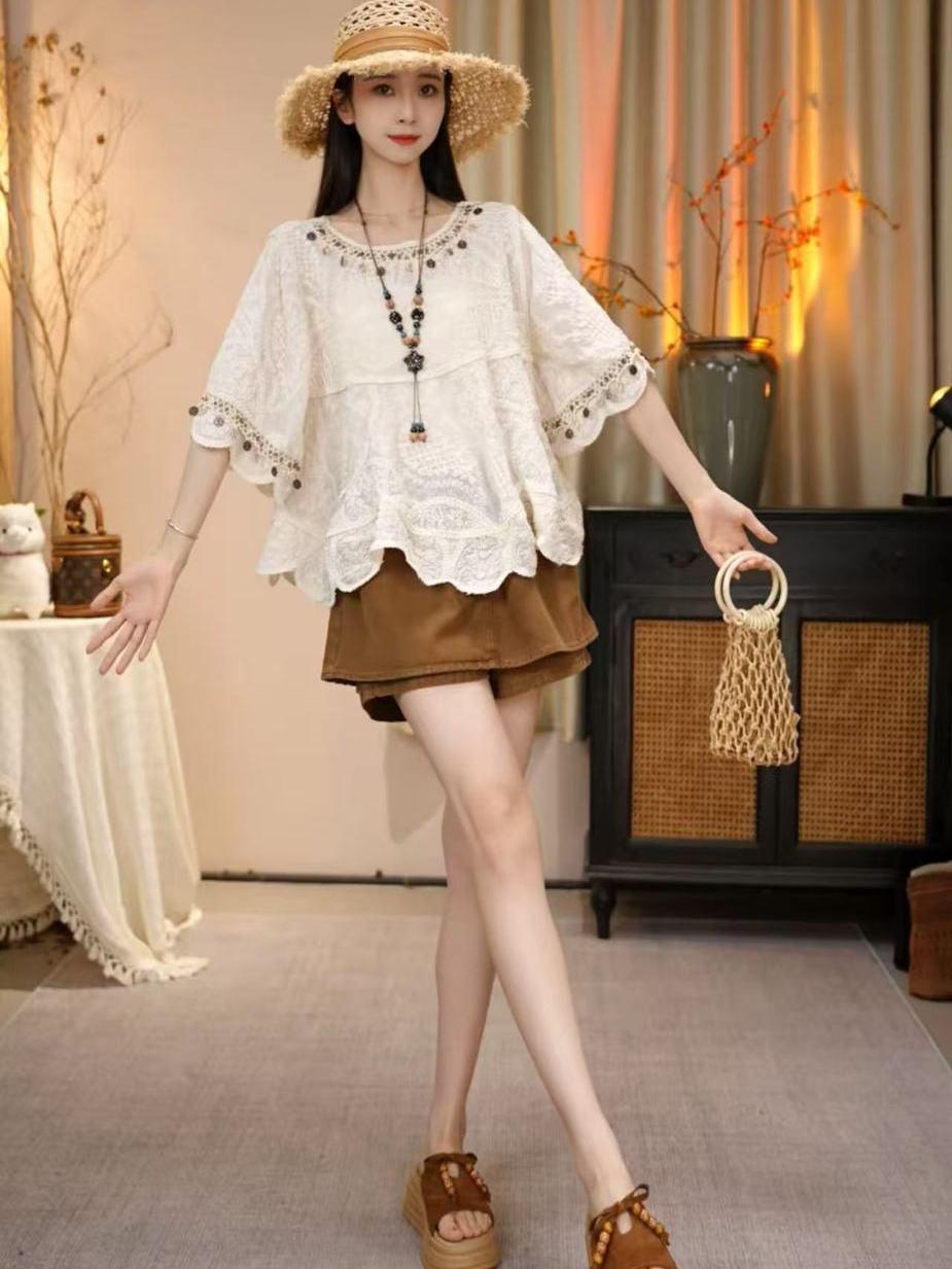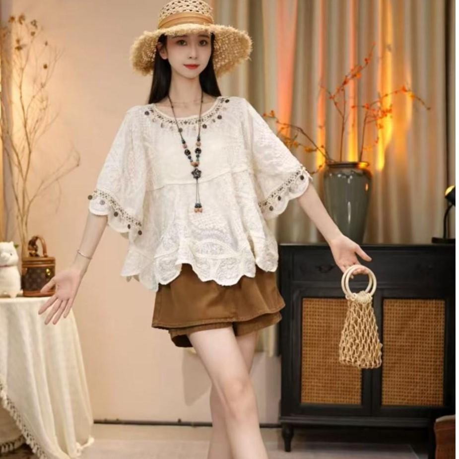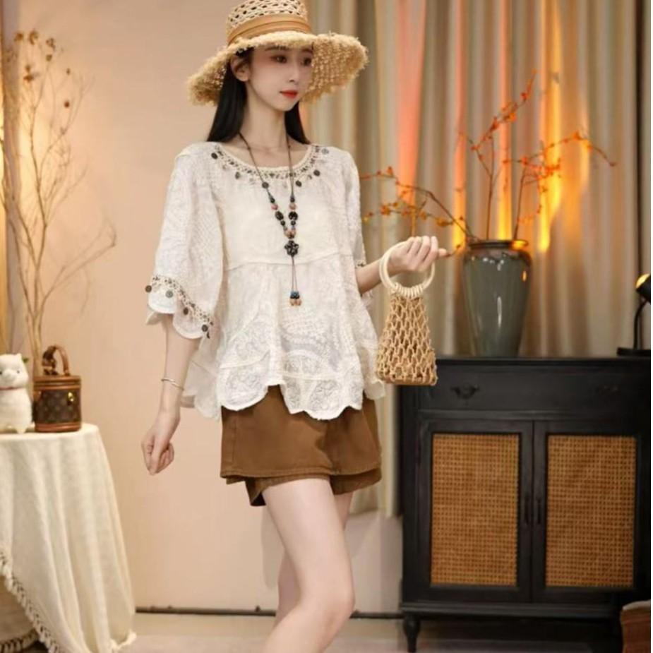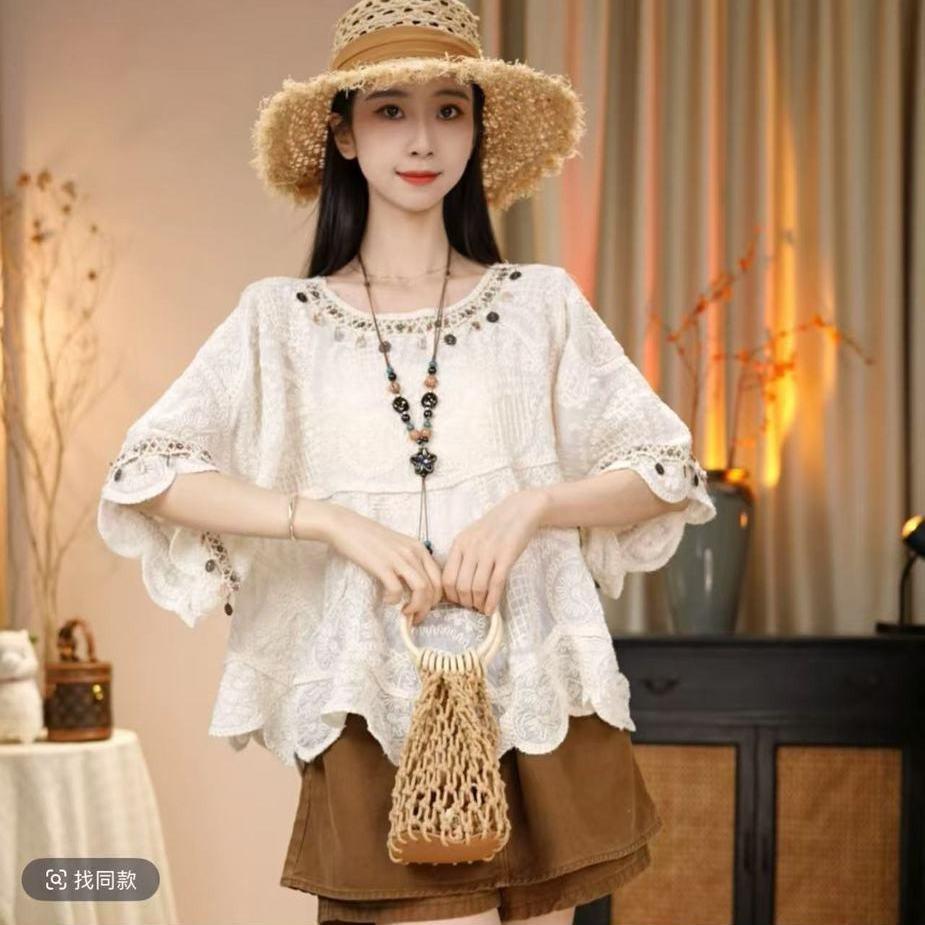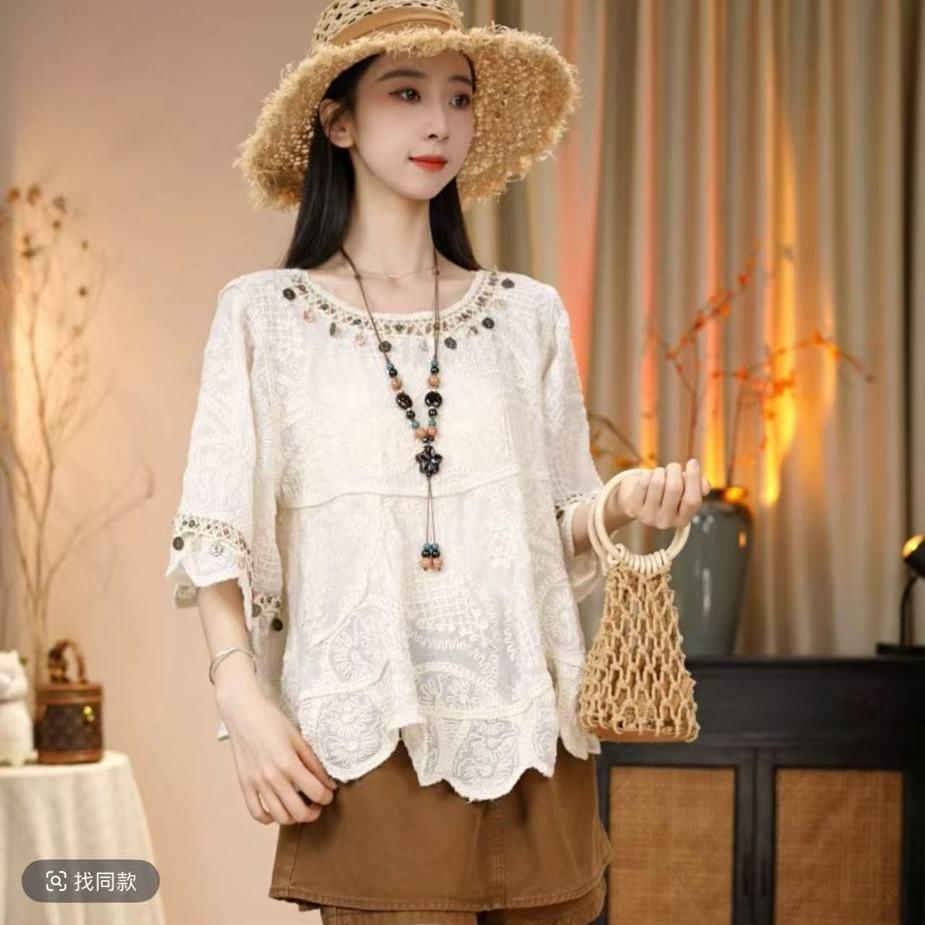 Verano 2025 Nuevo Camisa Francesa Retro con Encaje Empalmado Cuello Redondo para Mujer Diseño Sensorial Holgada Adelgazante Versátil Top