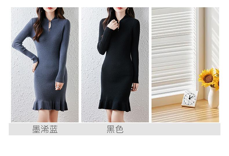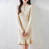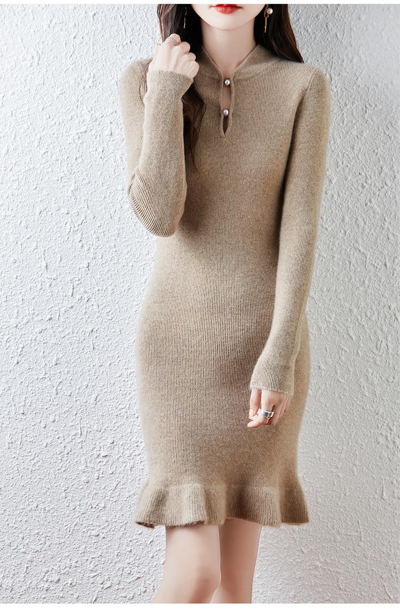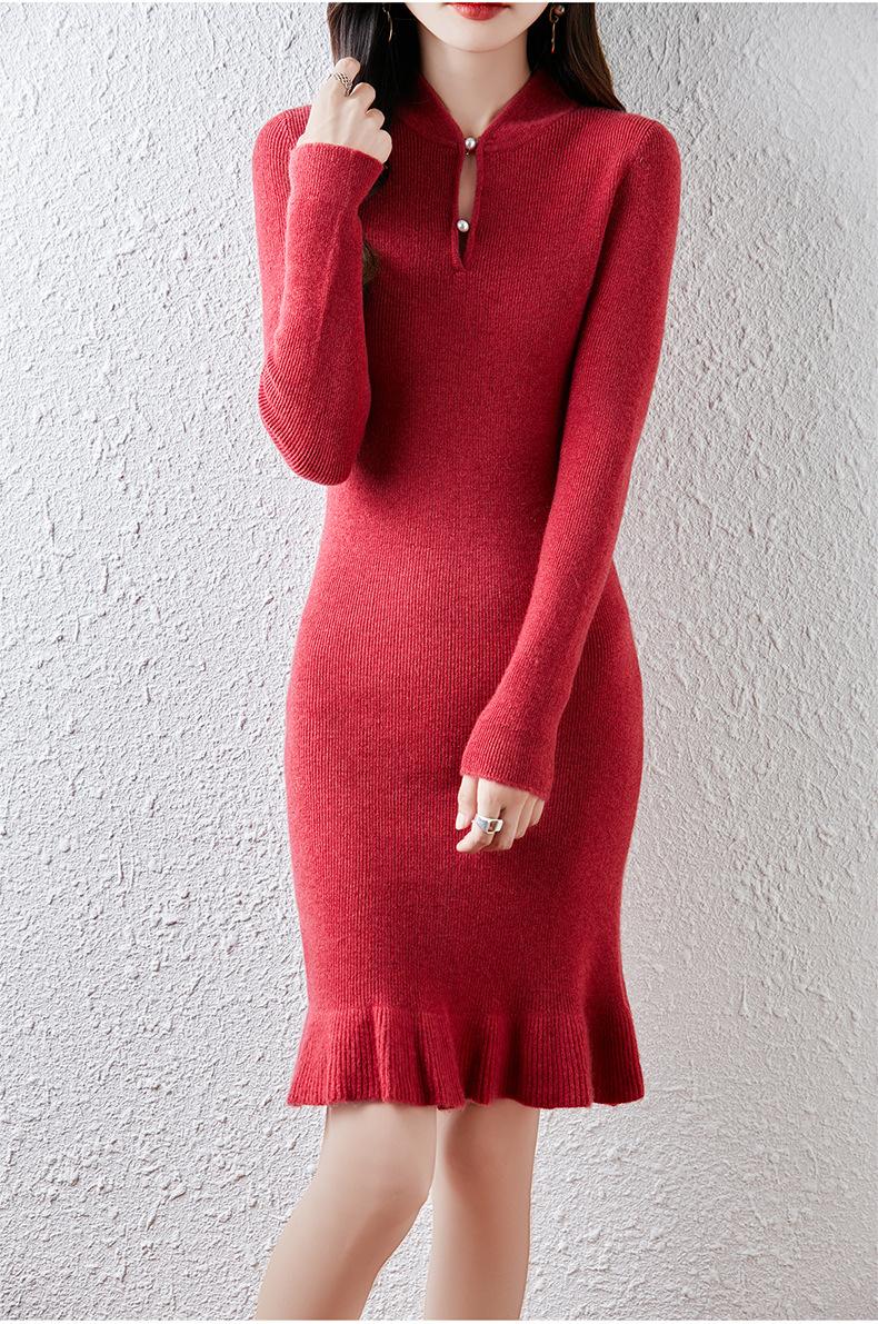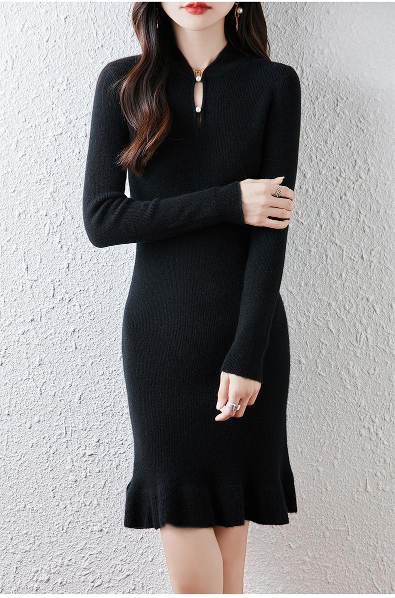 Vestido de Punto para Mujer de Lana 100% Pura con Cuello Alto Diseño de Estilo Nacional Chino Adelgazante Falda Corta de Cola de Pez Media