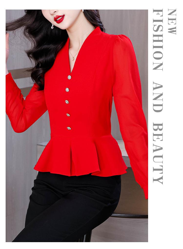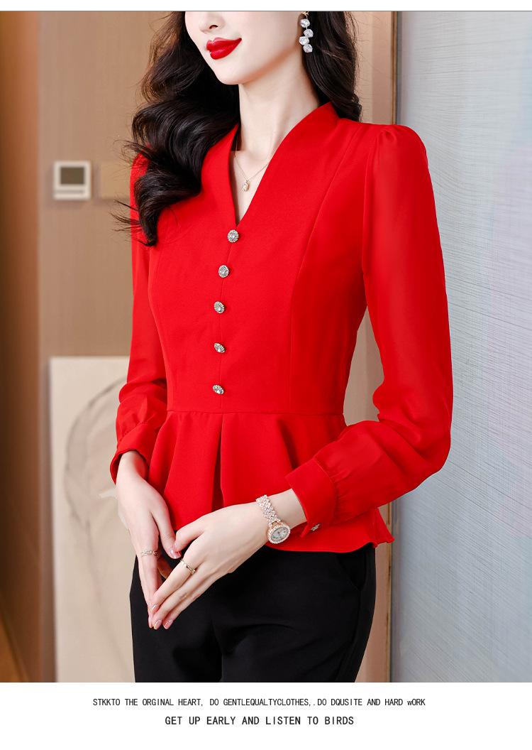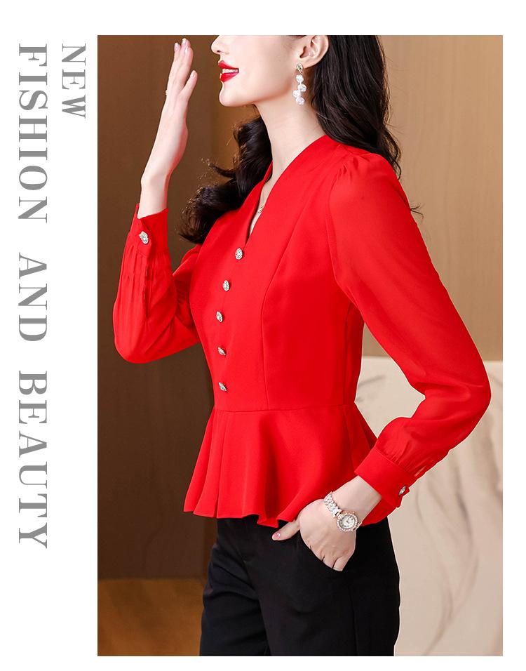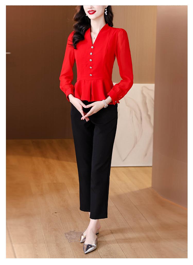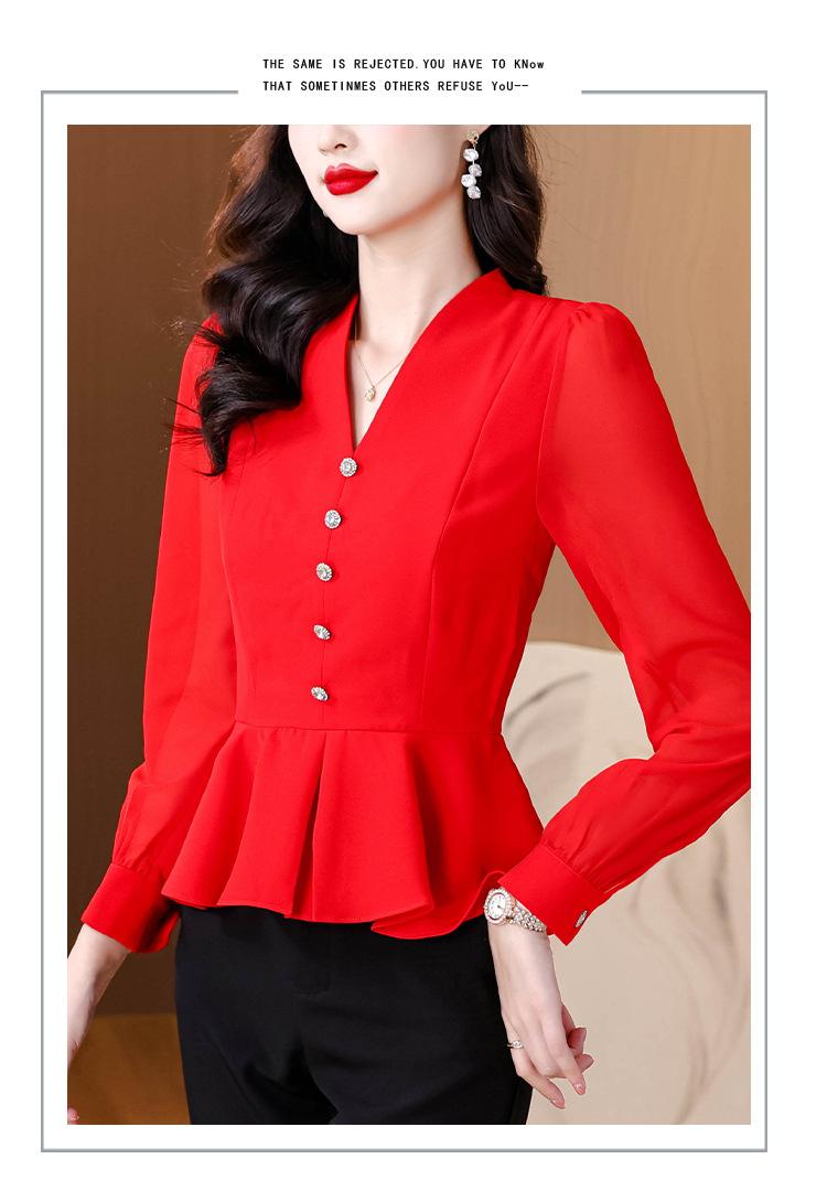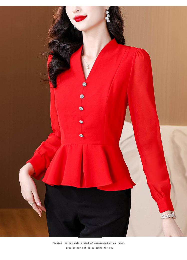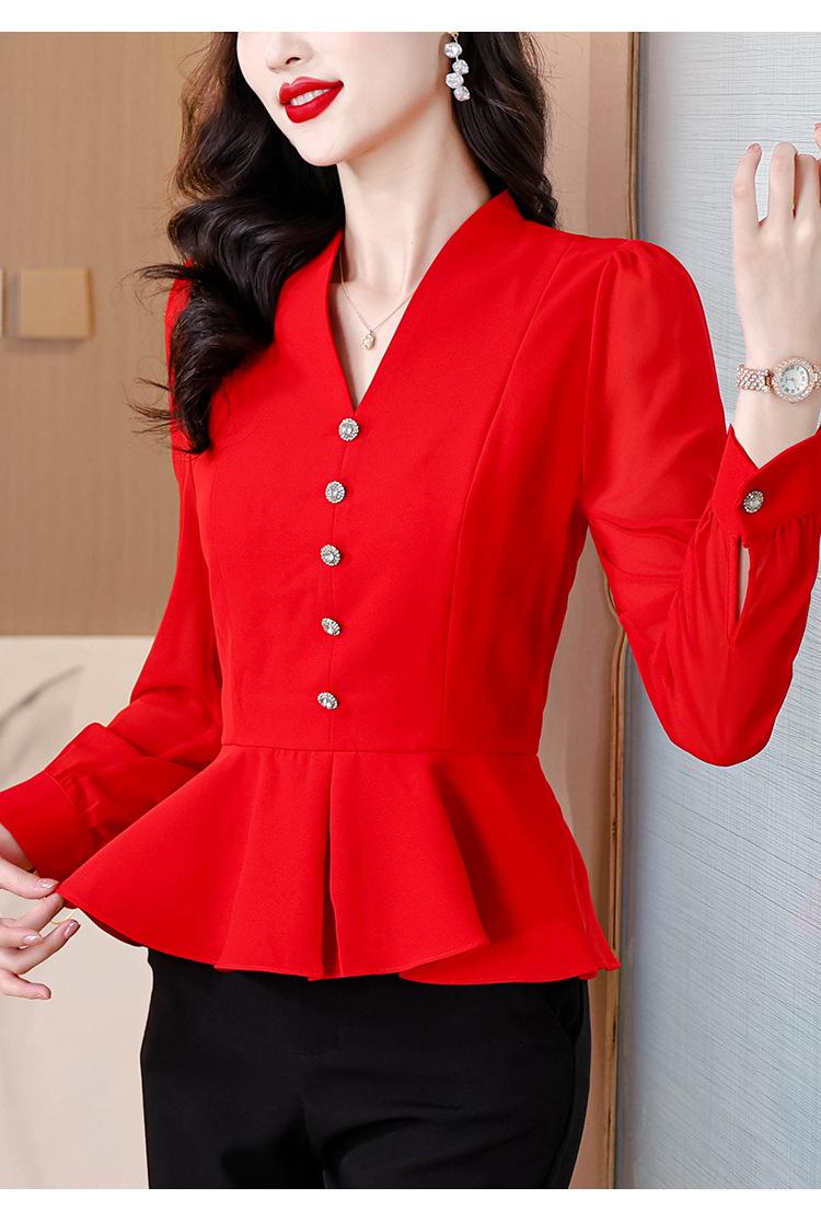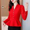 Camisa Roja de Manga Larga Adelgazante de Moda para Mujer Otoño Nueva Temperamento Cuello en V Blusa Elegante Mamá Top con Dobladillo Acampanado